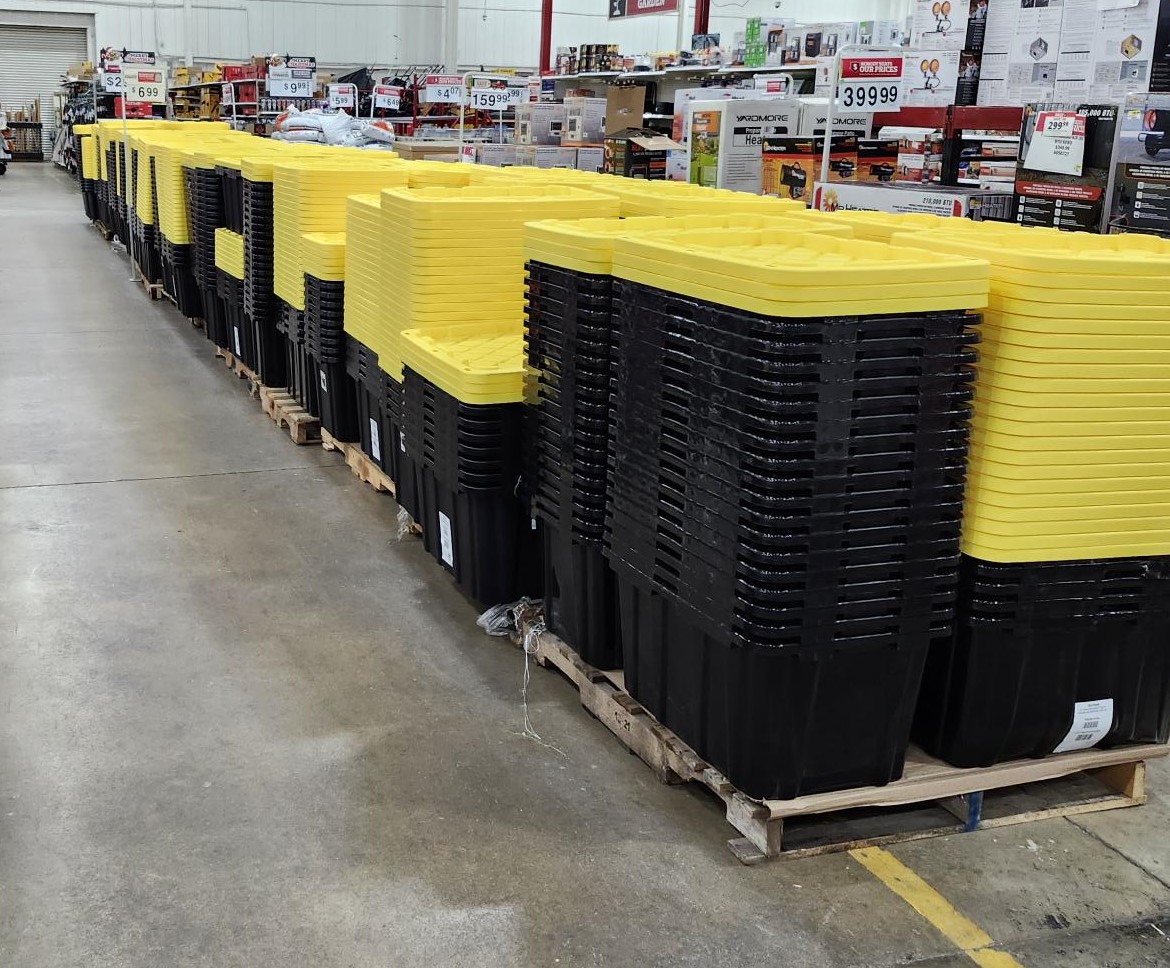 I remember reading somewhere that they claim they are made in the USA. Also important to note that you can’t mix Lowes and Home Depot storage totes as they are slightly different sizes so they won’t stack!