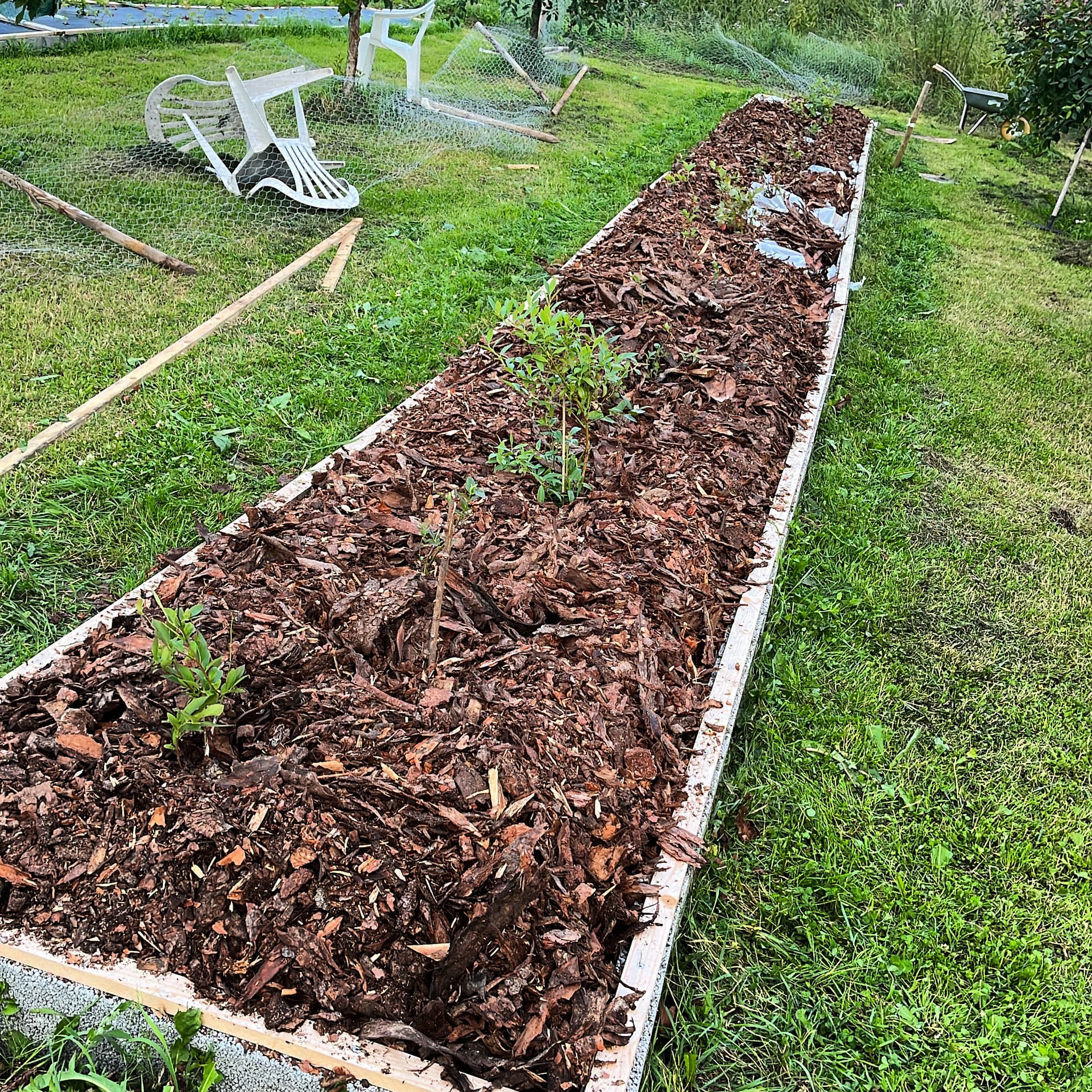 The bushes have been kicking ass. Plants that were 6-8" in April are 2ā x 2ā now. Going forward, I think Iāll only have to (1) add occasional fertilizer, (2) periodically refresh the chips as mulch, and (3) water only during dry spells.