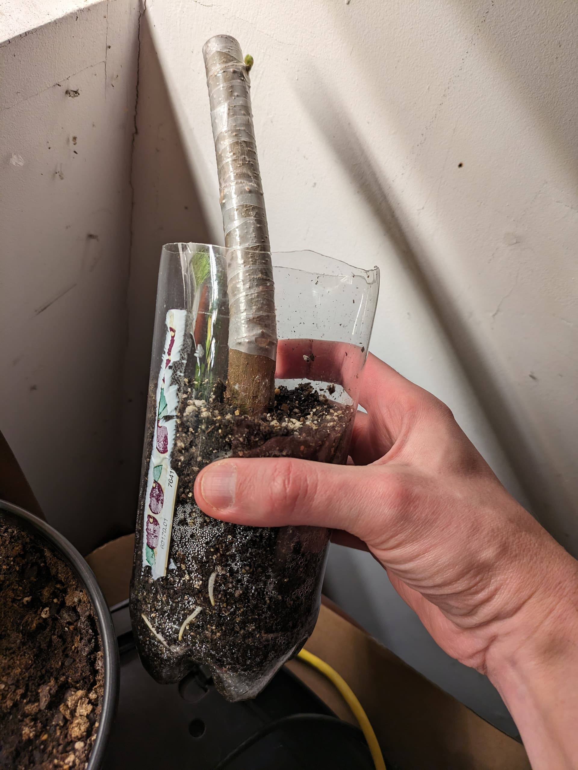 I’m starting two Chicago Hardy trees for friends and they finally are showing roots a day or two after pushing buds. Took about a month. My plan is for them to live under a grow light/on a window sill until April. Pot them up once they have more roots showing but before it’s a loopy mess.