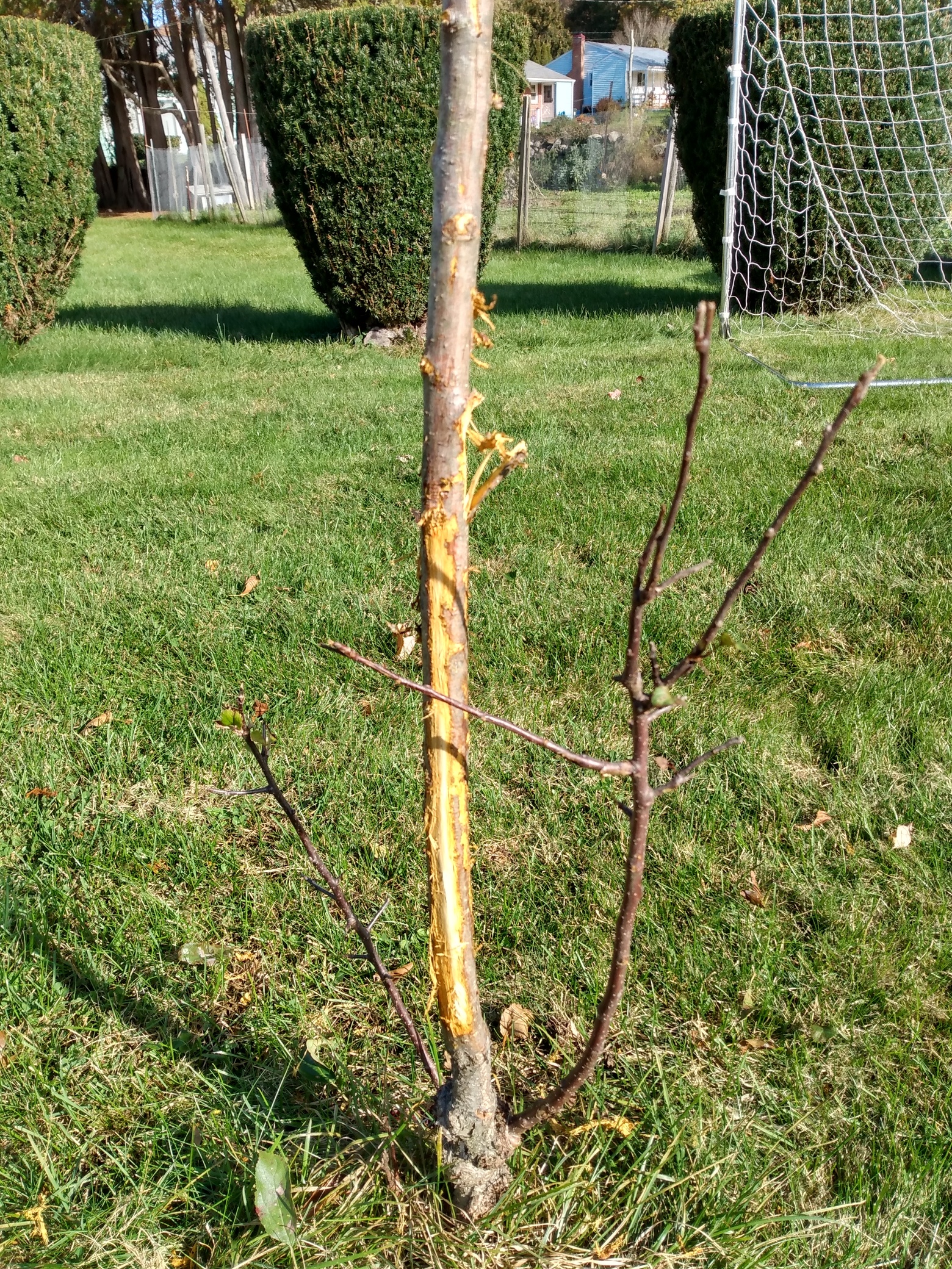 I hope so. Seems like SO MUCH of the bark is gone and they took a chunk out of part of the Hoople’s. Is there anything I should wrap them with to protect them over the winter? I was planning on just putting corrugated plastic around them to protect from rabbits and voles.