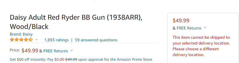 I just checked Amazon to see if there was a “loop hole”. I figured it was unlikely, and sure enough I cannot purchase a Red Ryder BB Gun from Amazon unless I have it shipped to another state.