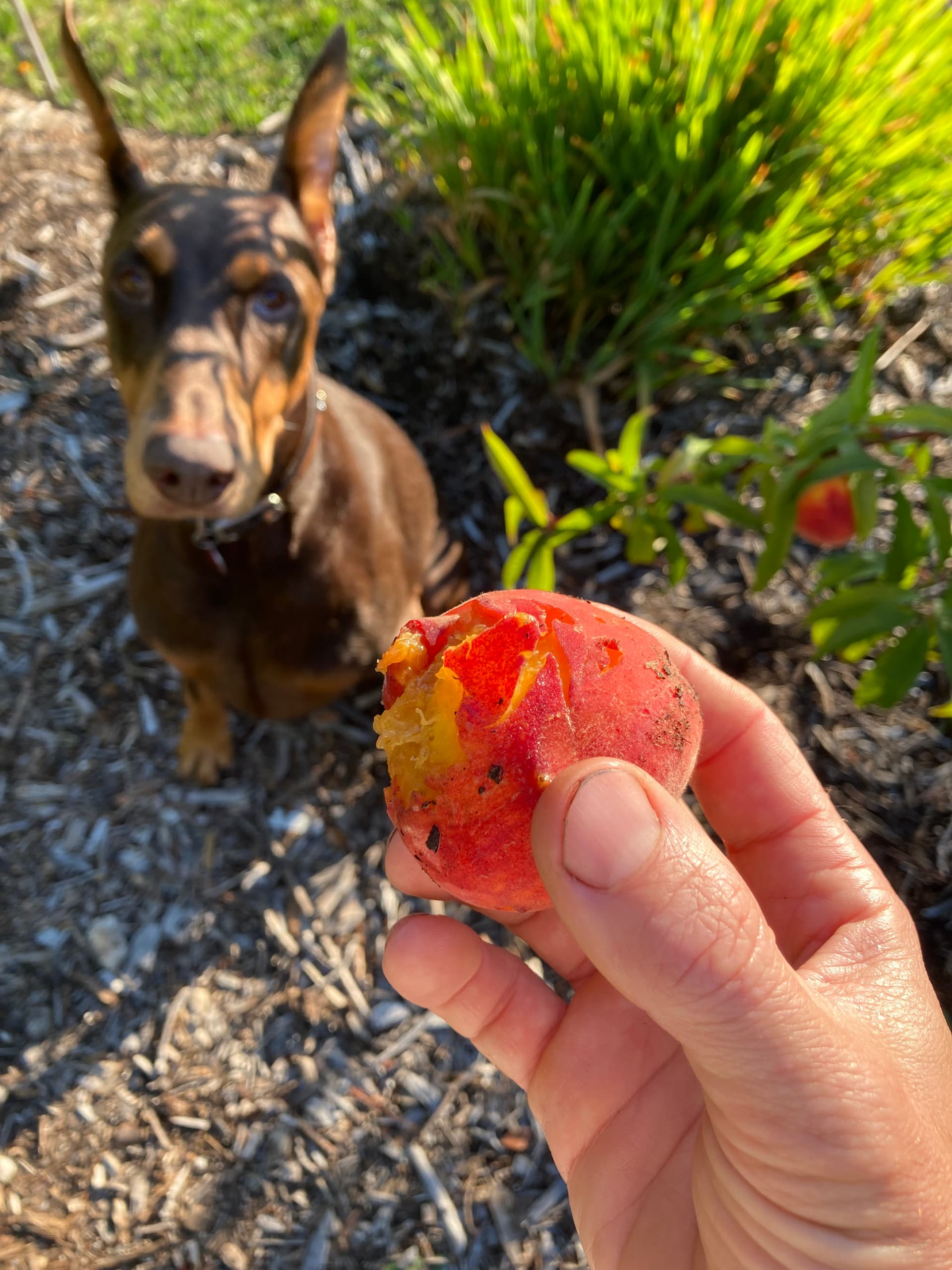 She’s really well-mannered but loves a ball, so I’ll give her the benefit of the doubt that she thought it was a ball tree. She has stripped a Jerusalem artichoke down to no leaves almost (it’s small) but if I catch her a simple no will stop her from whatever she’s doing. For now she receives blame for the peach haha but maybe it was a bird.