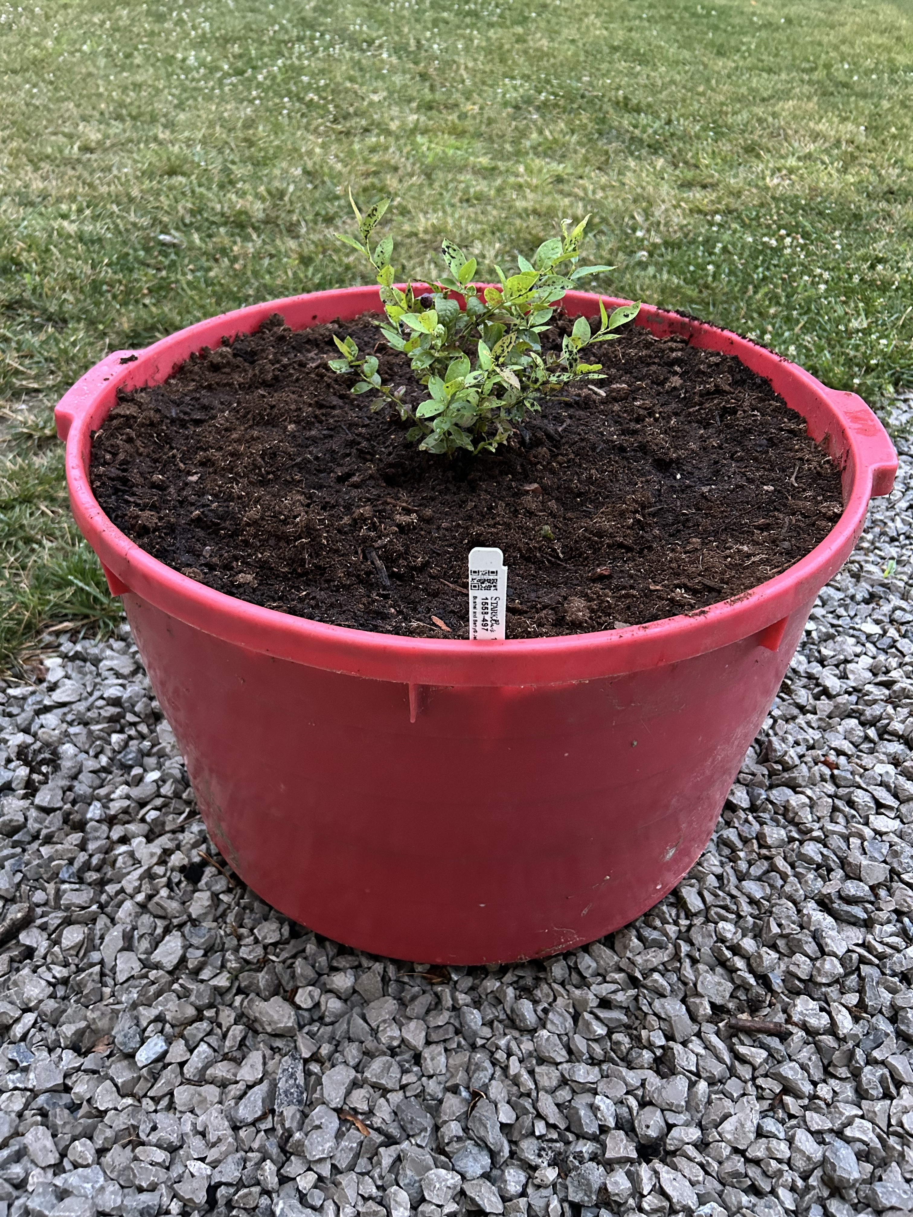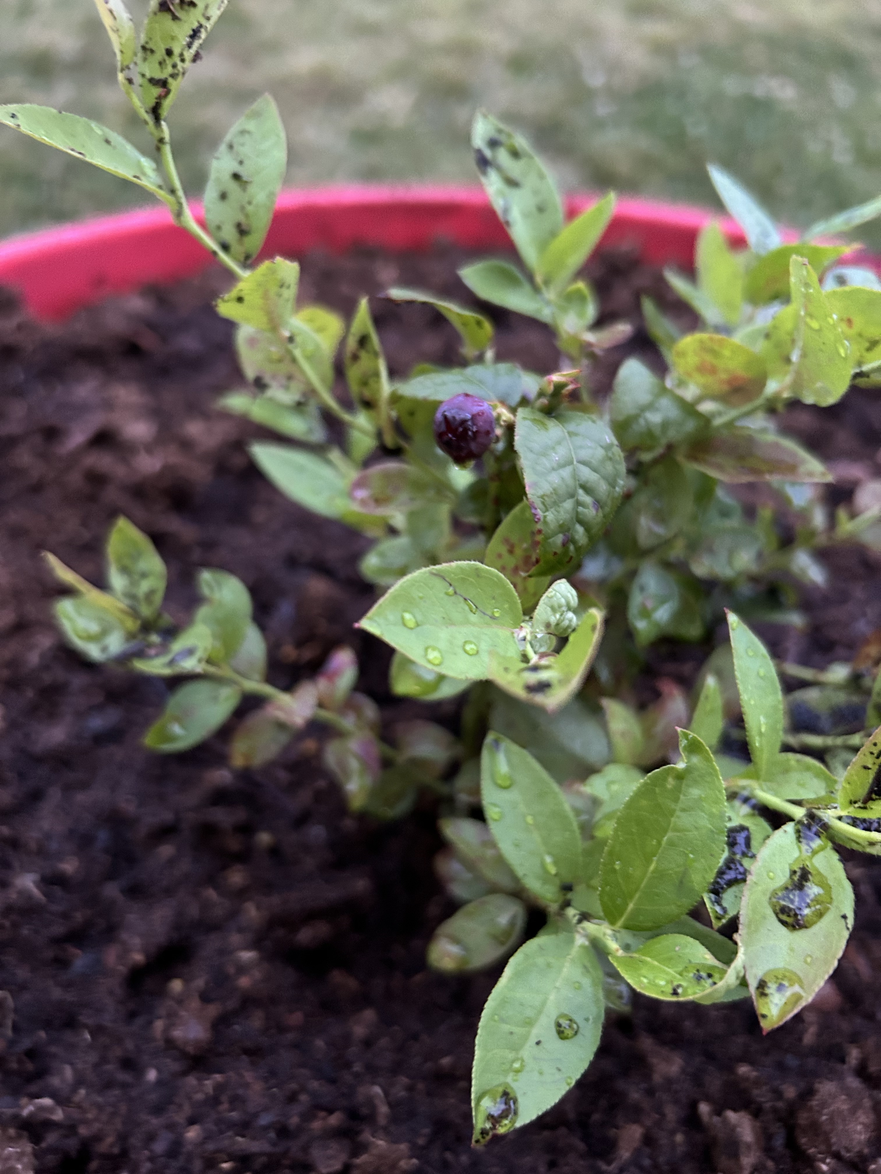 One blueberry on my Jelly Bean plant. I also up-potted it to a roughly 25 gallon old cattle feed tub. It has about 60% peat, 30% pine bark, and 10% potting mix.
