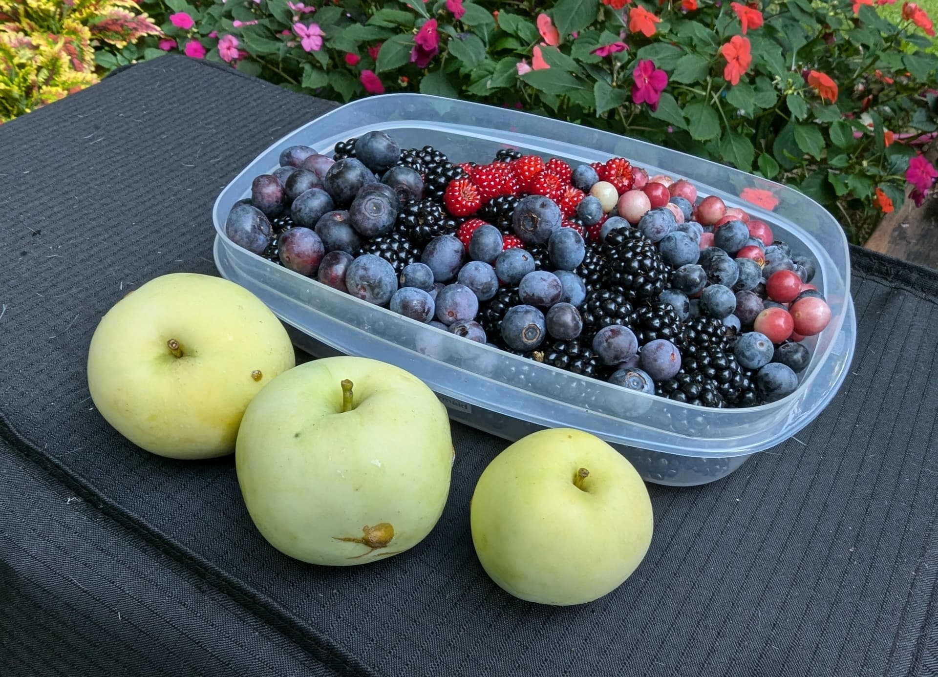 Probably 5 or so Arkansas thornless blackberry varieties, wineberries (starting to wind down), pink lemonade/titan/climax blueberries and a few others I don’t know the name of. “Horse” apples.