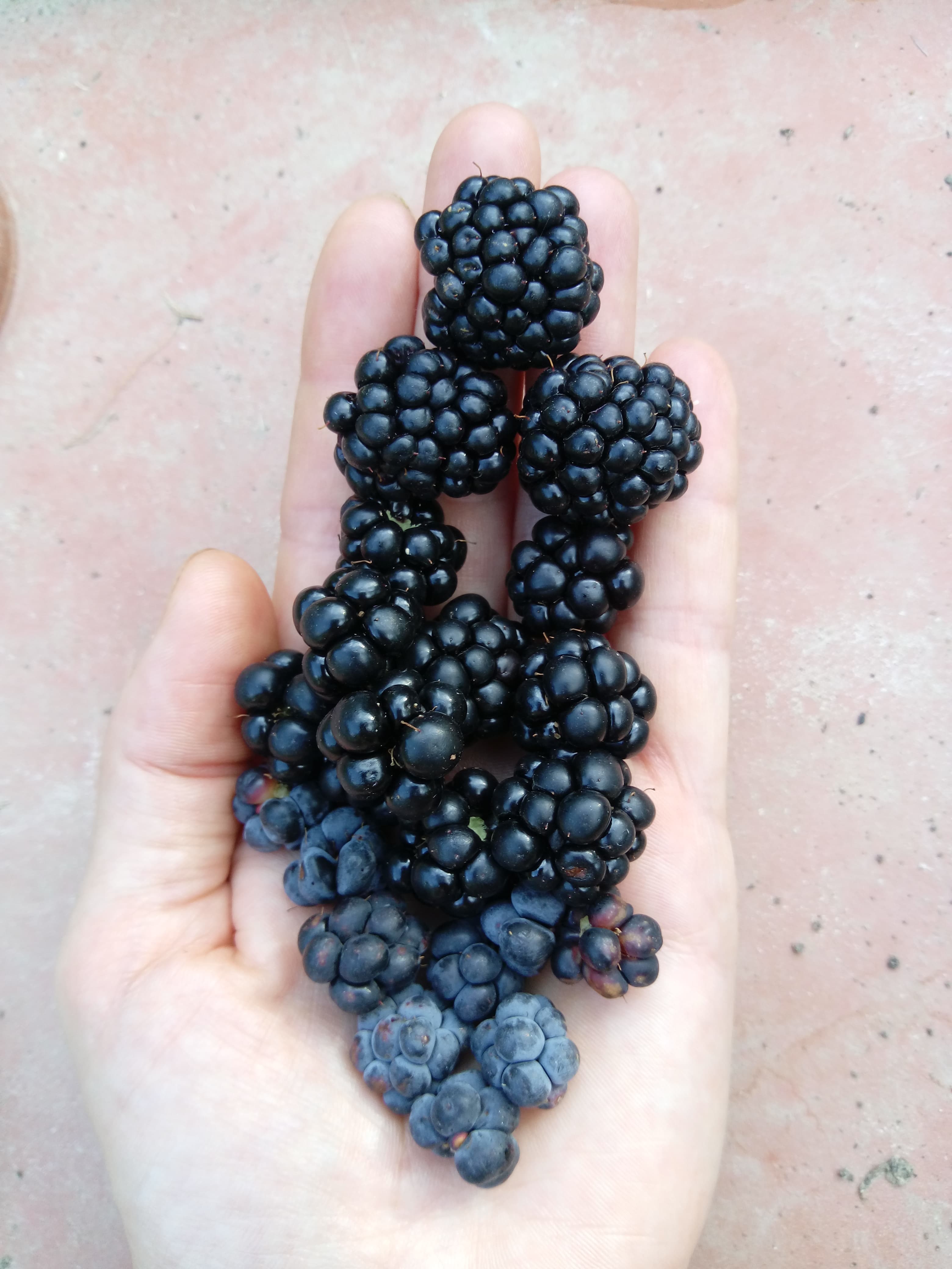 Top to bottom: 1st and smallish fruit of unknown variety of thornless blackberry (from way back when thornless was a variety), wild and very thorny blackberry and European dewberry which reminds me of childhood and railroad tracks. We have made a decission with the neighbour to let the dewberry grow on our shared fence. It is a mess, but that’s what you get when Northern forest foragers meet in the wine growing South…