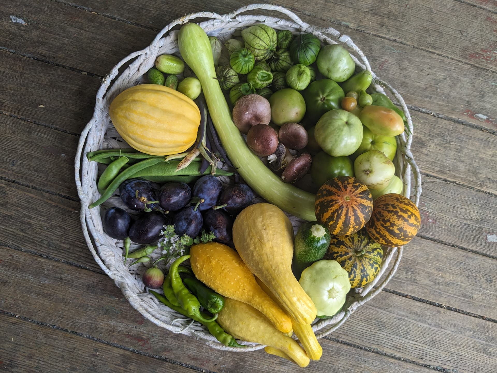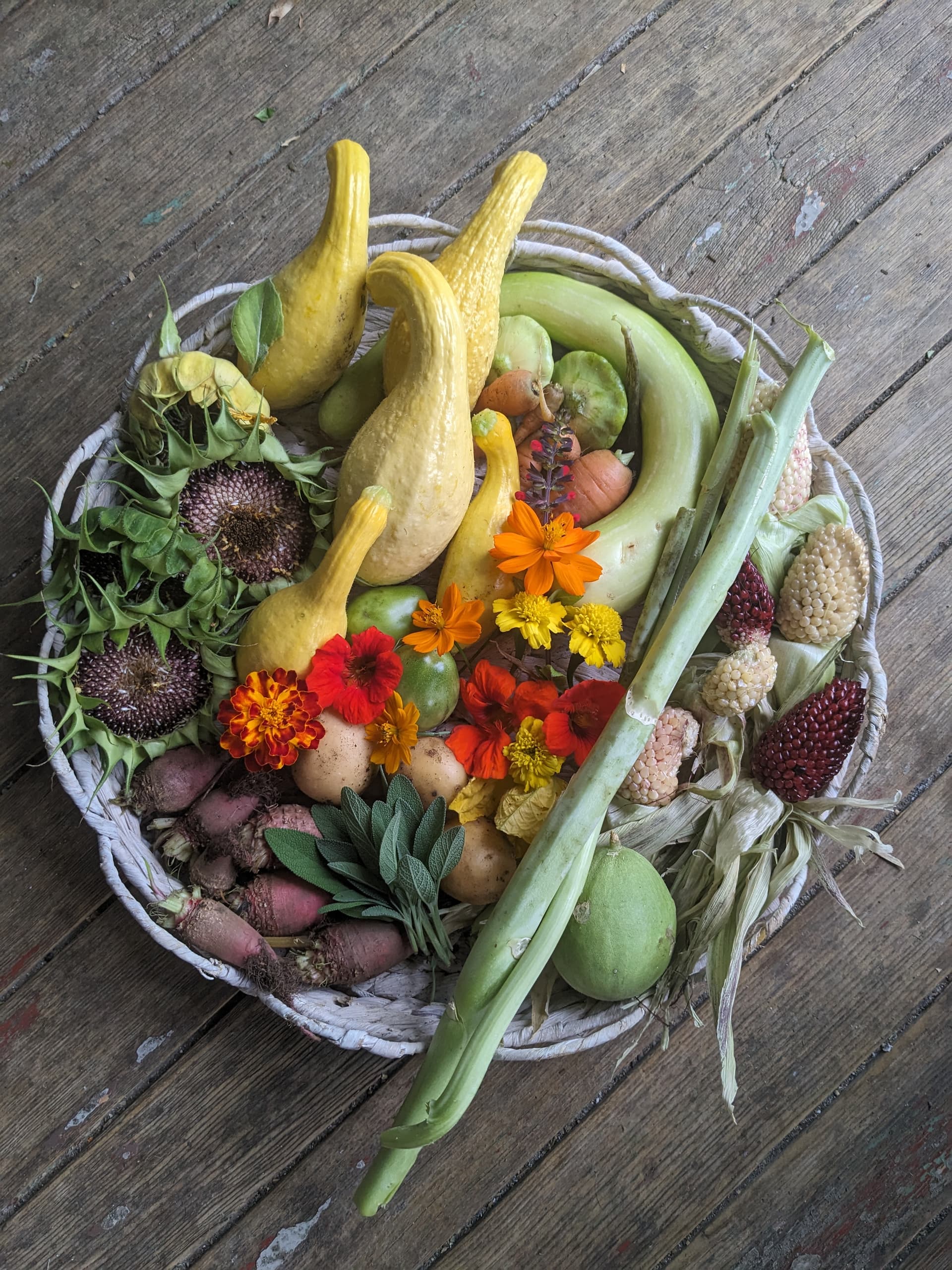 two baskets yesterday. marrowstem kale stems for soup maybe? might just roast them split underneath a bit of beef. corn is a disappointment as usual; popcorn variety snuck in this year and apparently pollinated everyone.