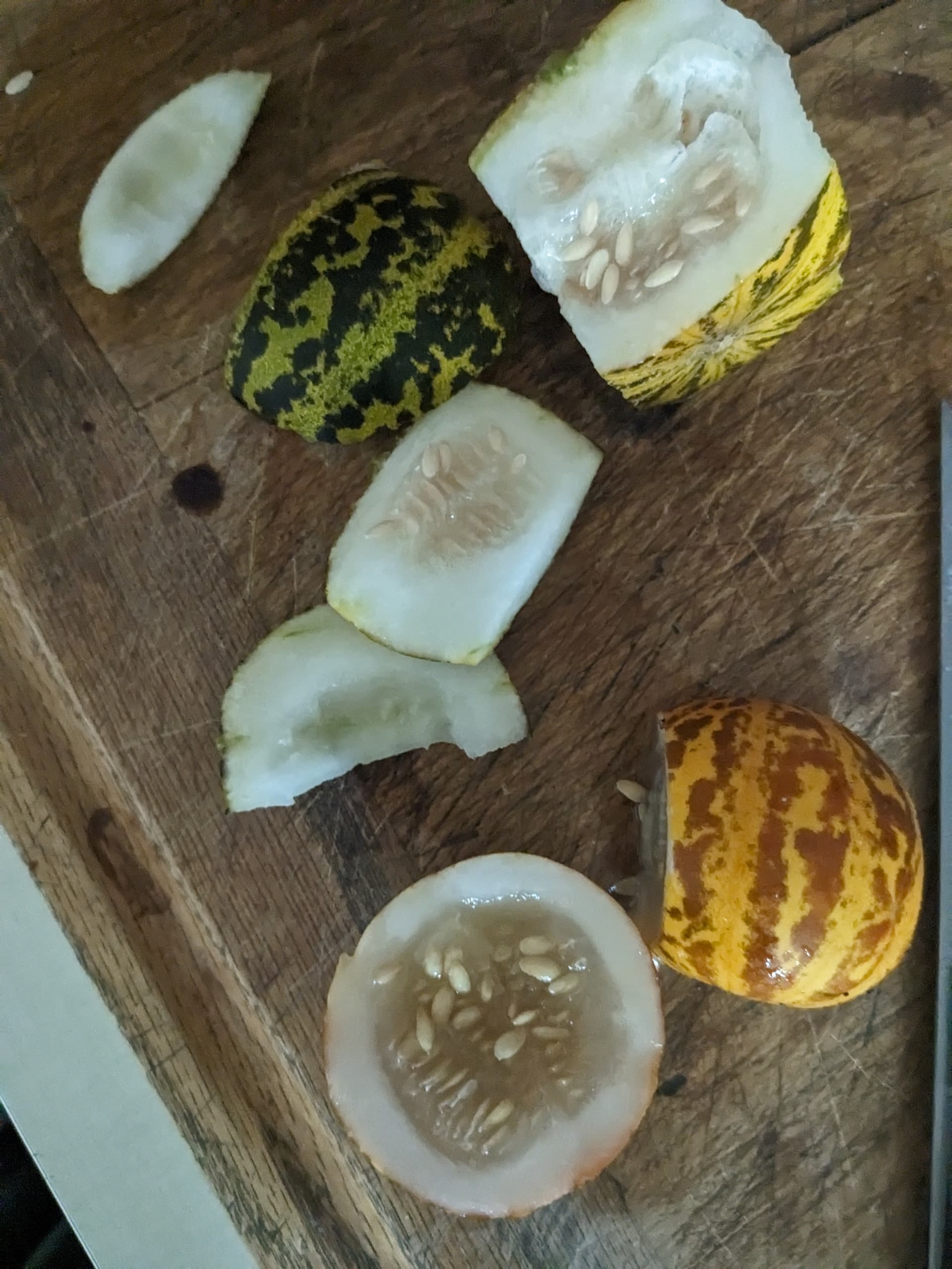 small melons; green young tasted ok but not great. past ripe were sour and just awful