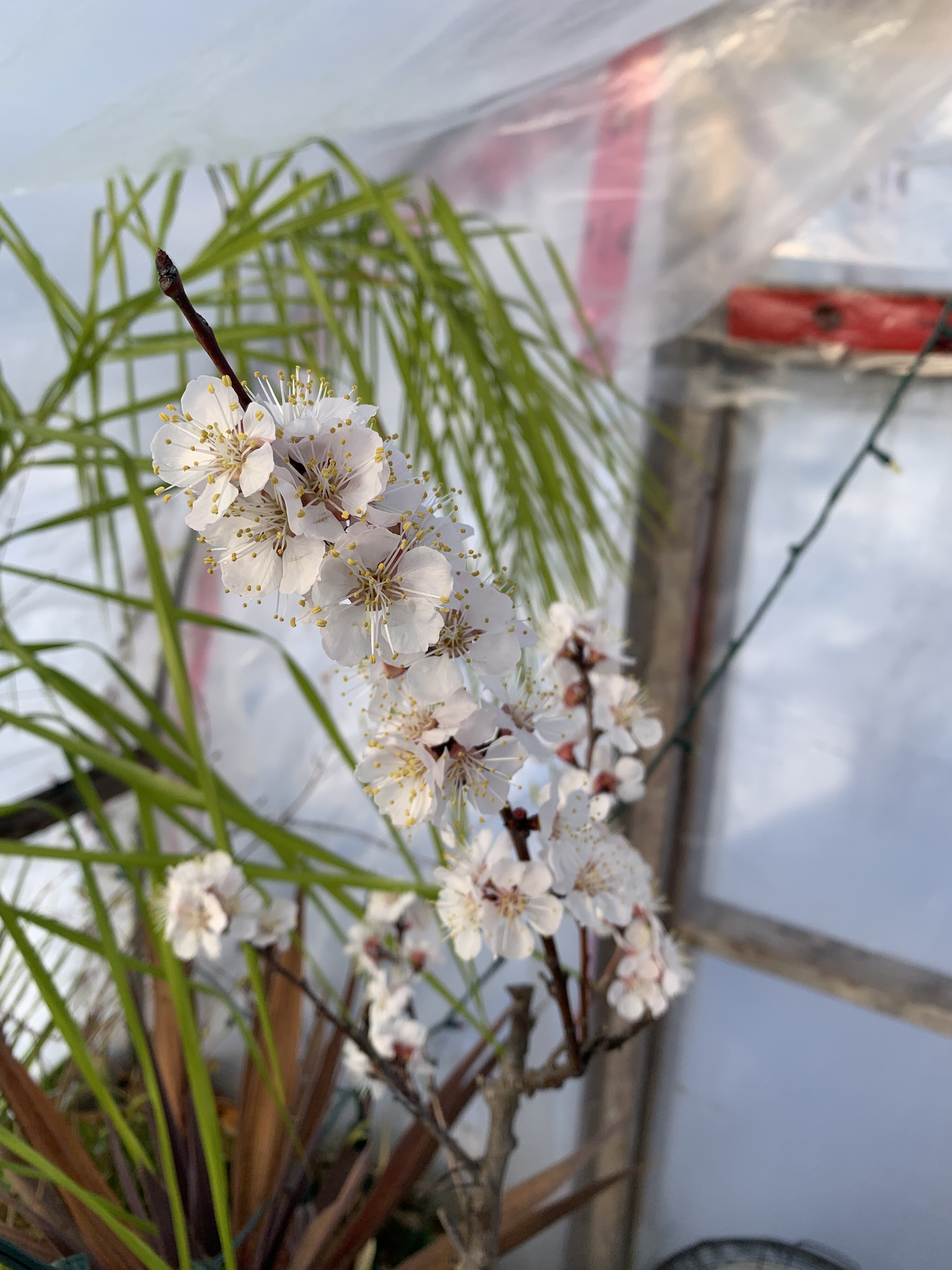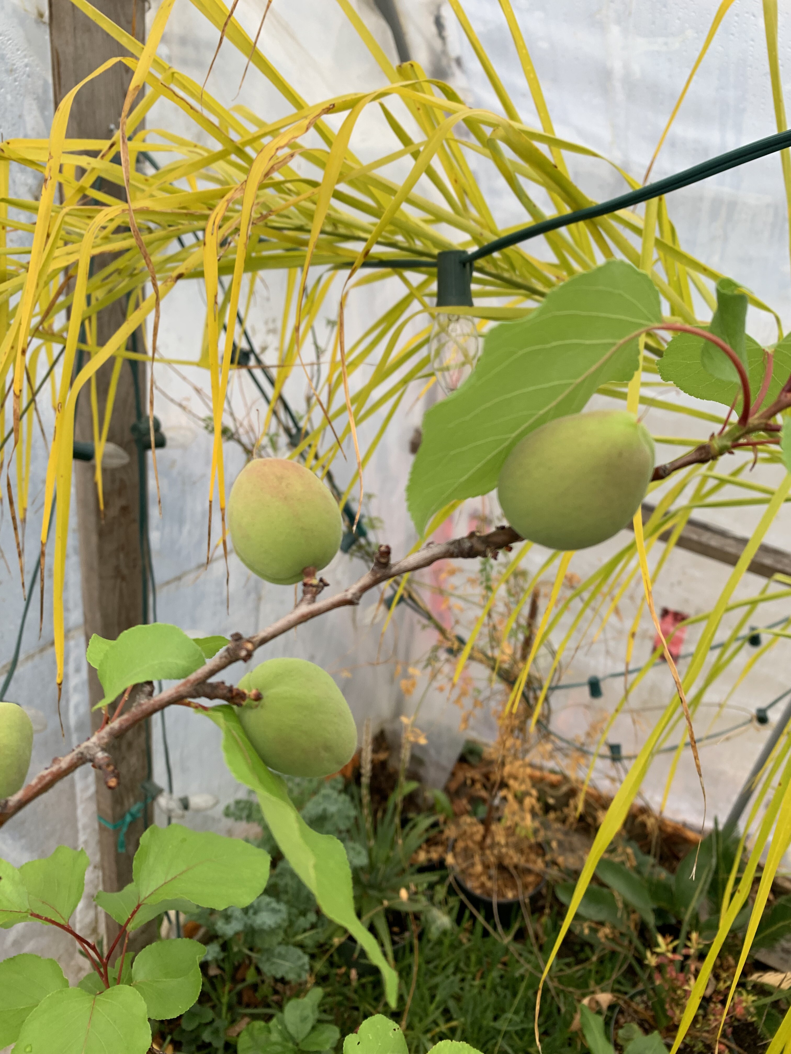 The sad apricot tree in the greenhouse started flowering in late Jan. Now the fruit are getting pretty big.
