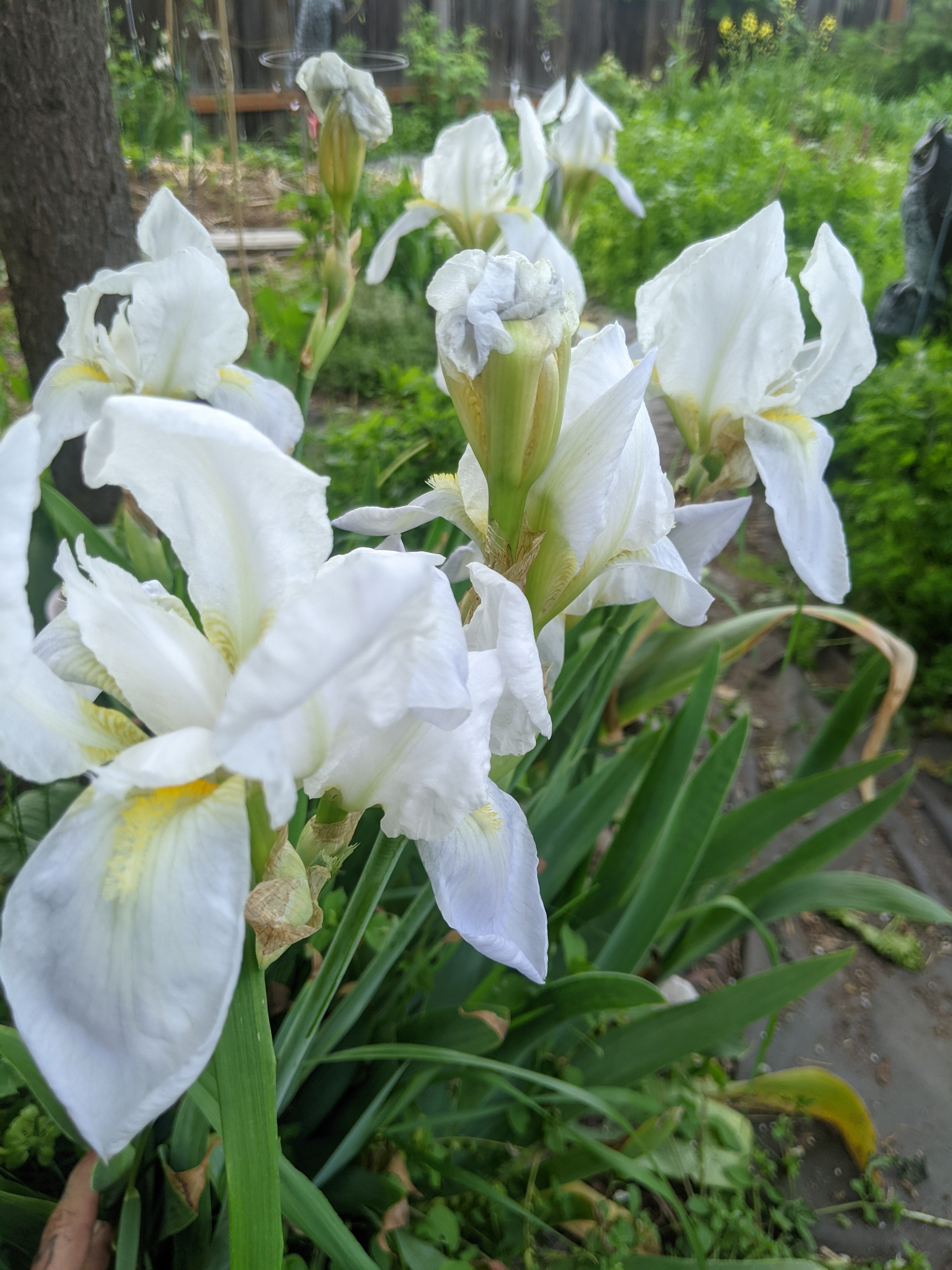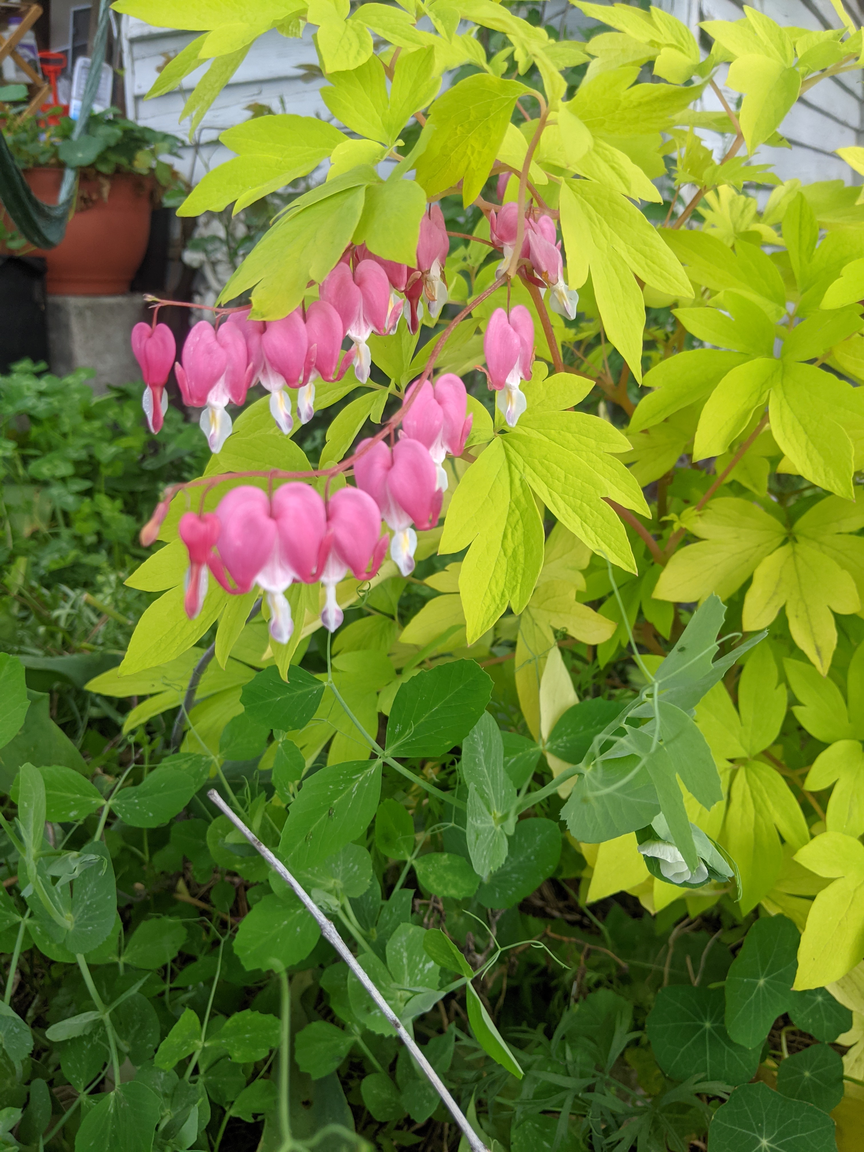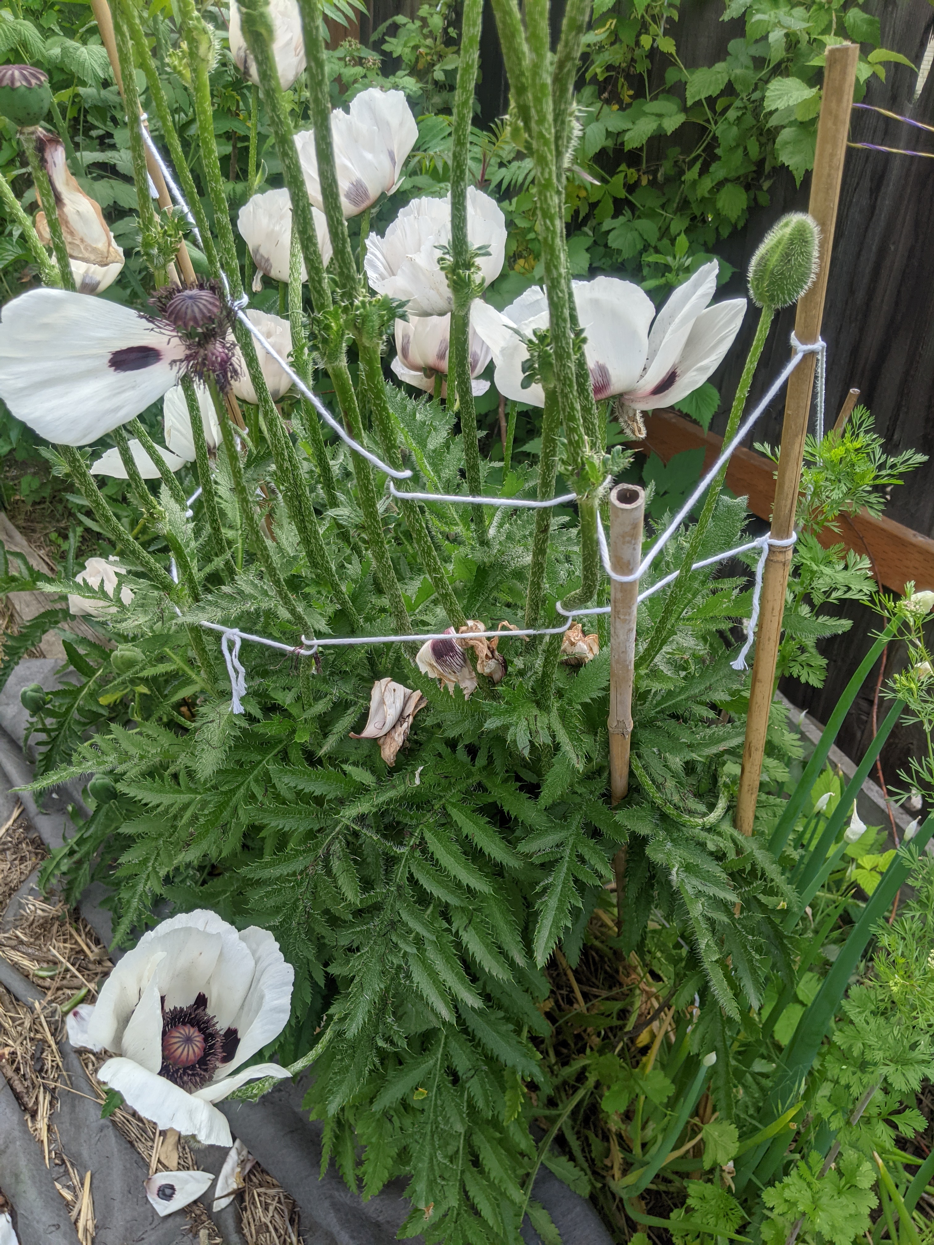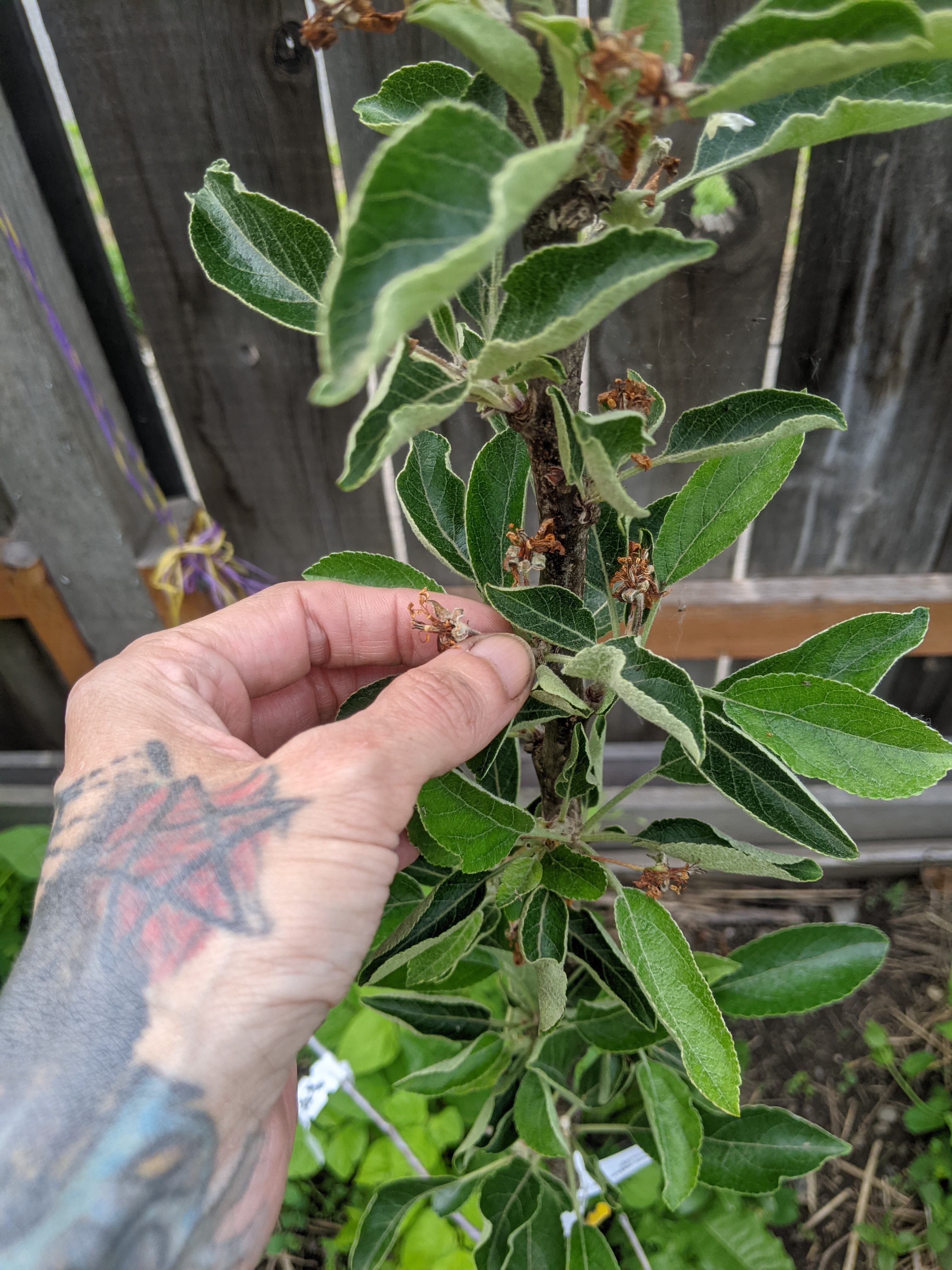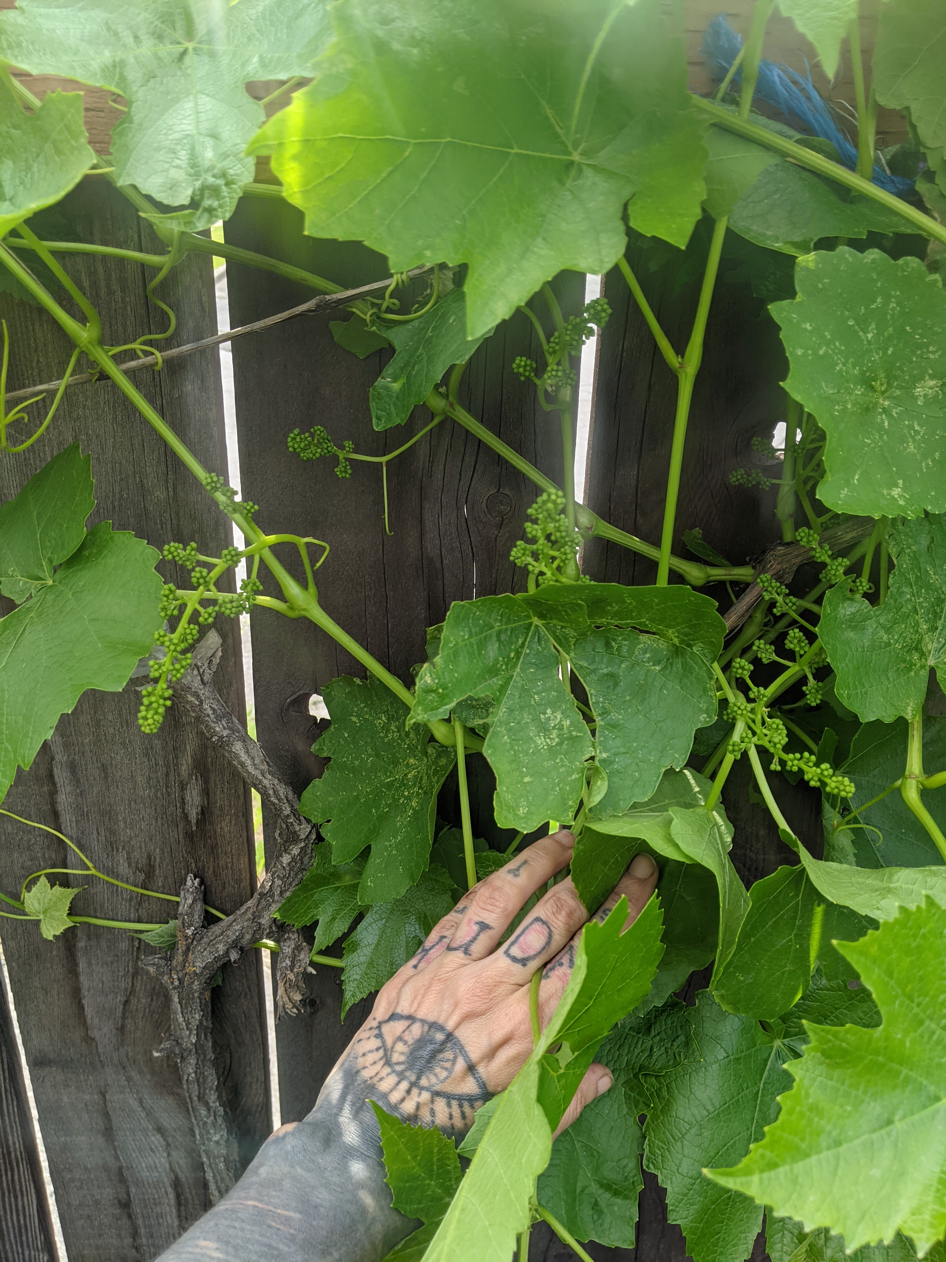 I might get grapes this year. it’s year 4! lots of things budding and blooming finally. even the hazelnuts look pretty happy. I forgot to pull the flowers off that apple sapling I hope it’s ok. my dwarf banana is coming back, and there’s poppies and irises. my raspberries are only just starting. I bagged baby plums today.