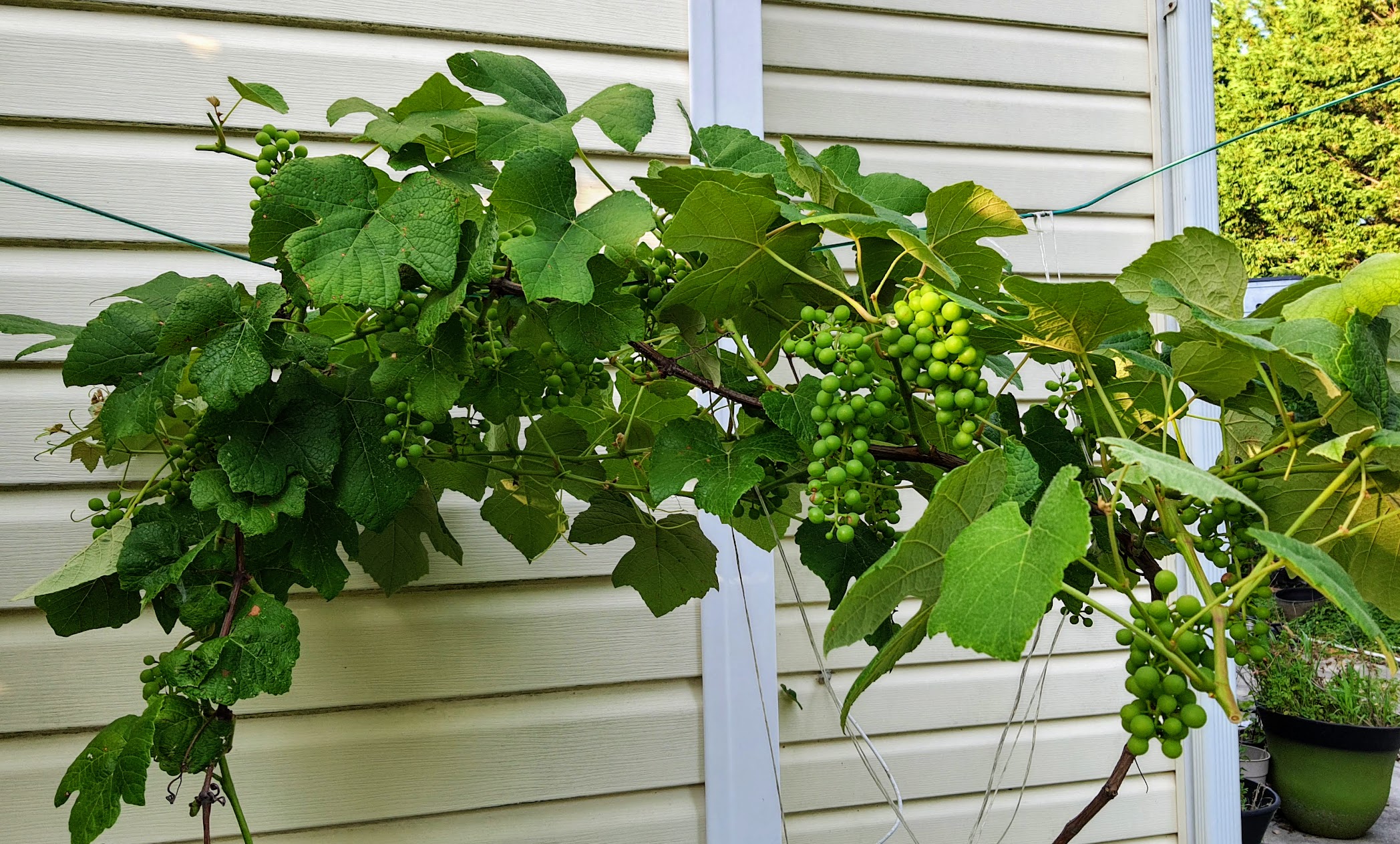 I leave all canopy that shades from midday and evening sun… but remove all that would stop morning sun from hitting the grape clusters. I also remove any leaves down under the main canopy near the grape clusters… for better air flow.