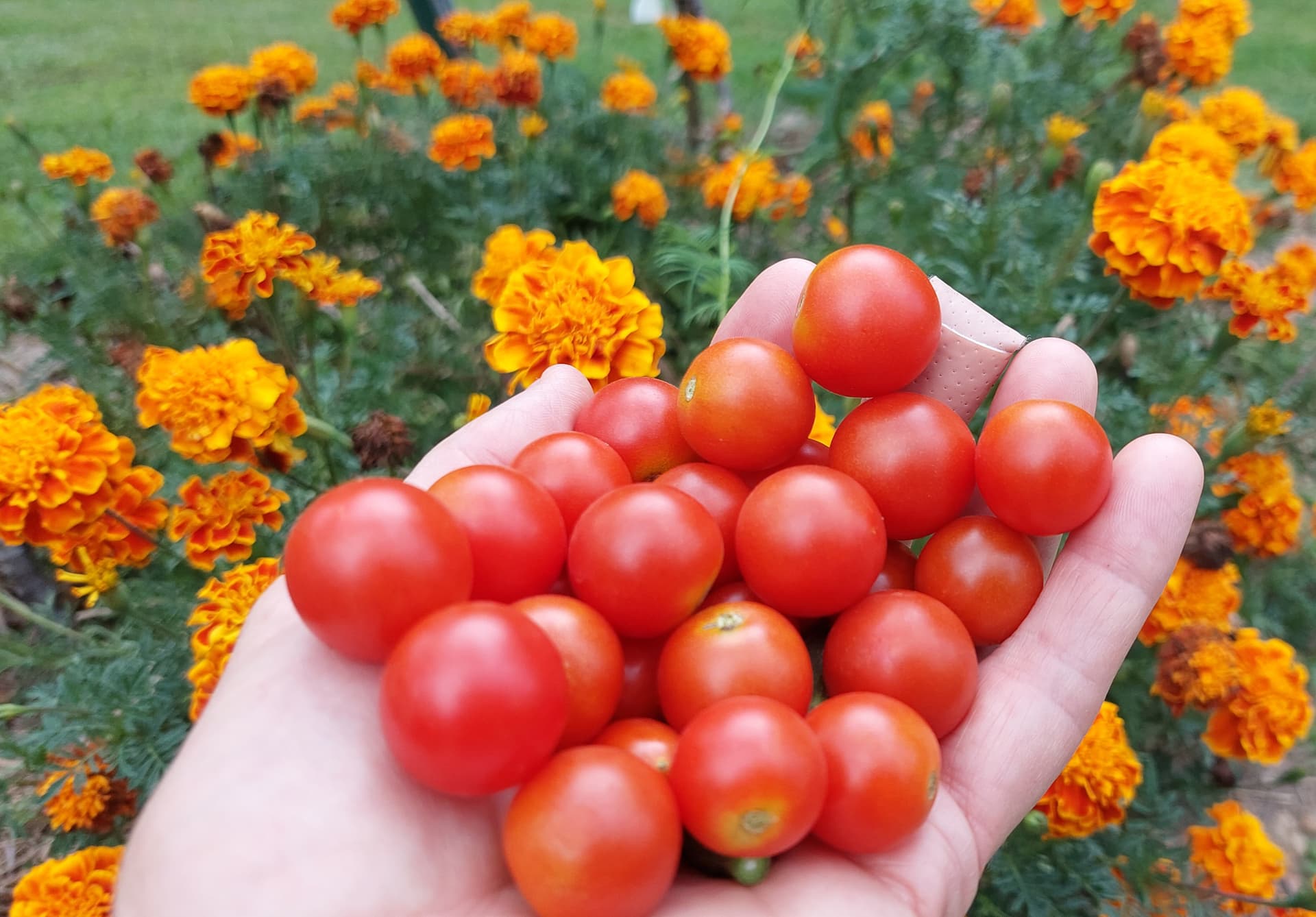 Those are yellow pear tomatoes, a Ukrainian variety. We make sun dried tomatoes with them. Put the dried tomatoes in a jar with diced garlic, basil, a little salt, then cover in olive oil. Let it sit in the fridge and spoon it onto crusty bread or top pasta with it.