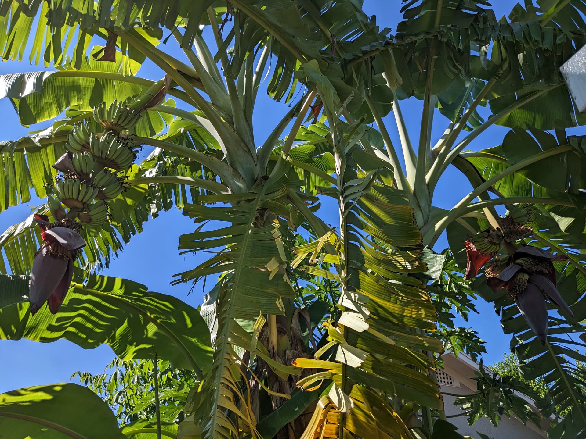 Lots of bananas on the way. Two bunches at the same time on one tall namwa, one bunch on the mystery banana and the dwarf orinoco (not pictured) has one bunch and another about to come out. I might be the most excited about the fuzzy pink bananas ![]()