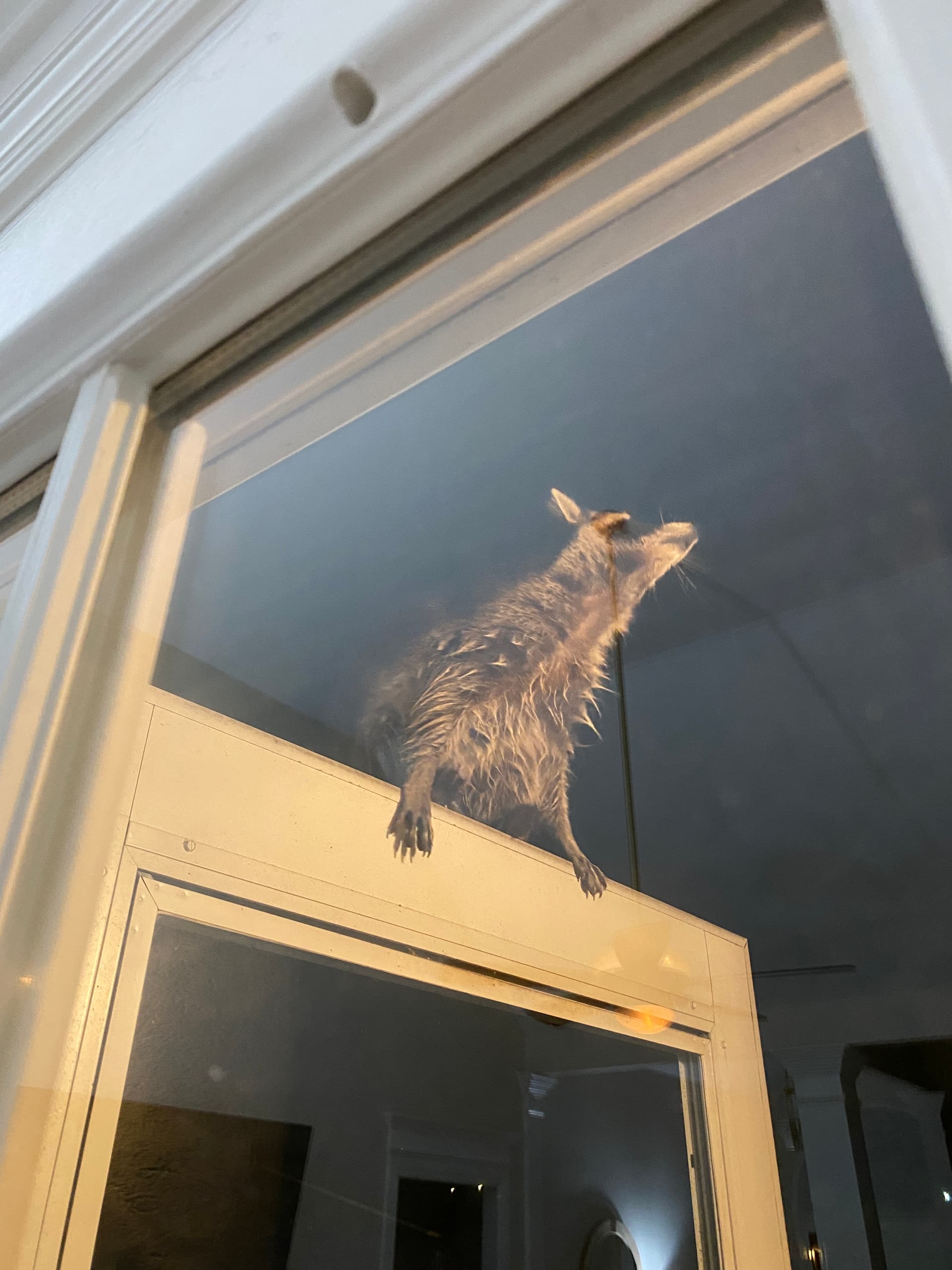 I think that there are more burglars/bandits in our neighborhood than we realize. About 4am this morning I heard a loud rattling at my back door. The first thing I checked was to make sure it wasn’t my cat Grady. He was sound asleep in a cardboard box (his choice of bed). I finally got the nerve to approach the back door. The first thing I noticed was the storm door was wide open. I flipped on the light and I jumped backward seeing a raccoon balancing on top of the storm door. He was reaching upward trying to get to the roof. I carefully cracked the door making sure he didn’t run inside the door when he came down. He came down as I closed the door and headed toward your house. The picture was taken through our regular door window so it caused a reflection of the inside.