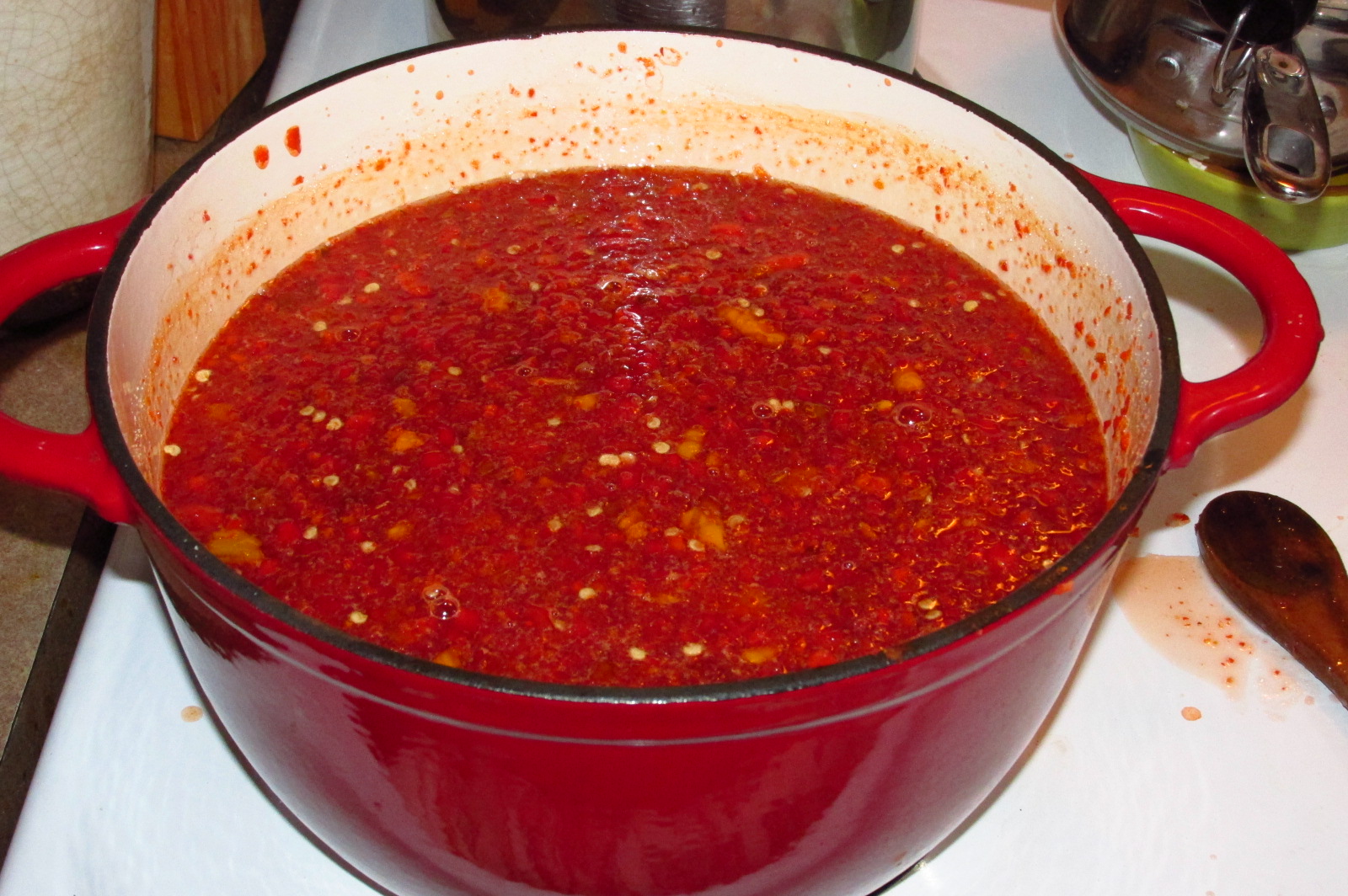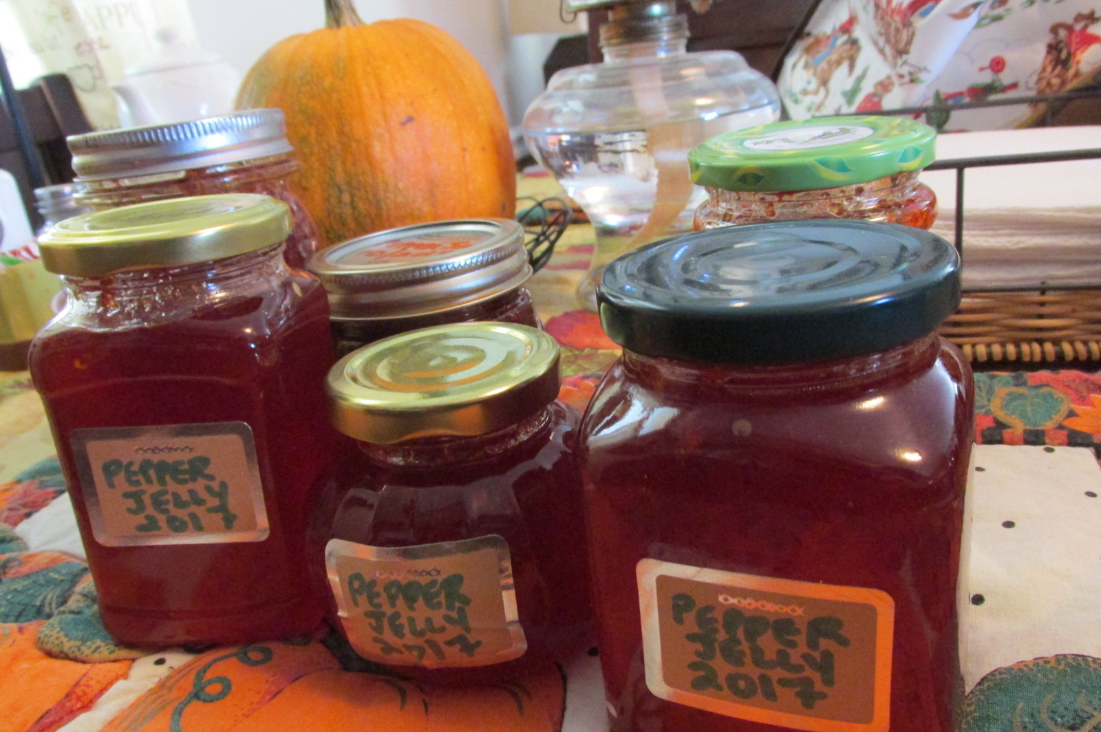 Some jars of hot pepper jelly. It was the first time making it, and I think we used too much pectin, as it is a bit too thick. It has a nice hot/sweet flavor, but is too thick.
