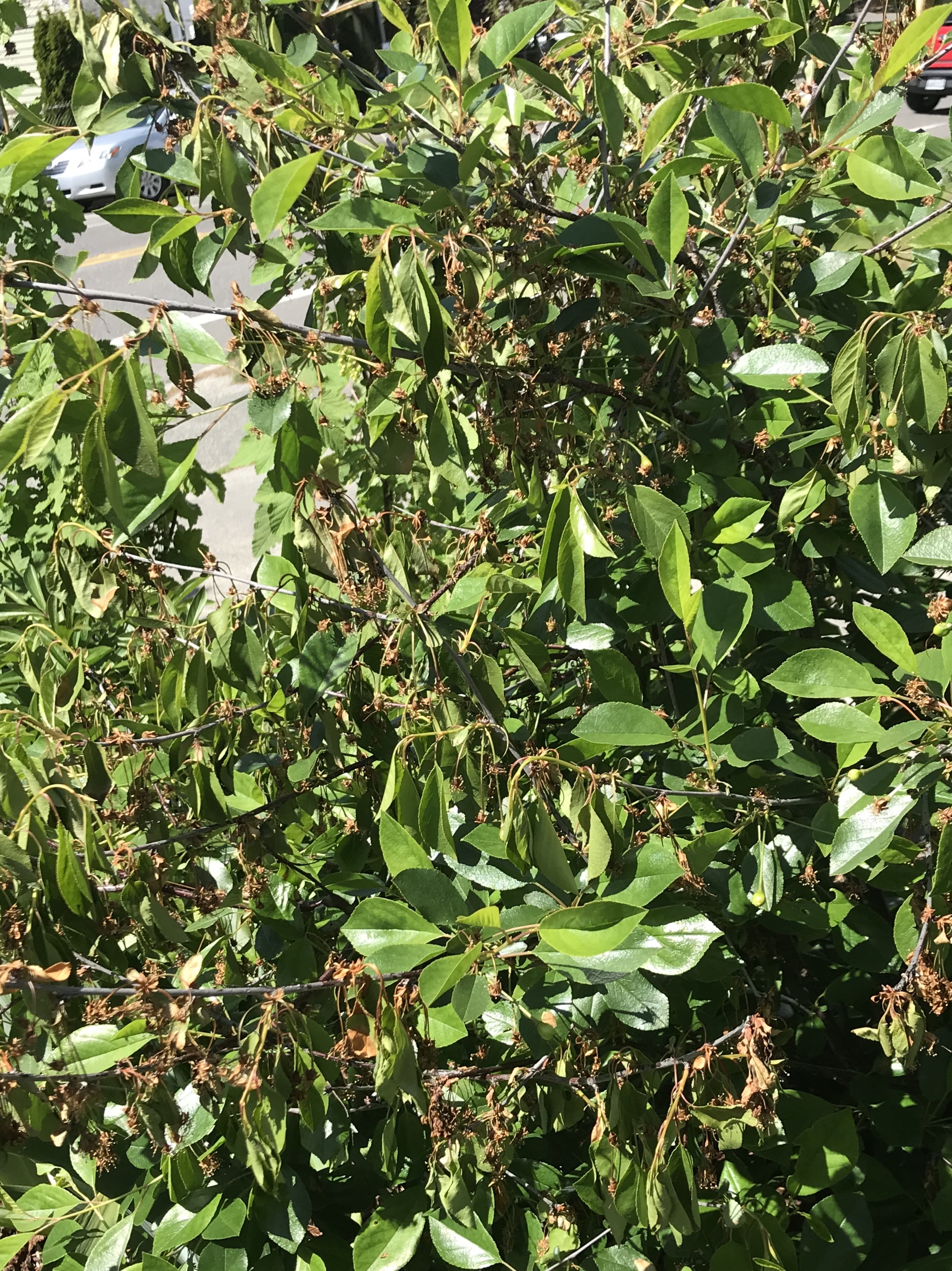 I think @mamuang and @Stan are right. For years I had exactly the problems shown in your photo on most of my Romance Cherries. In fact, some years I’d loose as much as half the bush. But this year I sprayed Copper, Captan, and Myclobutanil before bud break and as soon as bees lost interest in blooms. The results are amazing. For the first time in 5 years I have not a single trace of what you show in your photos. I am certain that one or two of the 3 funguides I used would have done the trick so I’m not sure which one did it, but the point is that your problem is fixable and I’ve proven it this year. I have bushes full of fruit for the first time. Good luck