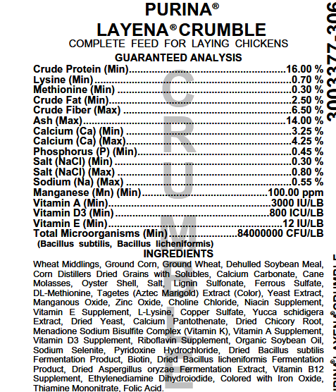 Wheat Middlings, Cracked Corn, Whole Oats, Dehulled Soybean Meal, Roasted Whole Soybeans, Whole Milo, Corn Gluten Feed, Oyster Shell, Black Sunflower Seeds, Calcium Carbonate, Soybean Oil, Whole Wheat, Dried Peas, Yellow Corn, Peas, Salt, Lignin Sulfonate, Propionic Acid (a preservative), DL-Methionine, Dried Bifidobacterium thermophilum Fermentation Product, Dried Enterococcus faecium Fermentation Product, Dried Lactobacillus acidophilus Fermentation Product, Dried Lactobacillus casei Fermentation Product, Yucca Schidigera Extract, Verxite Granules, Manganese Sulfate, Vitamin E Supplement, Yeast Culture, L-Lysine, Sodium Selenite, Vitamin A Supplement, Vitamin D3 Supplement, Iron Amino Acid Complex, Silicon Dioxide, Oregano Essential Oil, Thyme Essential Oil, Rosemary Essential Oil, Star Anise Essential Oil, Dried Bacillus subtilis Fermentation Product, Vitamin B12 Supplement, Riboflavin Supplement, Niacin Supplement, d-Calcium Pantothenate, Pyridoxine Hydrochloride, Folic Acid, Menadione Sodium Bisulfite Complex (source of Vitamin K activity), Thiamine Mononitrate, Biotin, Manganous Oxide, Ferrous Sulfate, Copper Sulfate, Zinc Oxide, Ethylenediamine Dihydroiodide, Citric Acid (a preservative), Mixed Tocopherols (a preservative).