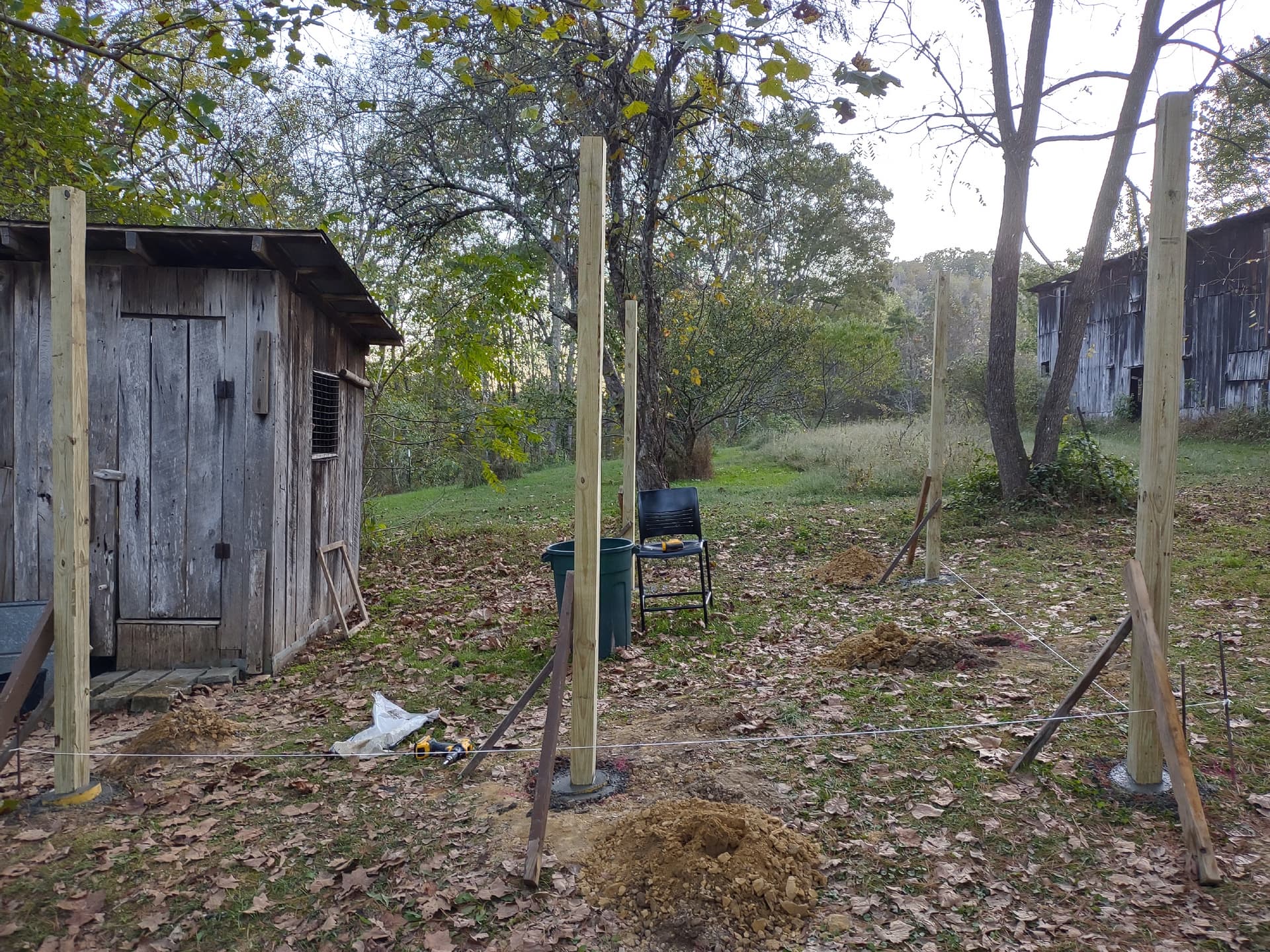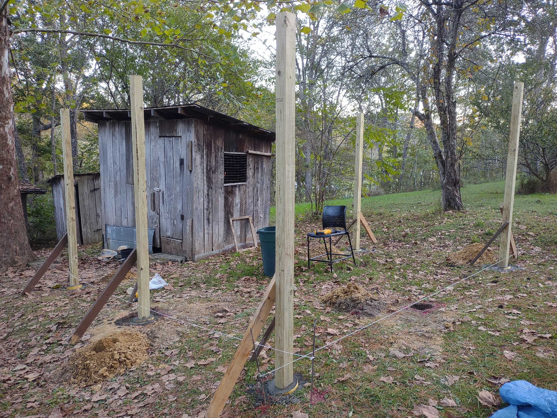 Iām spacing 4x4x10 posts about 6-7ft apart to be the base to where the chicken wire will be attached. The run is about 14x13ft square.