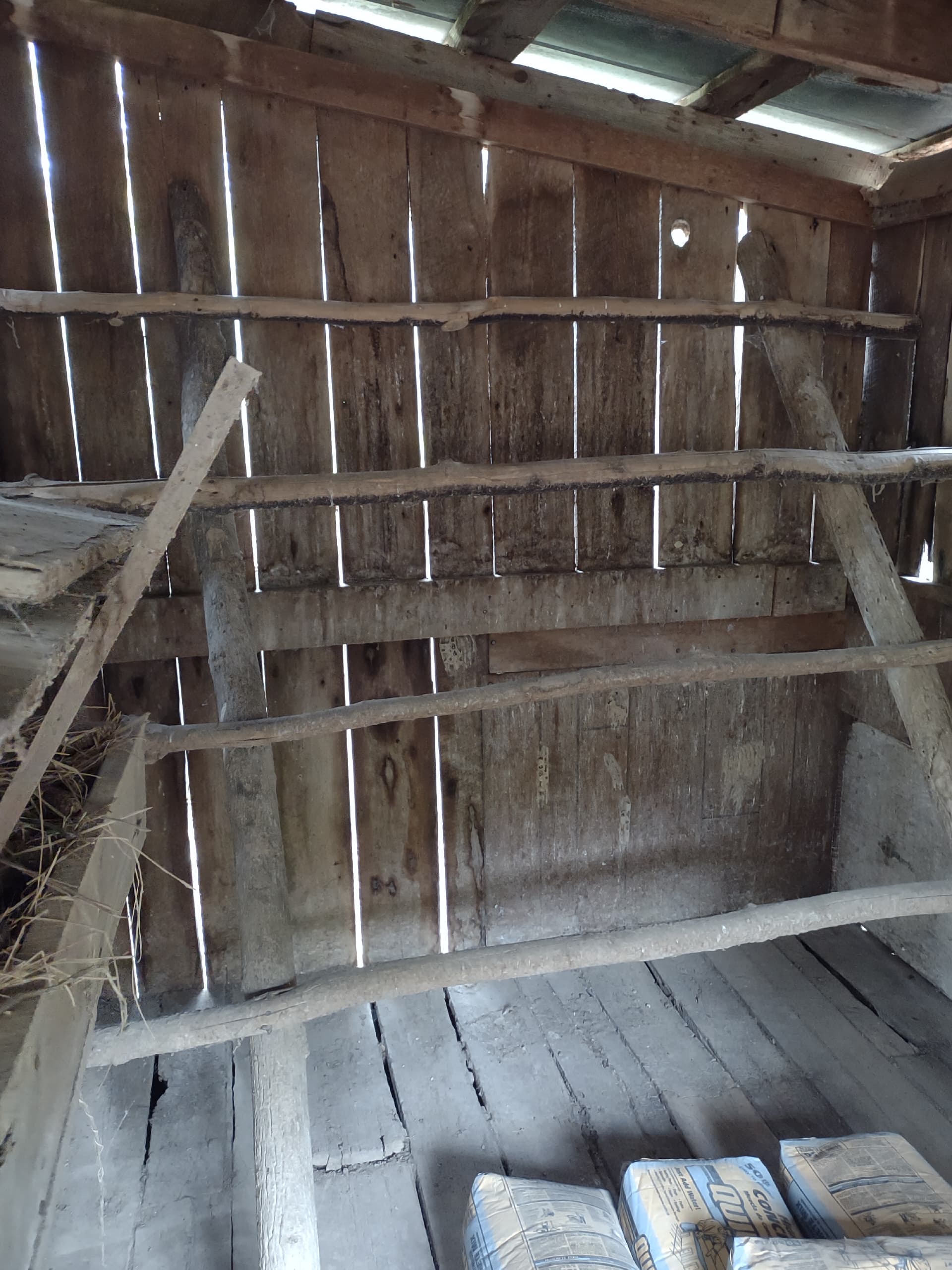 Inside, showing roosting poles. Floor is mostly okay, nesting boxes need replaced tho.