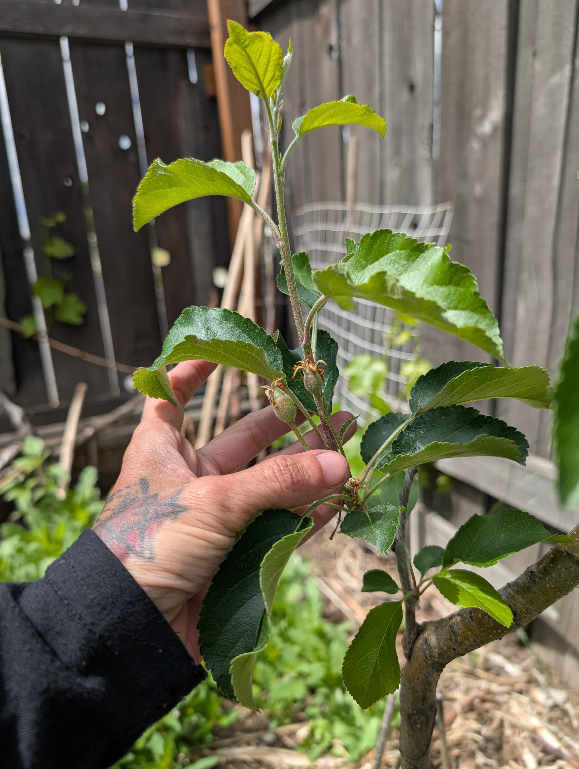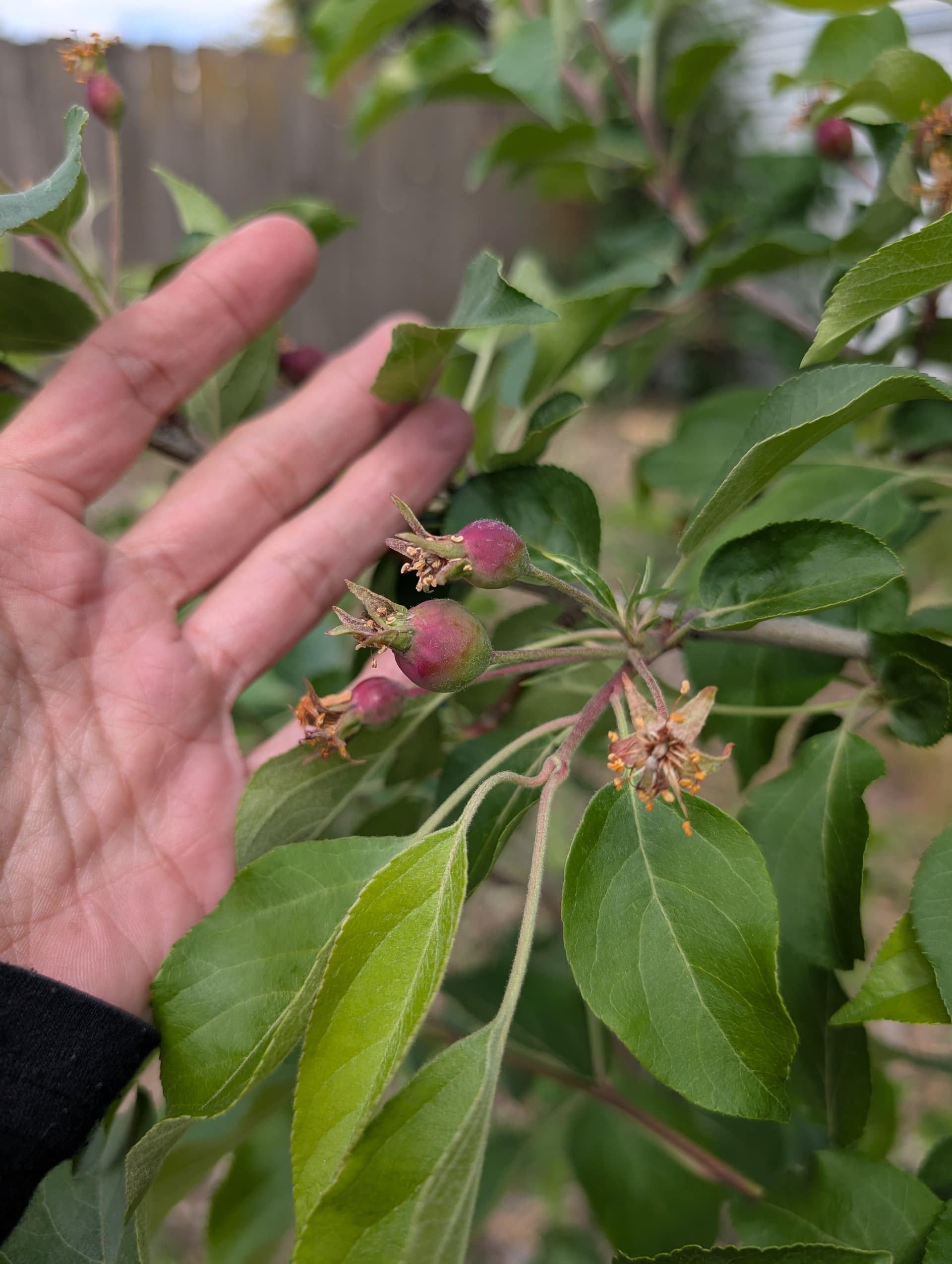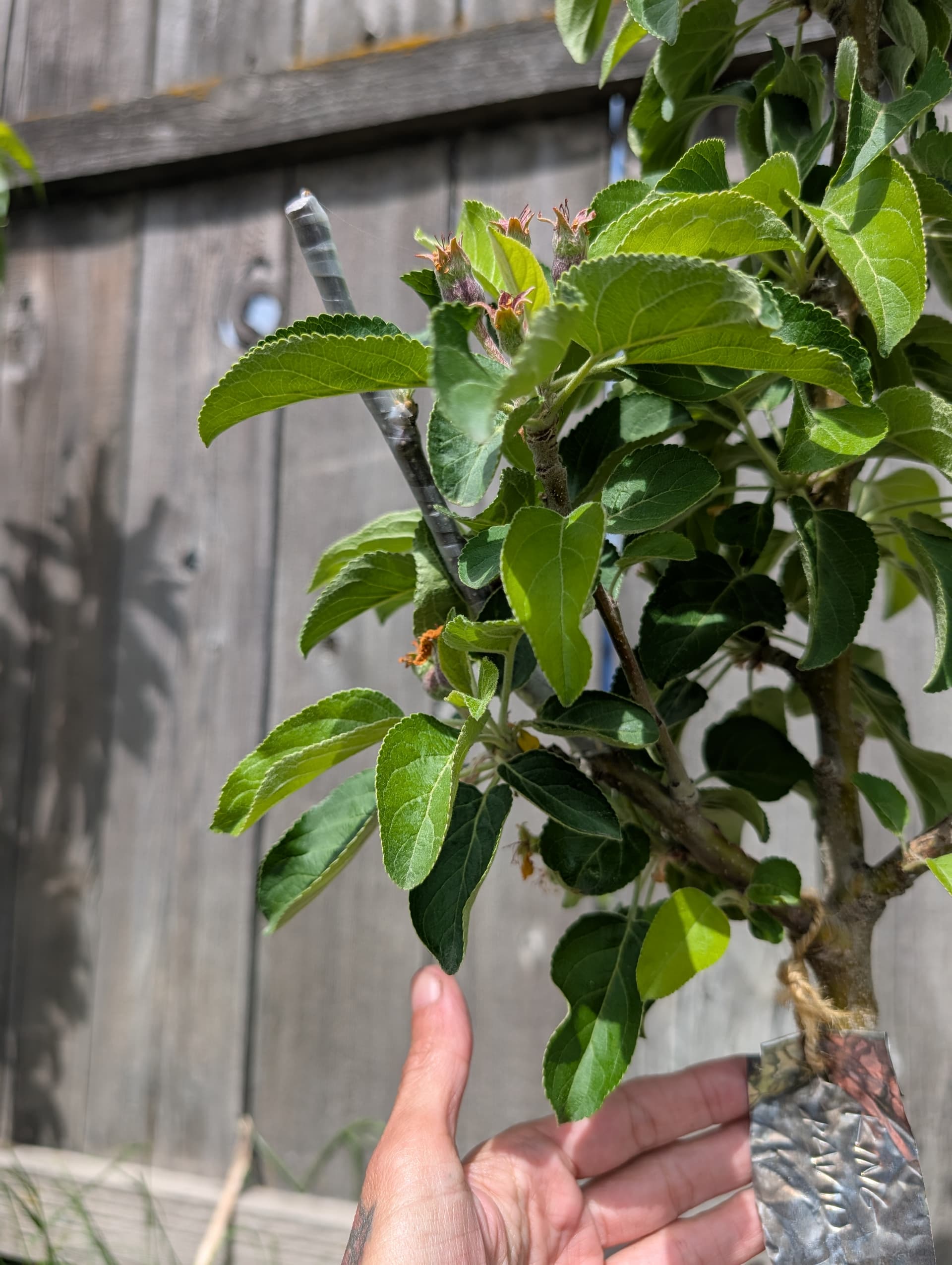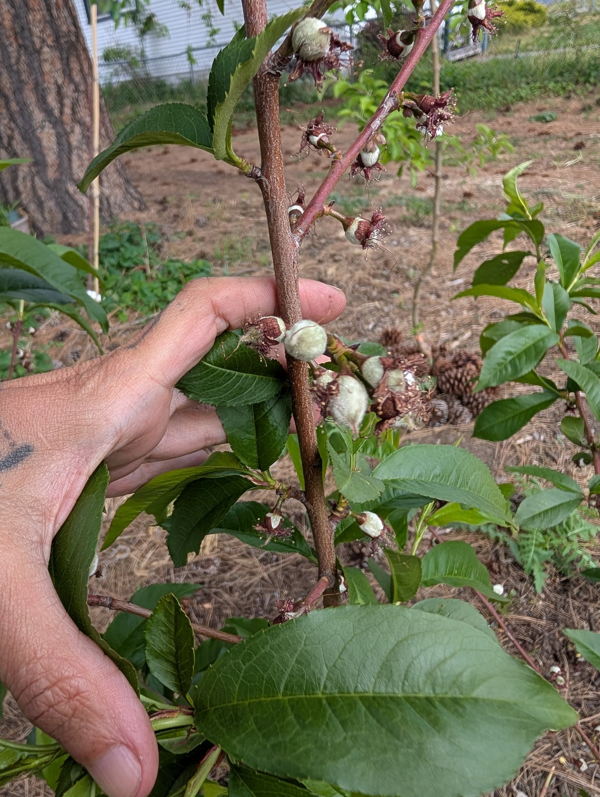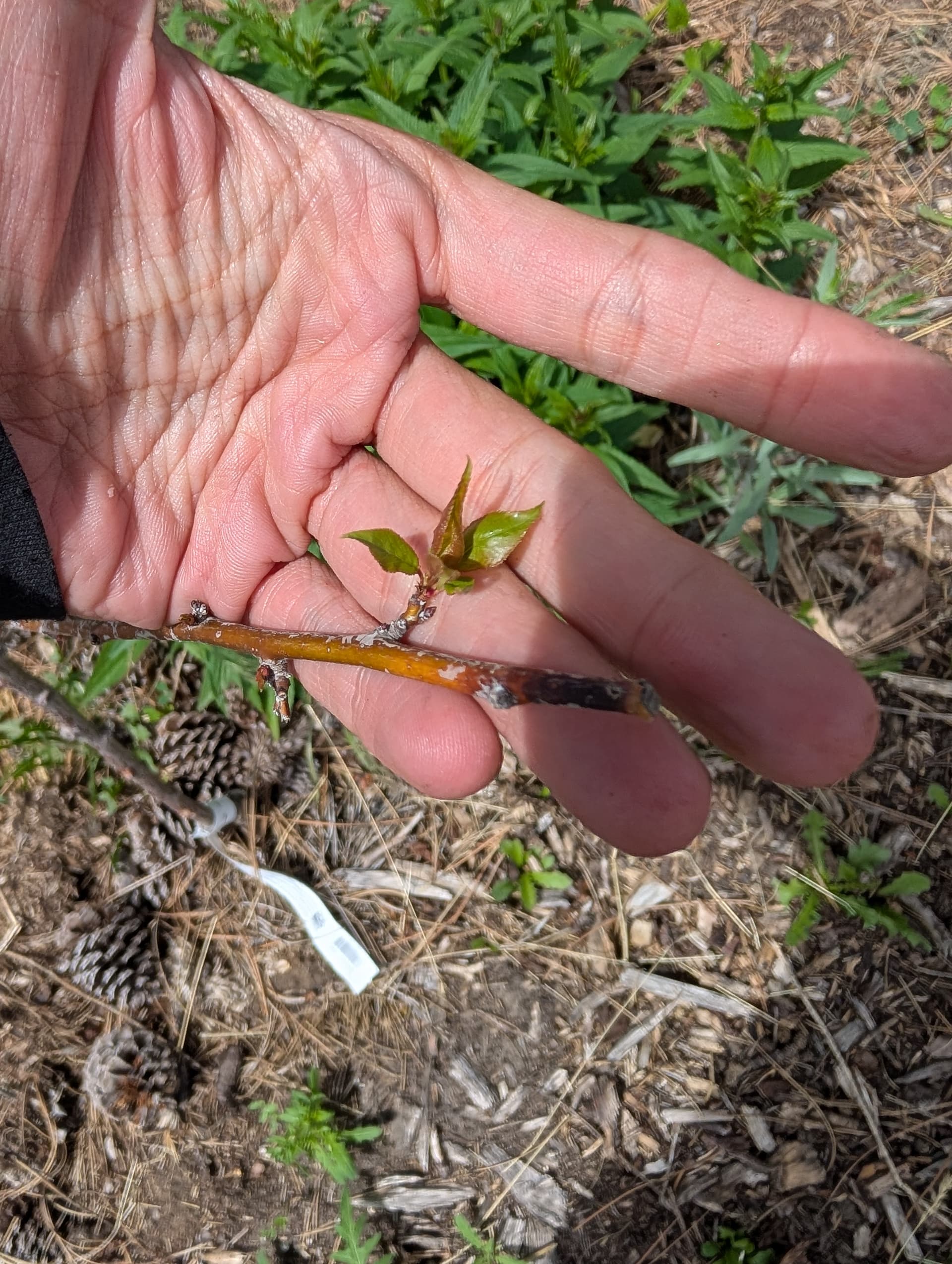 “pristine” apple which I don’t have high expectations for, hunza apricot leaves, scout apricot just starting to break bud this late, a “veteran” peach that got weed whacked to the ground and grew back from the root stock (I’ll have to figure out how to graft into that, whatever it is) and reliance peach flowering.