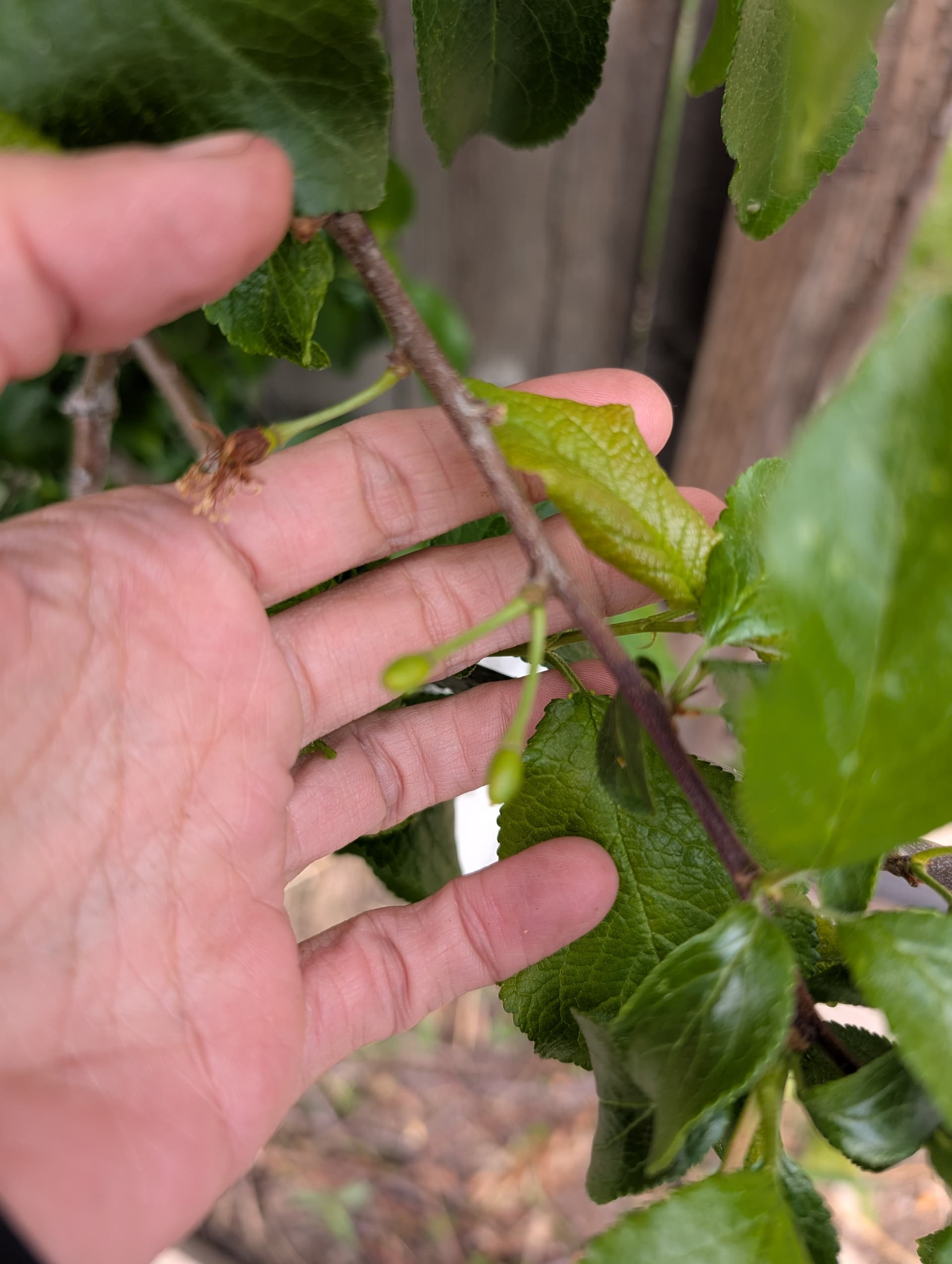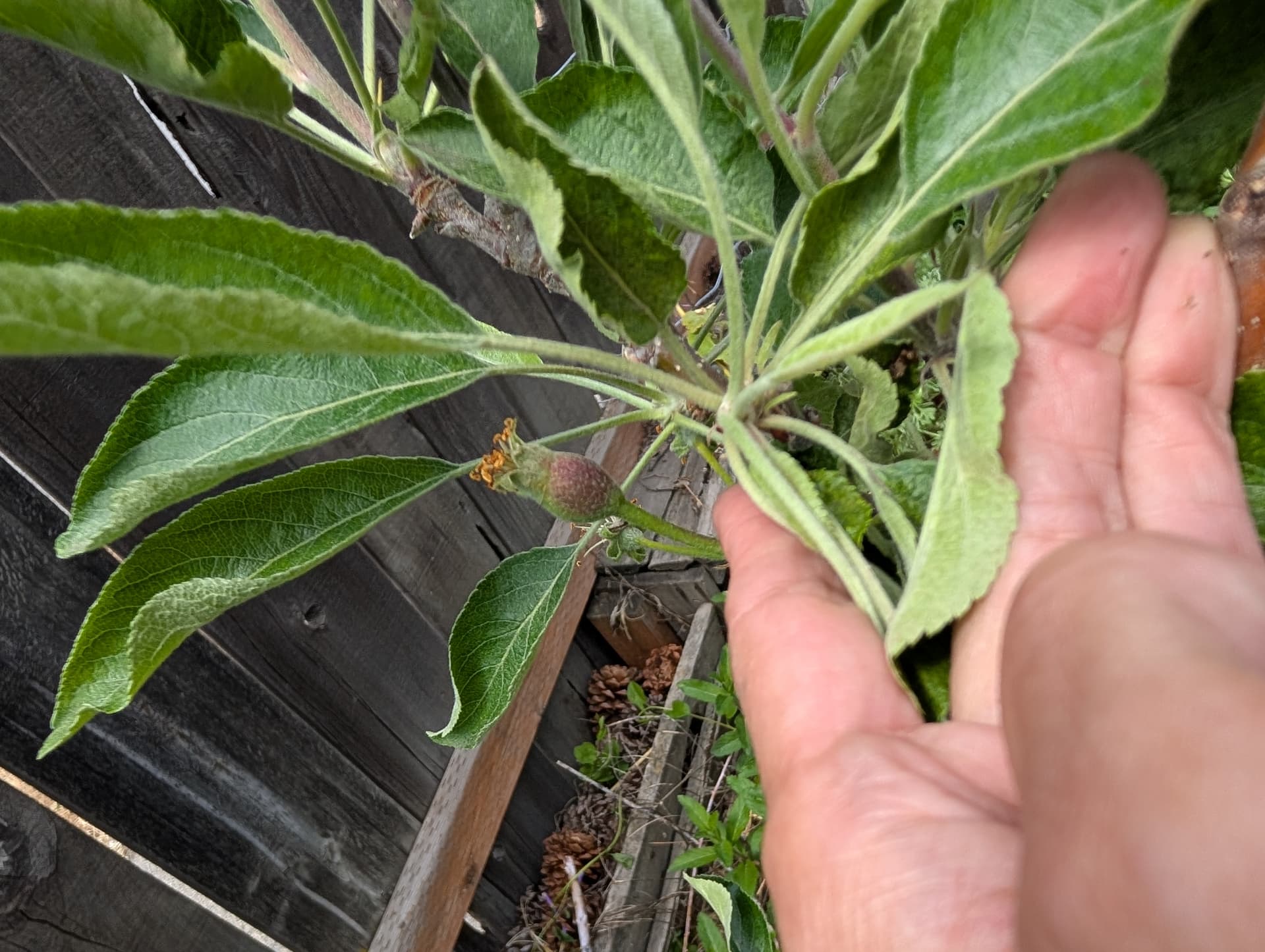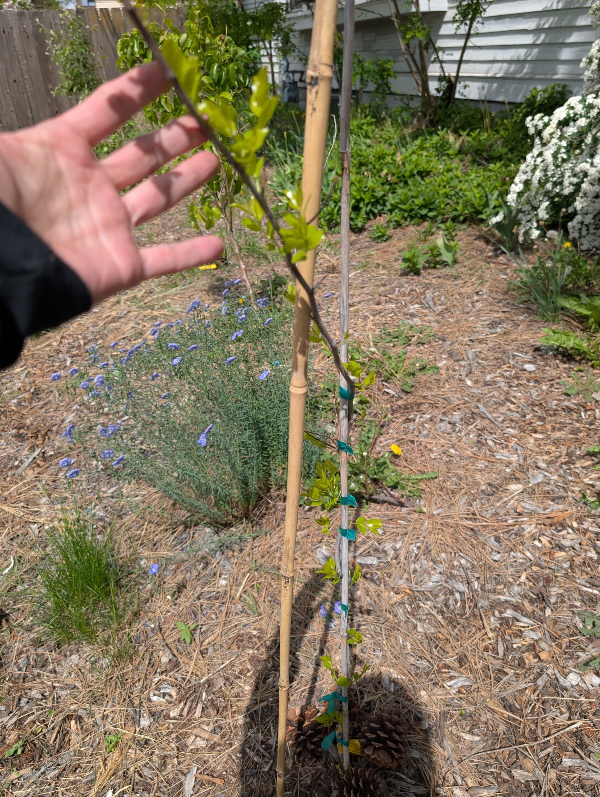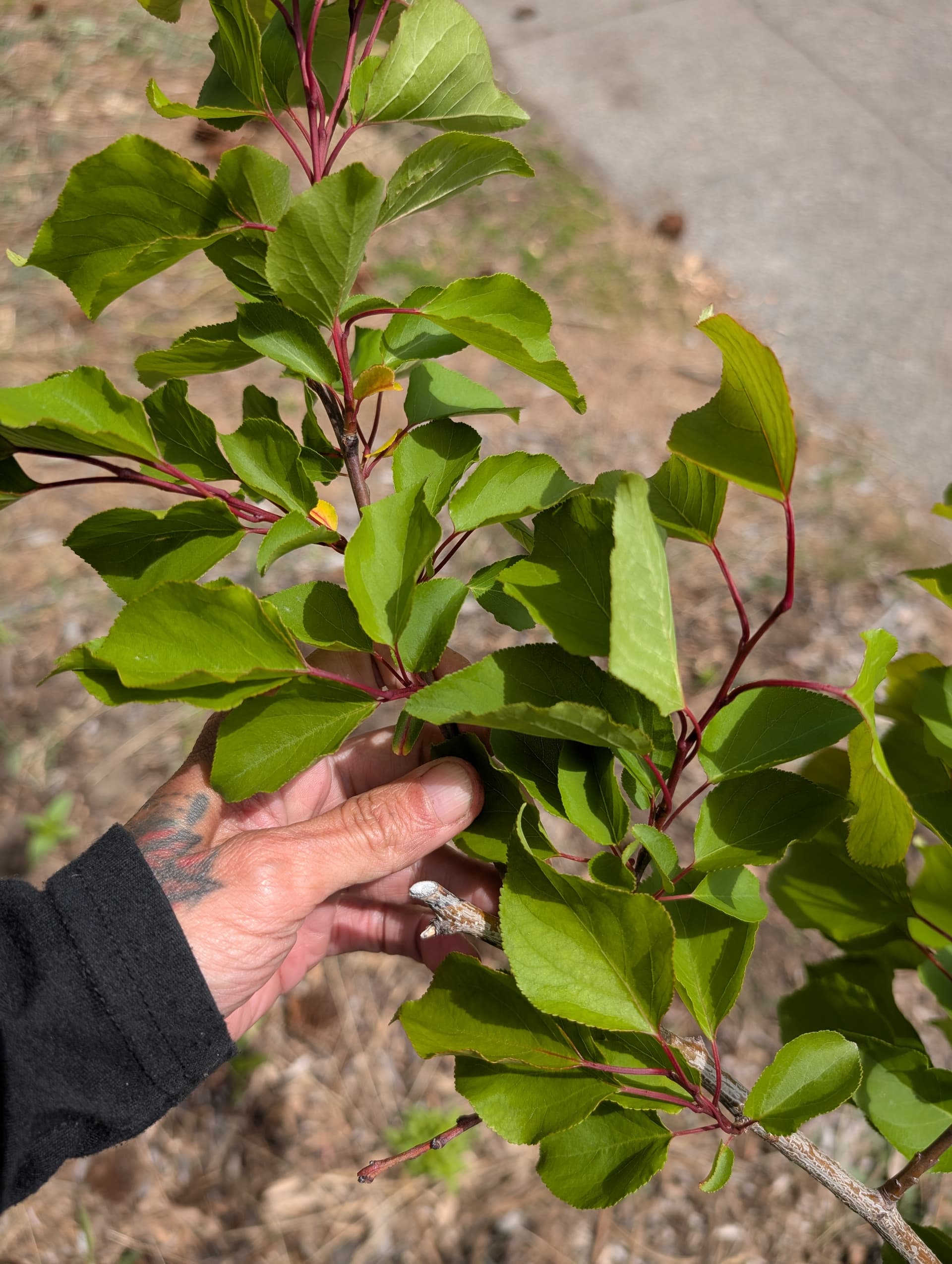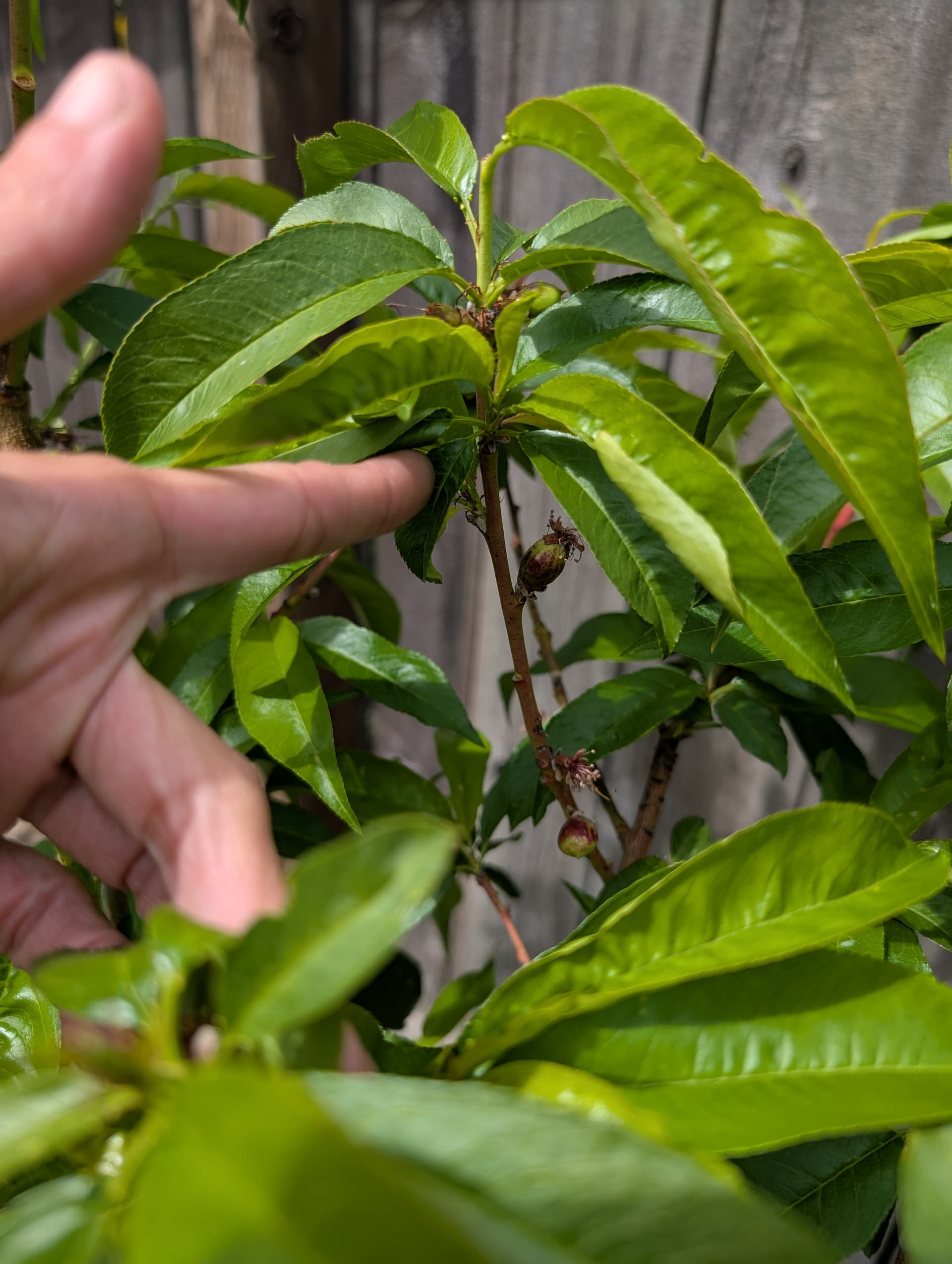 “pristine” apple which I don’t have high expectations for, hunza apricot leaves, scout apricot just starting to break bud this late, a “veteran” peach that got weed whacked to the ground and grew back from the root stock (I’ll have to figure out how to graft into that, whatever it is) and reliance peach flowering.