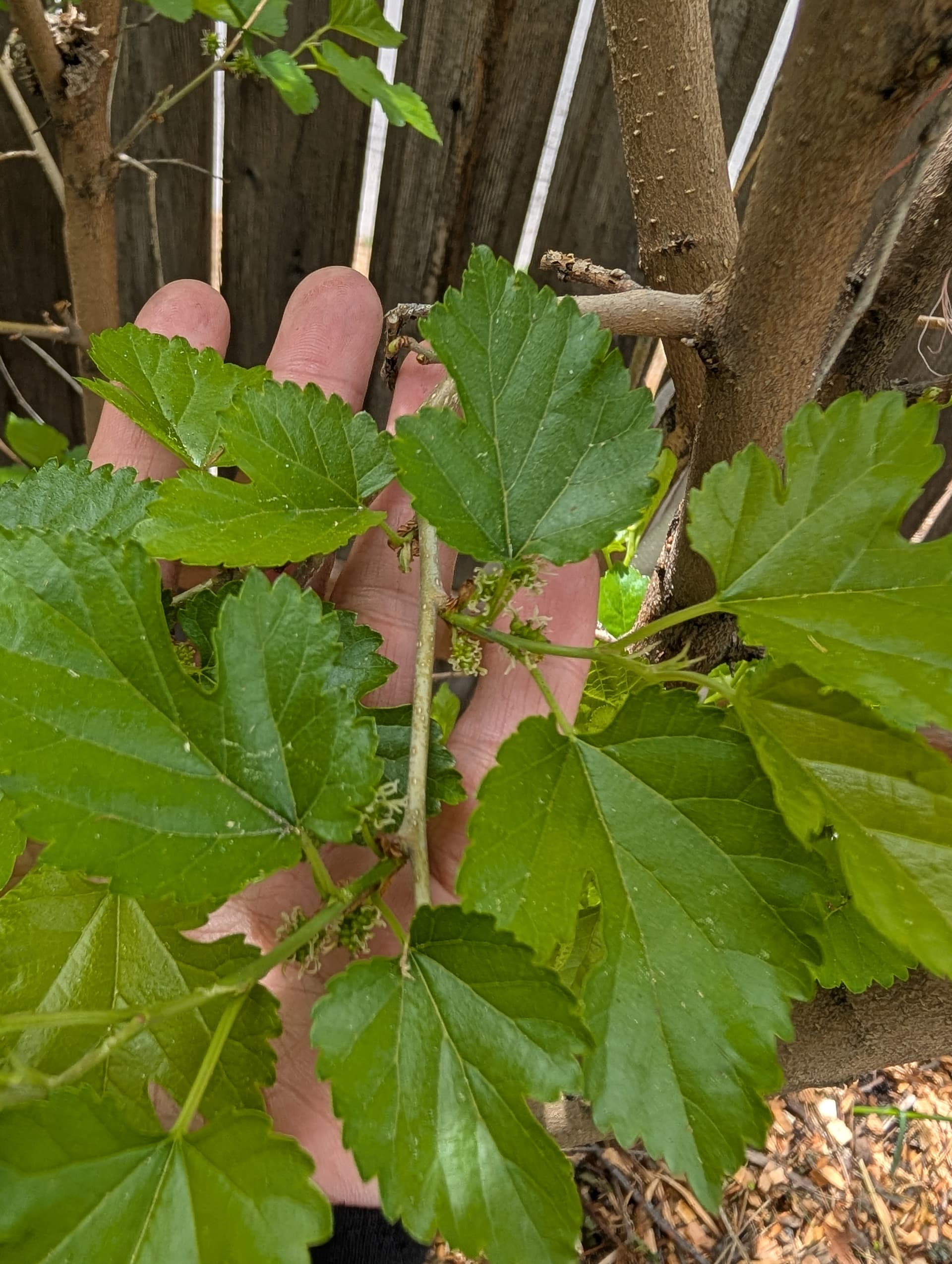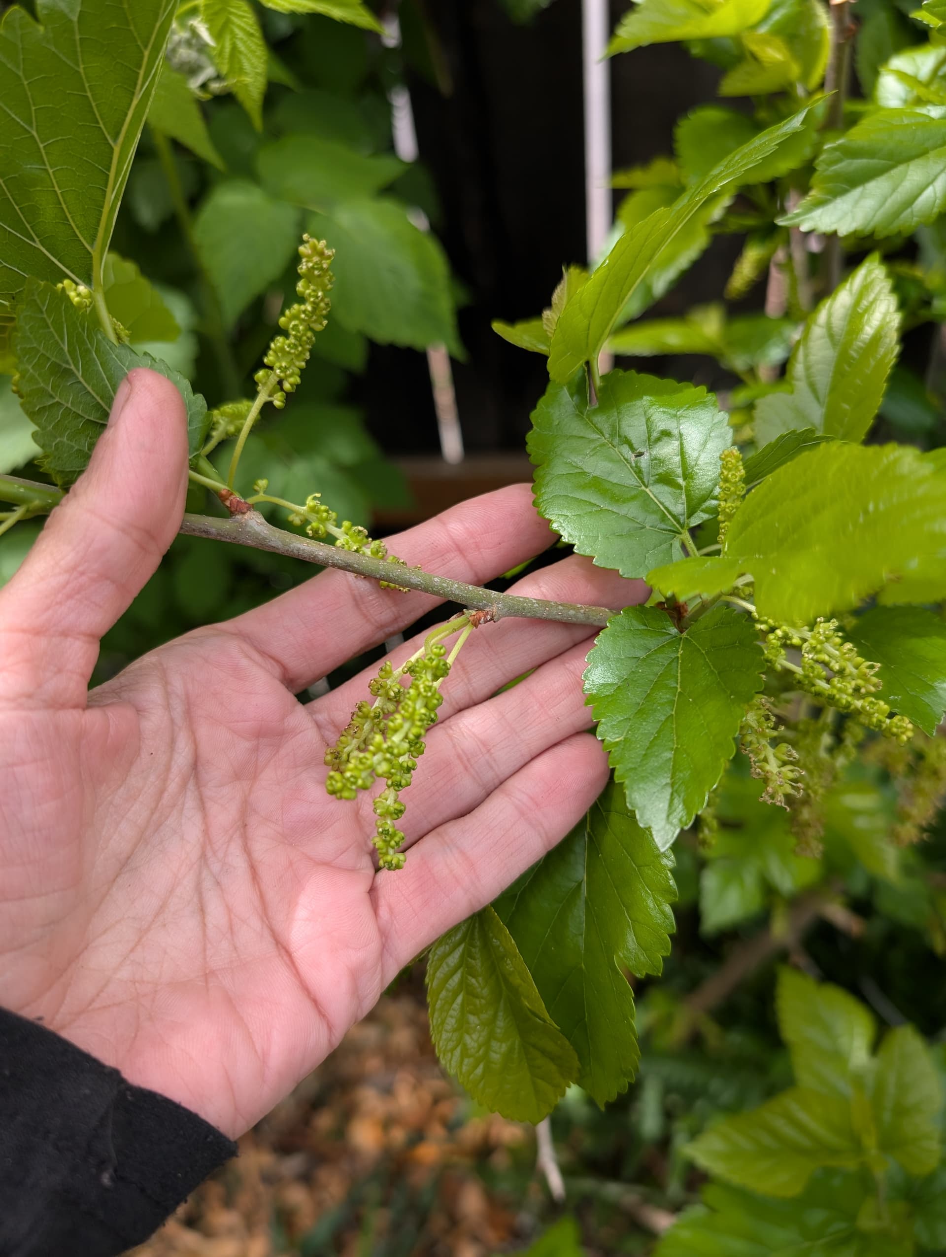 mulberries just now breaking bud, lilacs getting ready to flower.