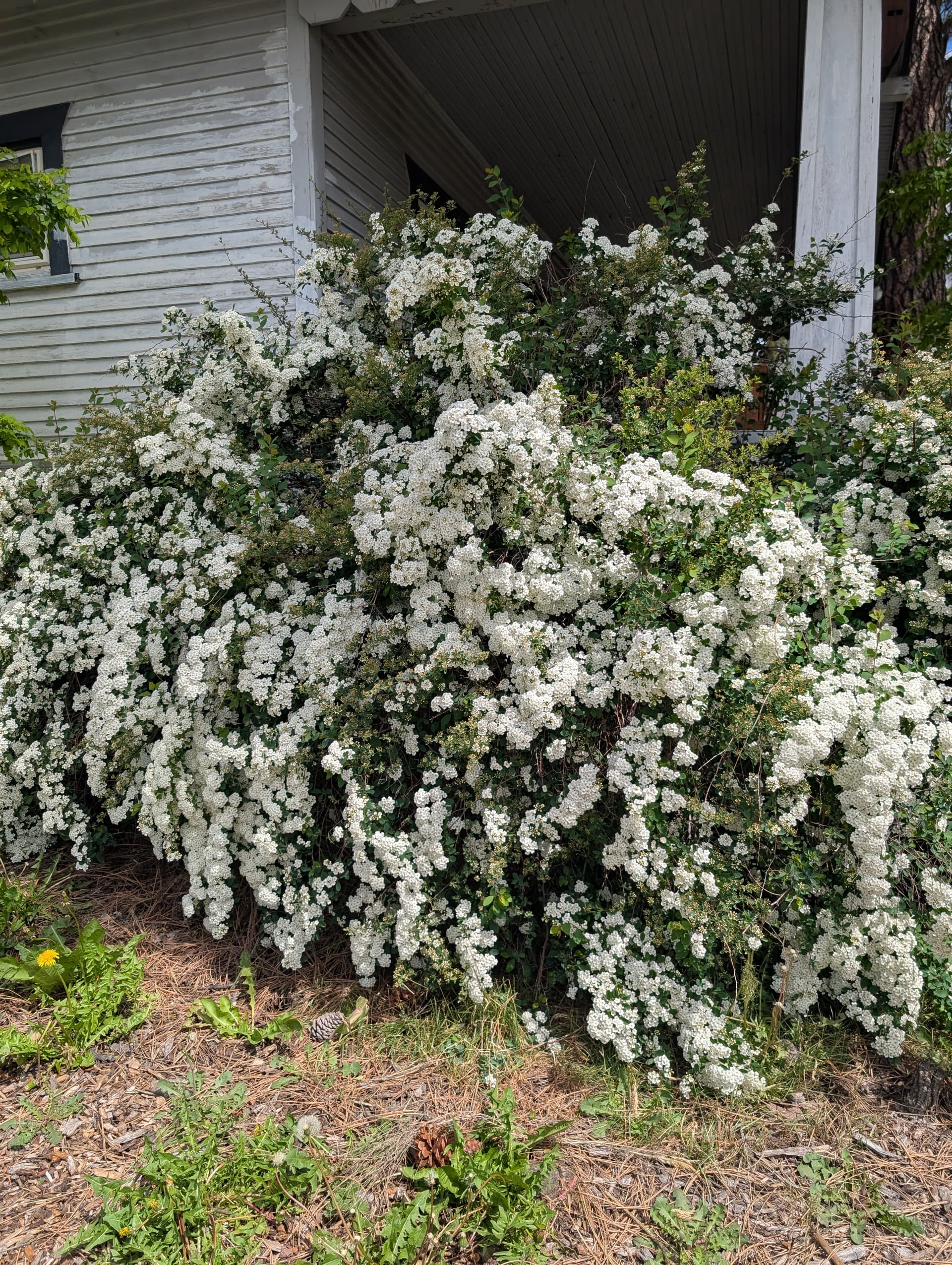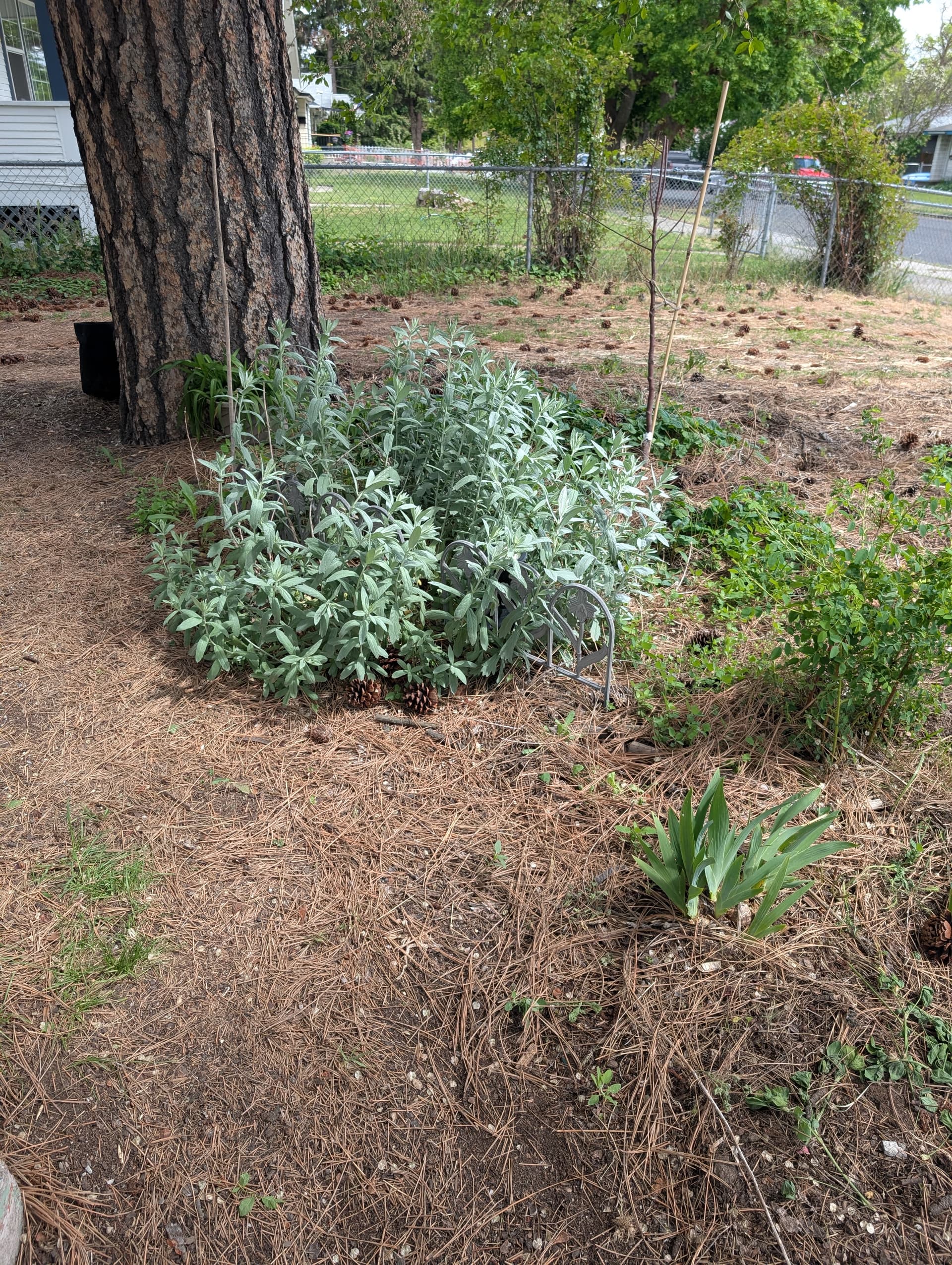 Iris, phlox, prairie sage spreading, nootka rose, bridal veil eating the porch