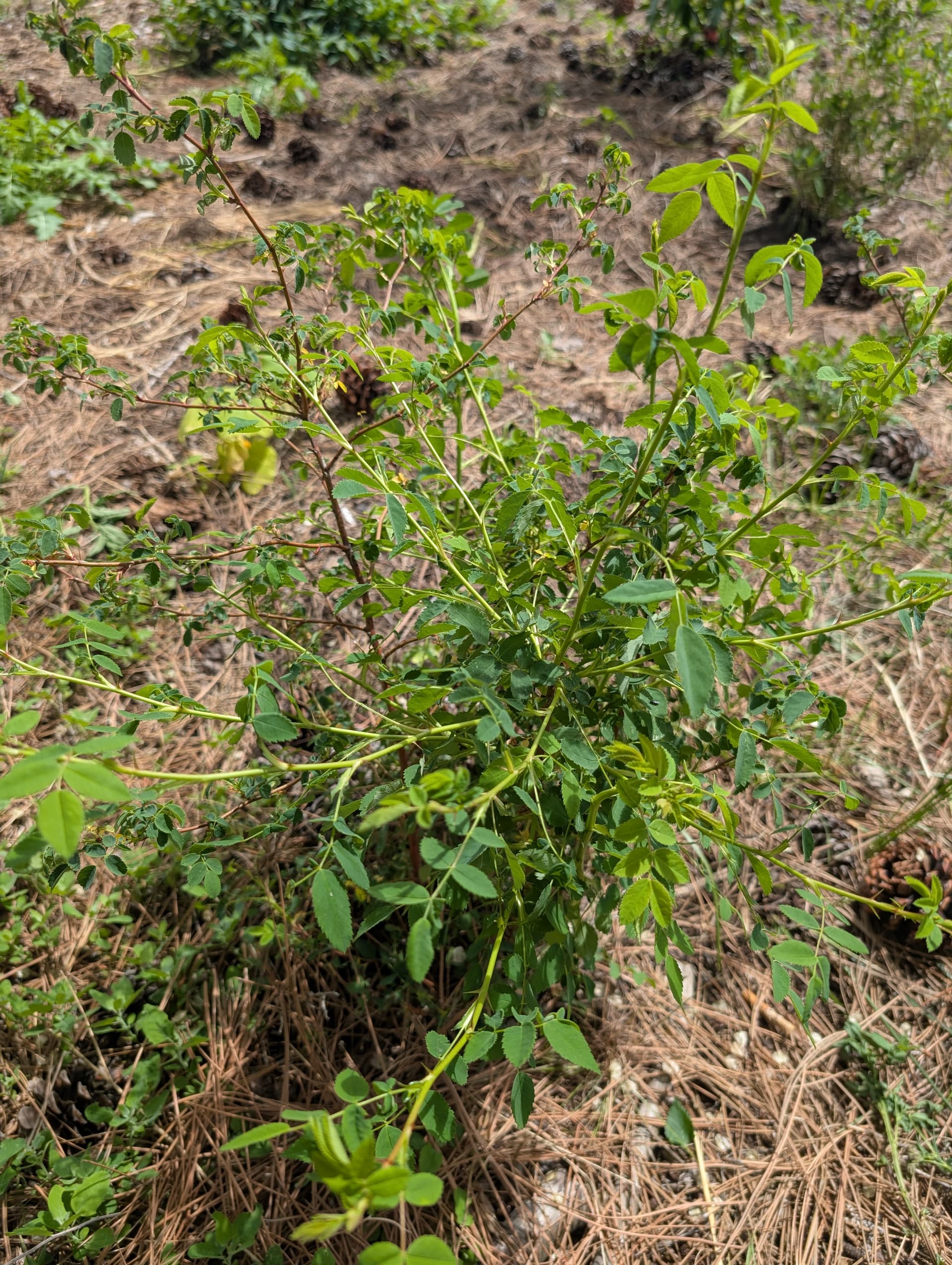 Illinois mulberries leafing out, golden currant, black lace elderberry, a dusty miller that survived the entire winter all alone, and nootka rose spreading out thankfully