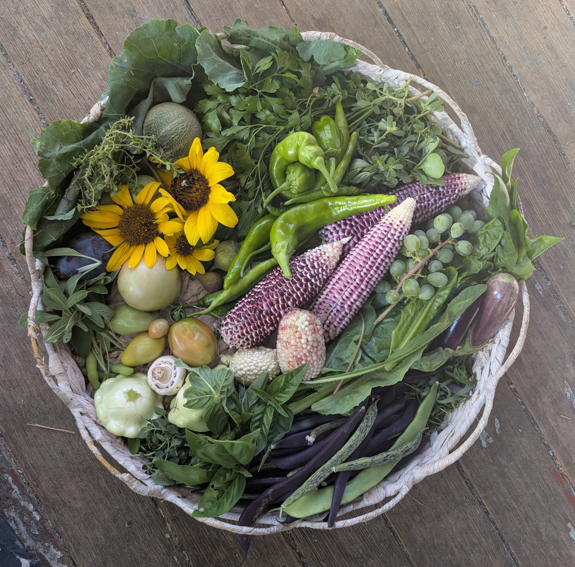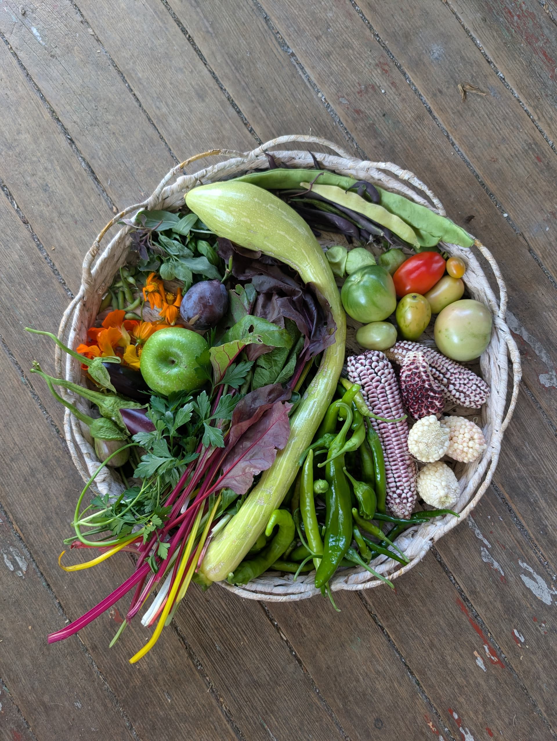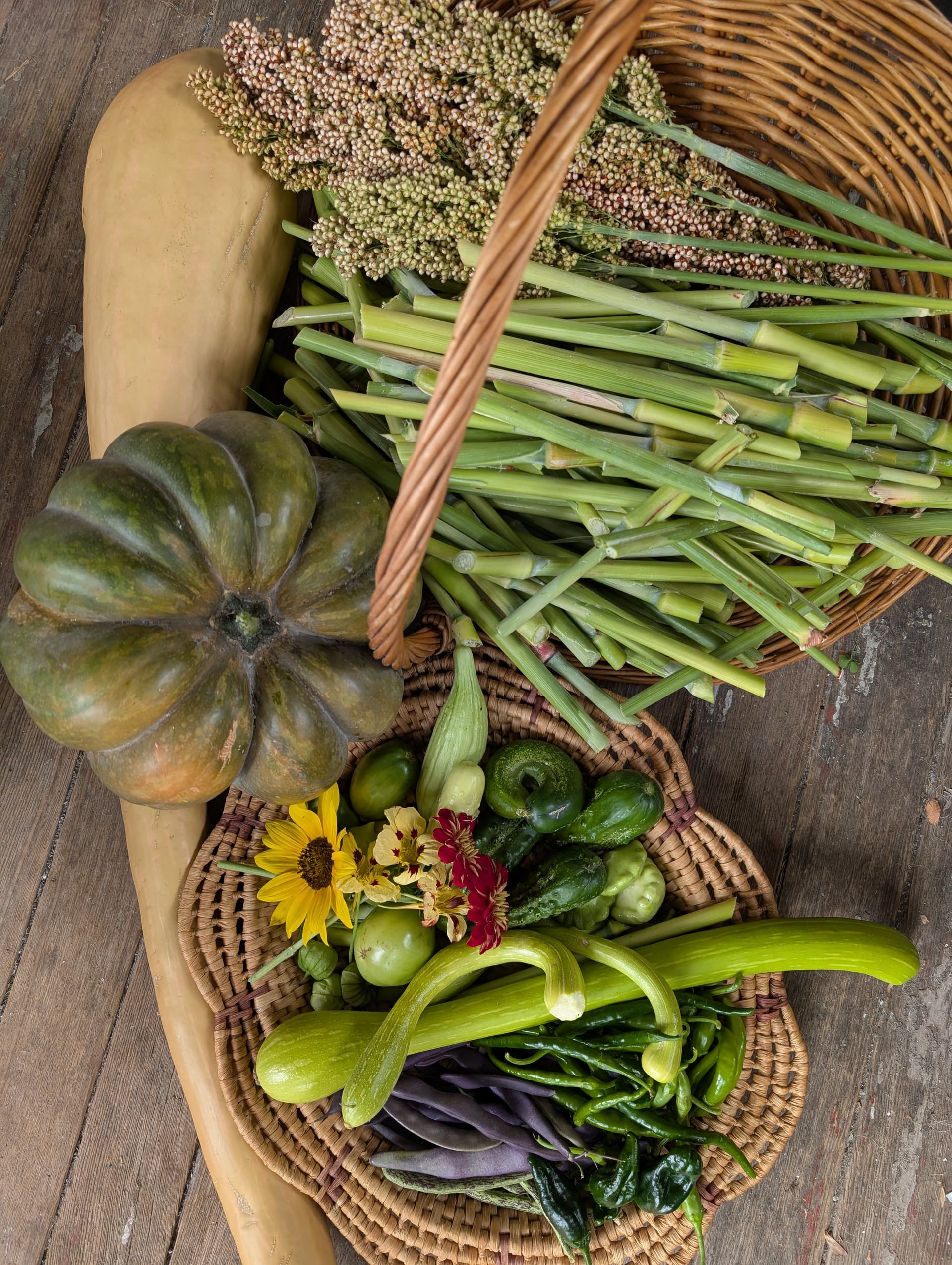 seeds: my landrace sorghum (variable height, uniformly sweet stalks for syrup, white to red grains), “anji sunflower” (titans, multi headed short ones with large seeds, and Mongolian all mixed together on year 3, drought proof), sand cherry, red corn (a cross of bloody butcher with red popcorn. it makes red red popcorn), tromboncino (second year saving seed), 3rd generation self seeding orach (mix of red and green, leaves the size of my head), landraced candy roaster/banana squash. yarrow. marigold. white hollyhock.