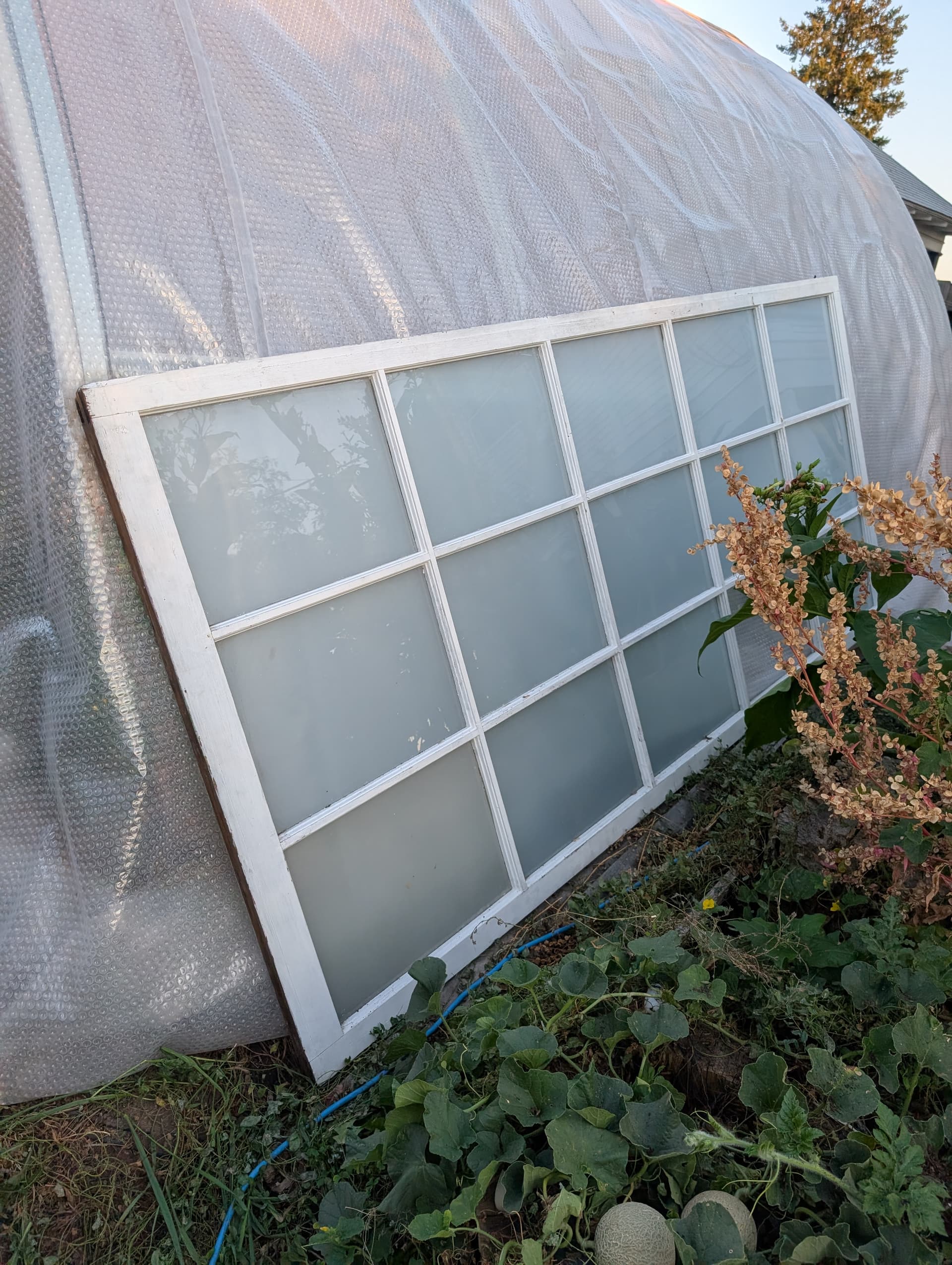 the lid for this cold frame (?) is an old barn window with panes that measures 8’ 5" by 4’ 1"
