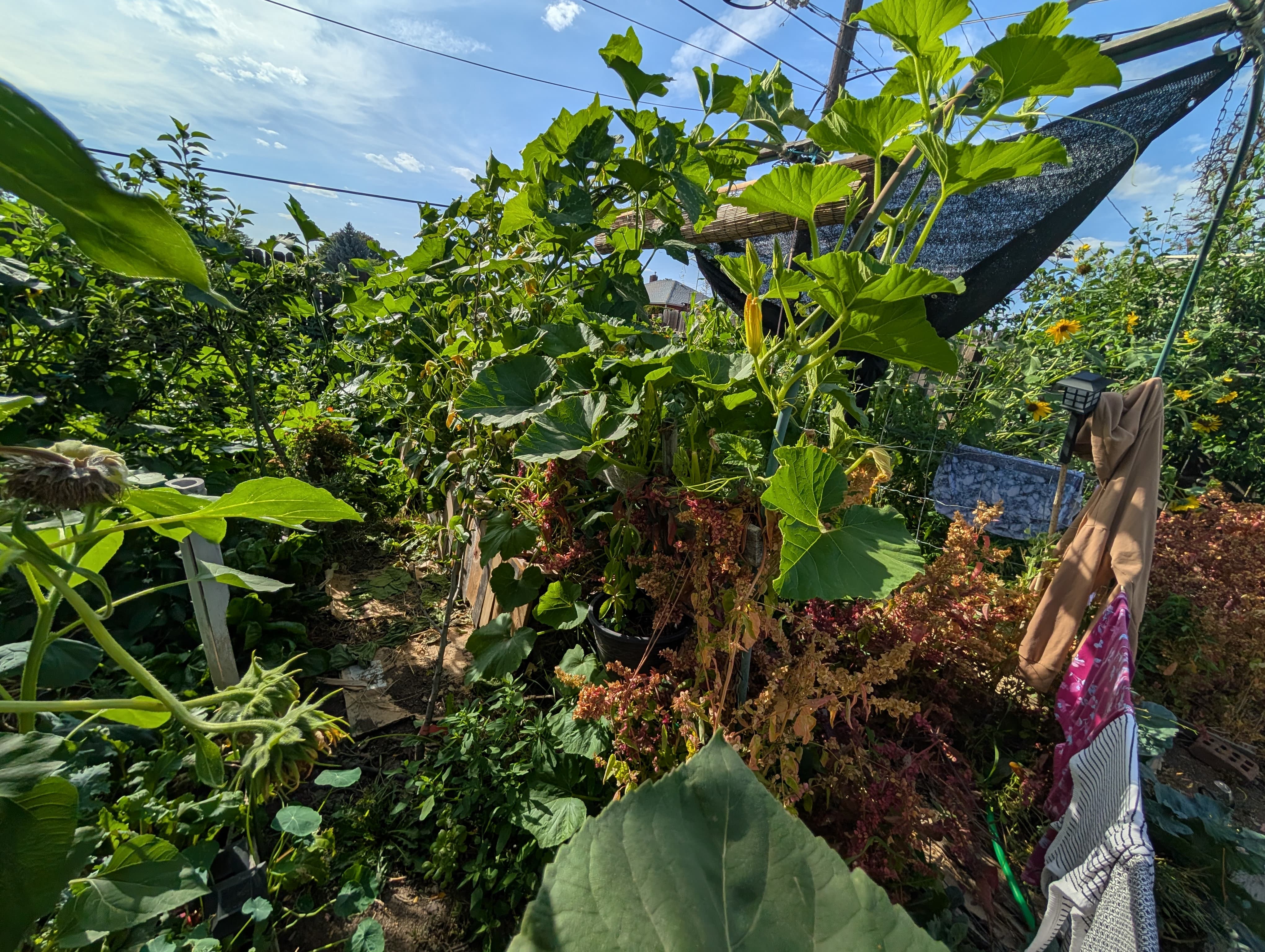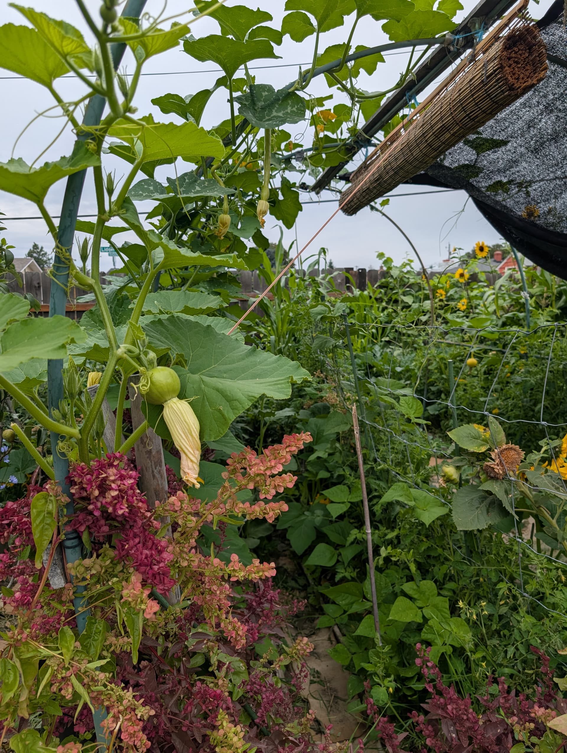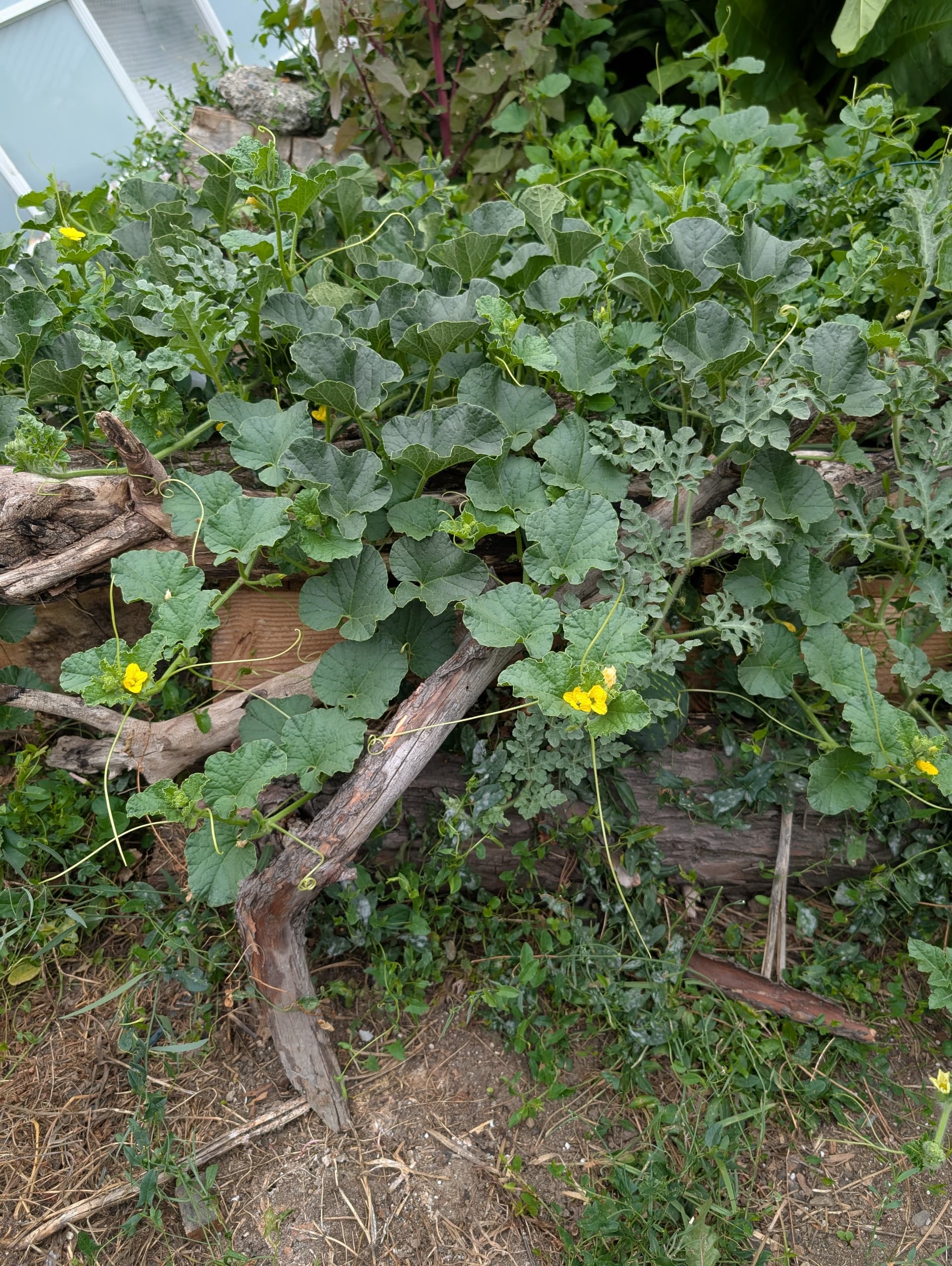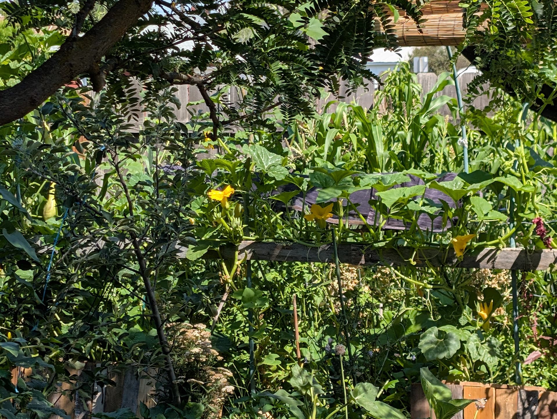winter squash have made it over the top to the ground on the other side in two places. tromboncino are most of the big leaves