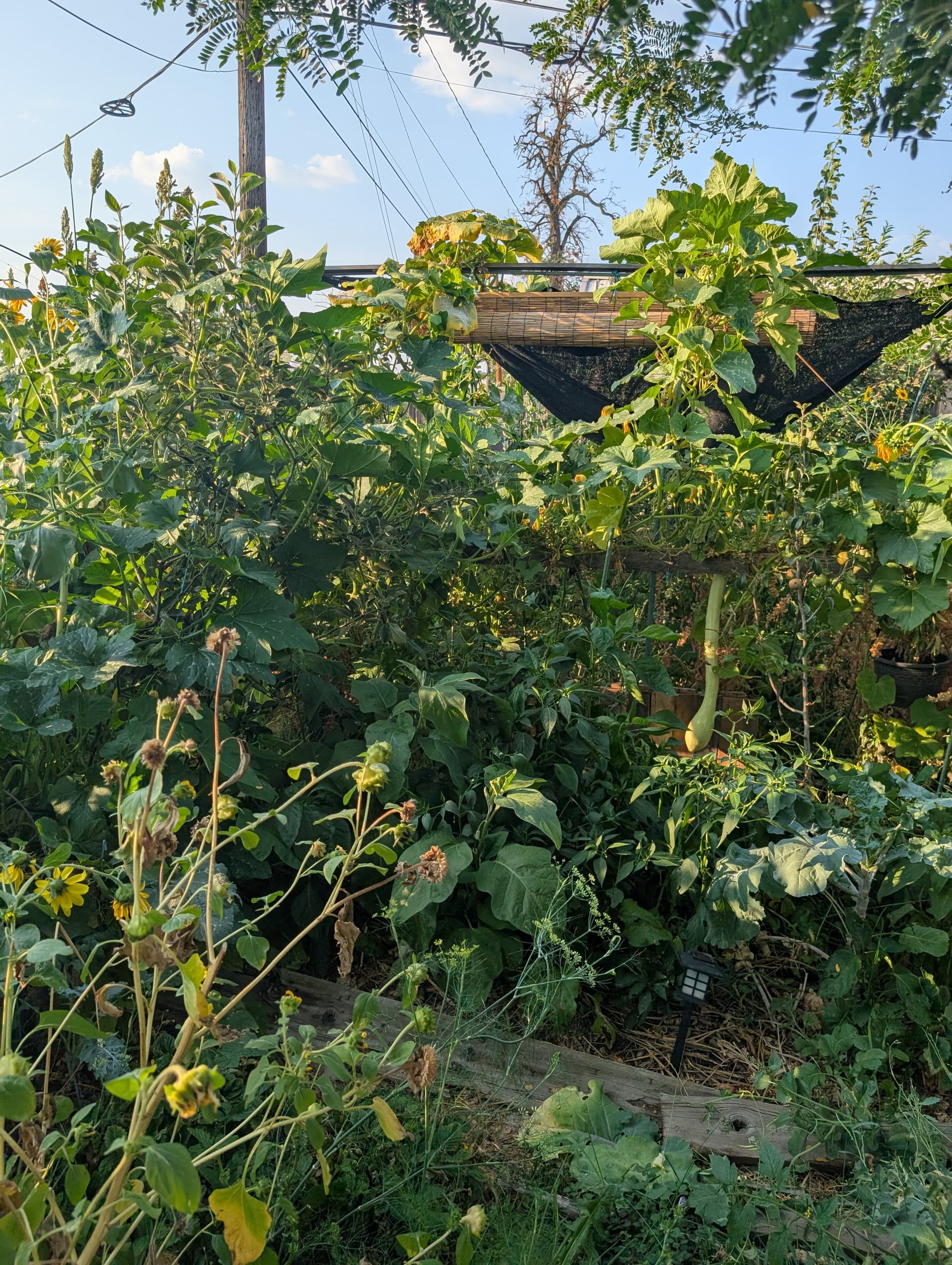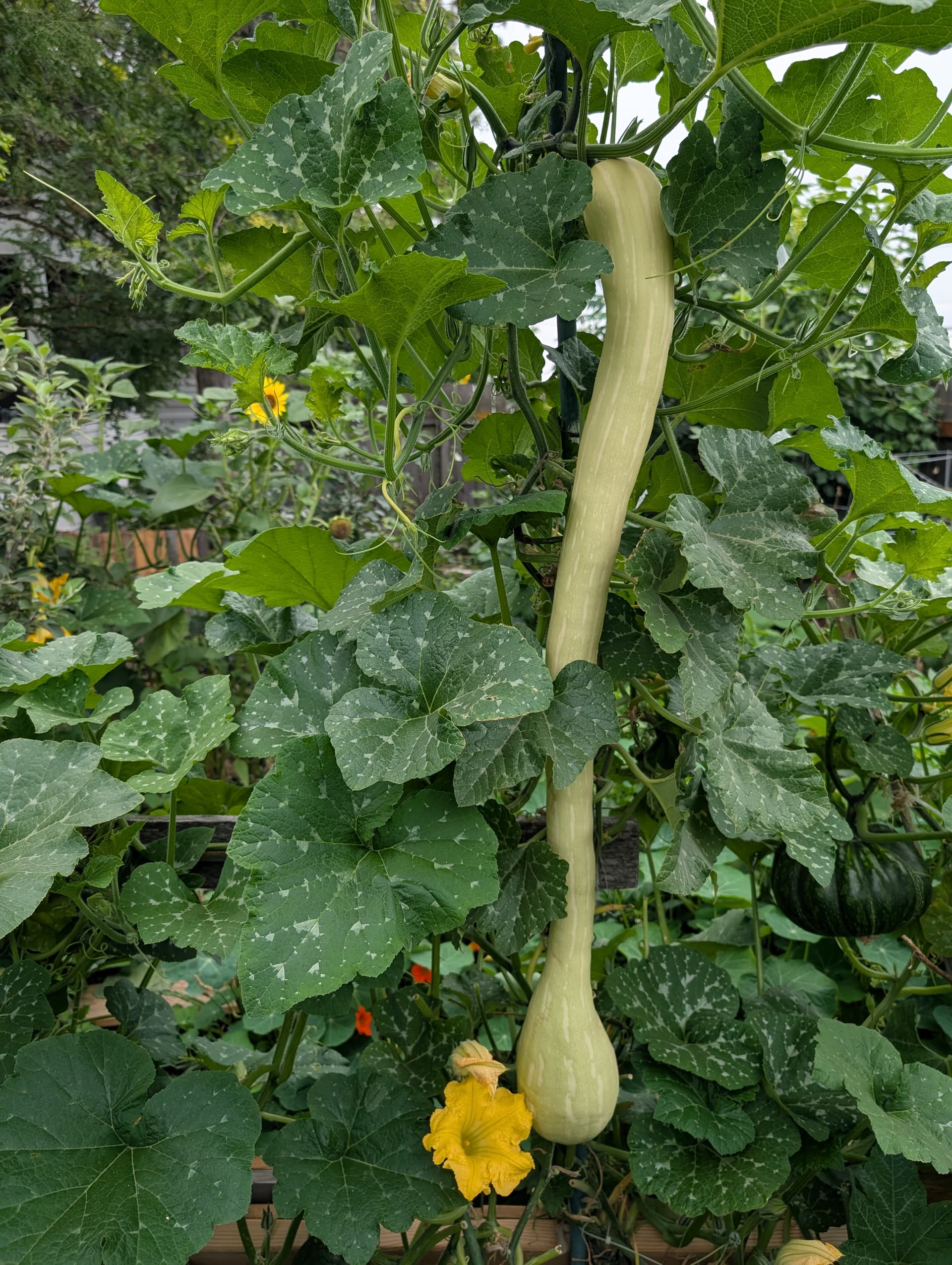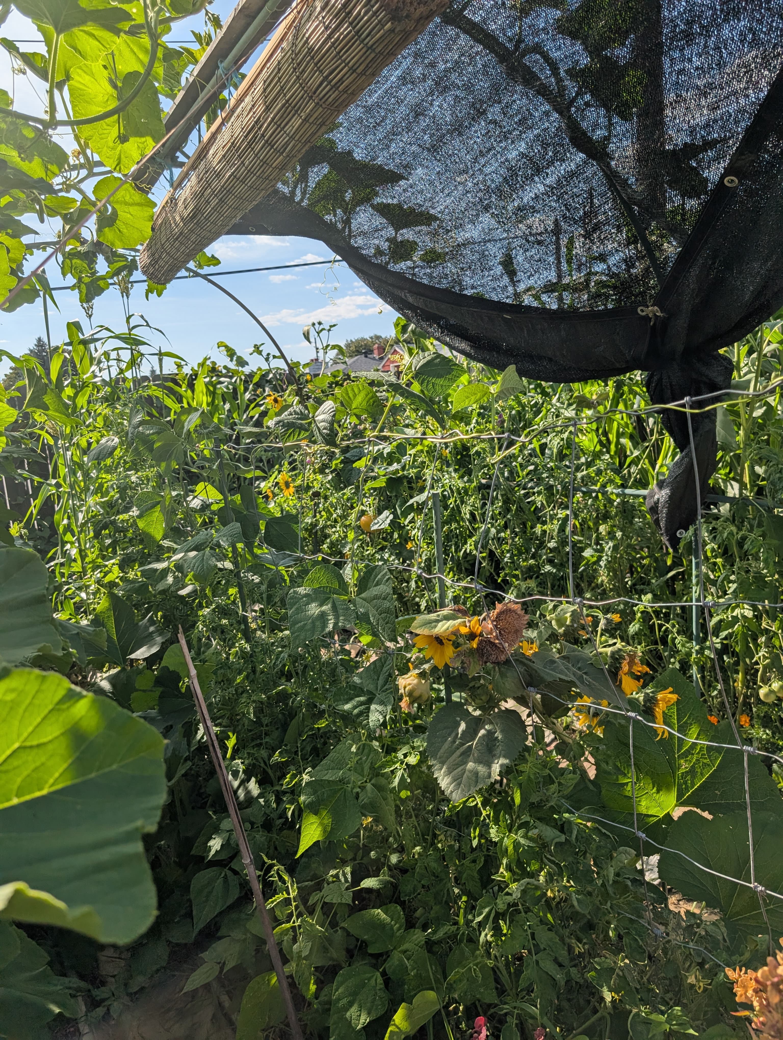winter squash have made it over the top to the ground on the other side in two places. tromboncino are most of the big leaves