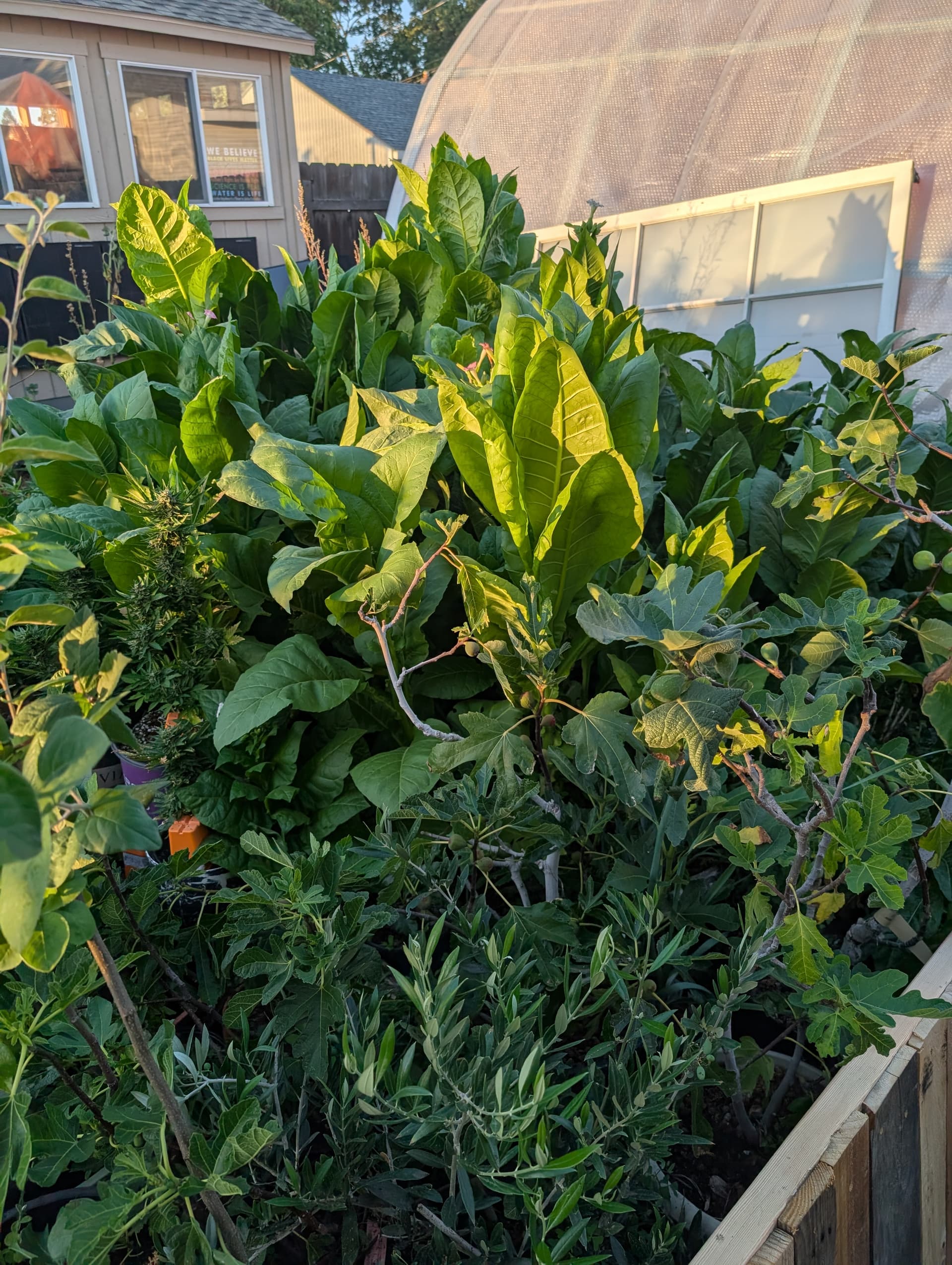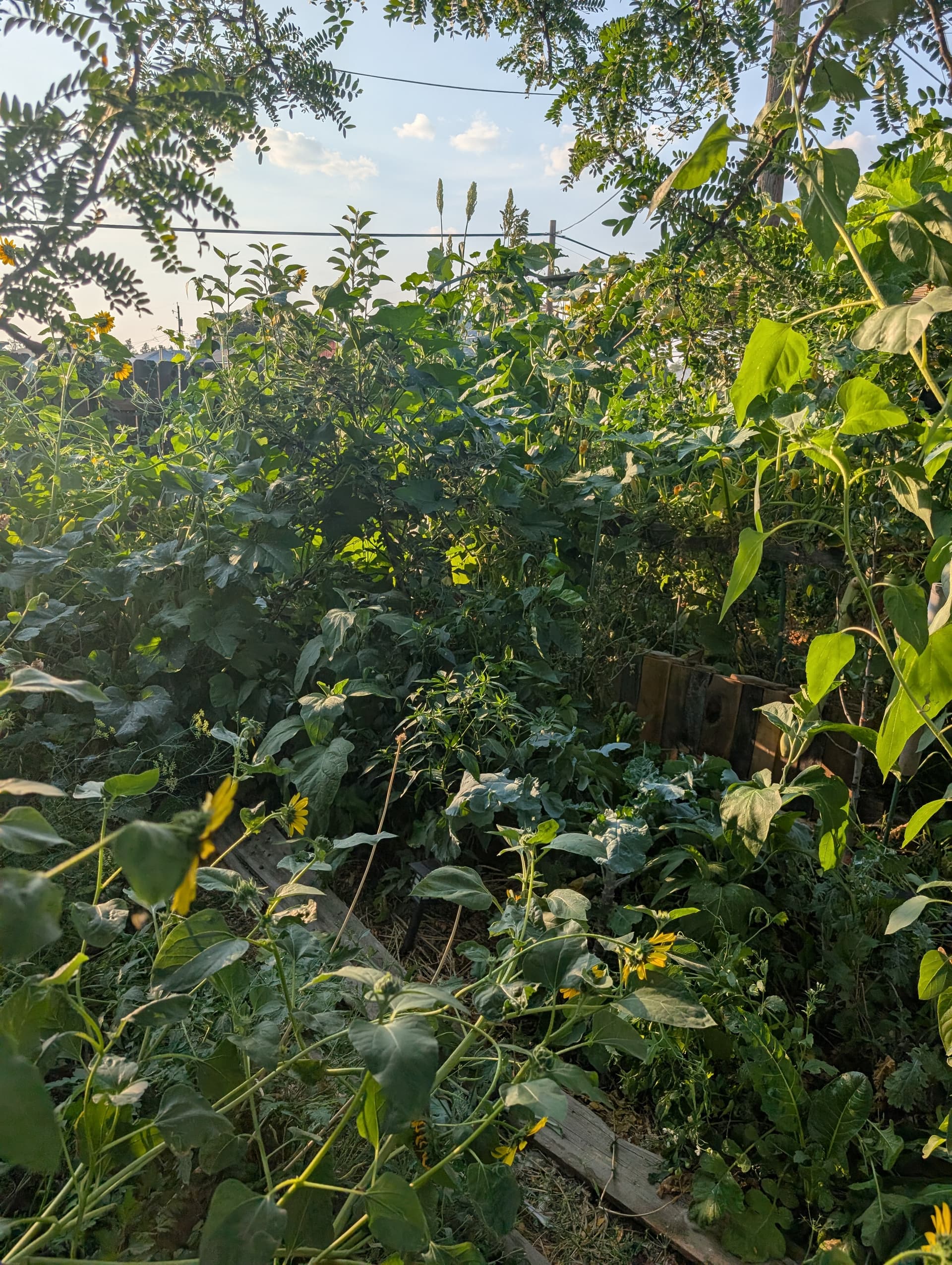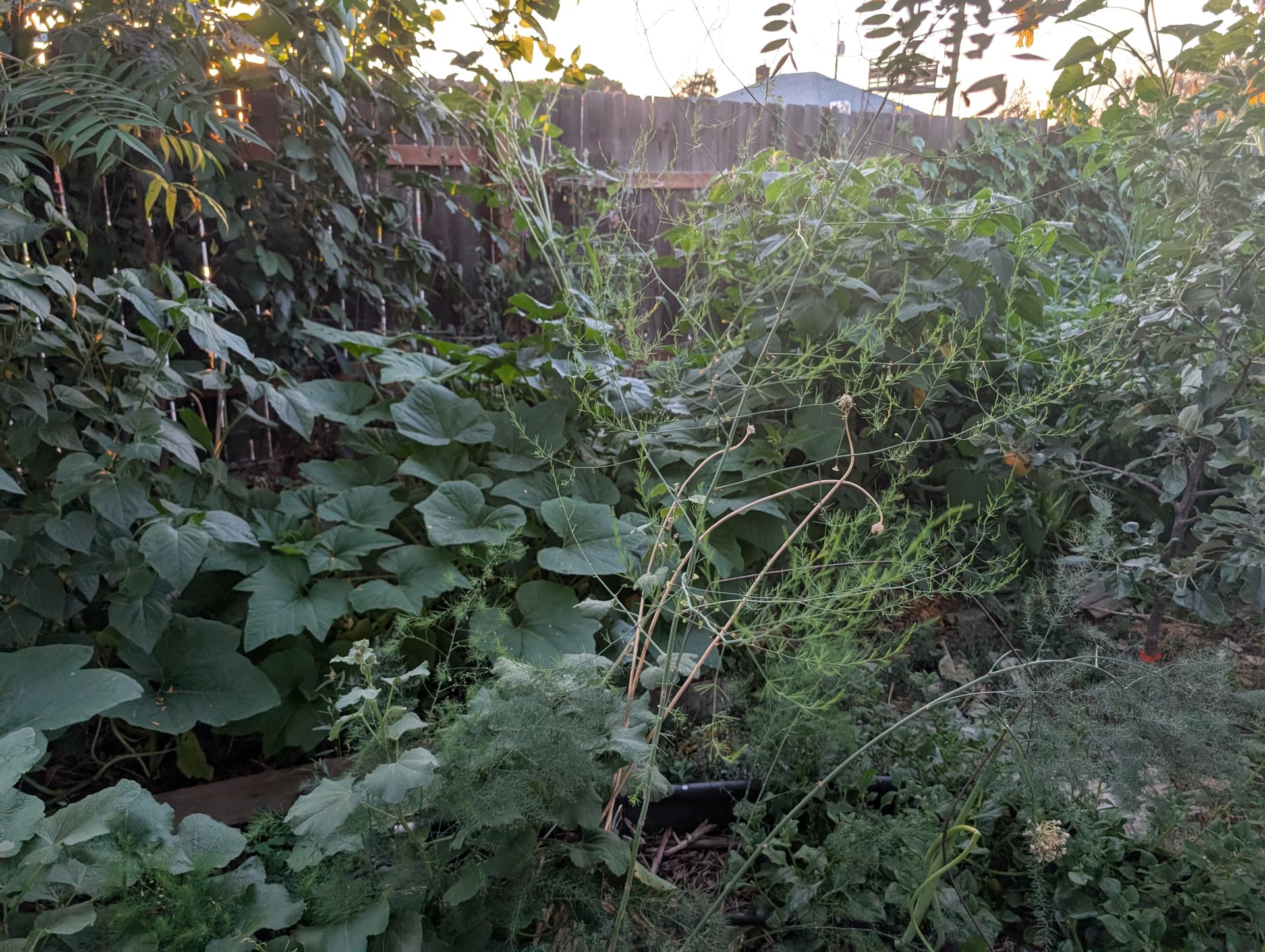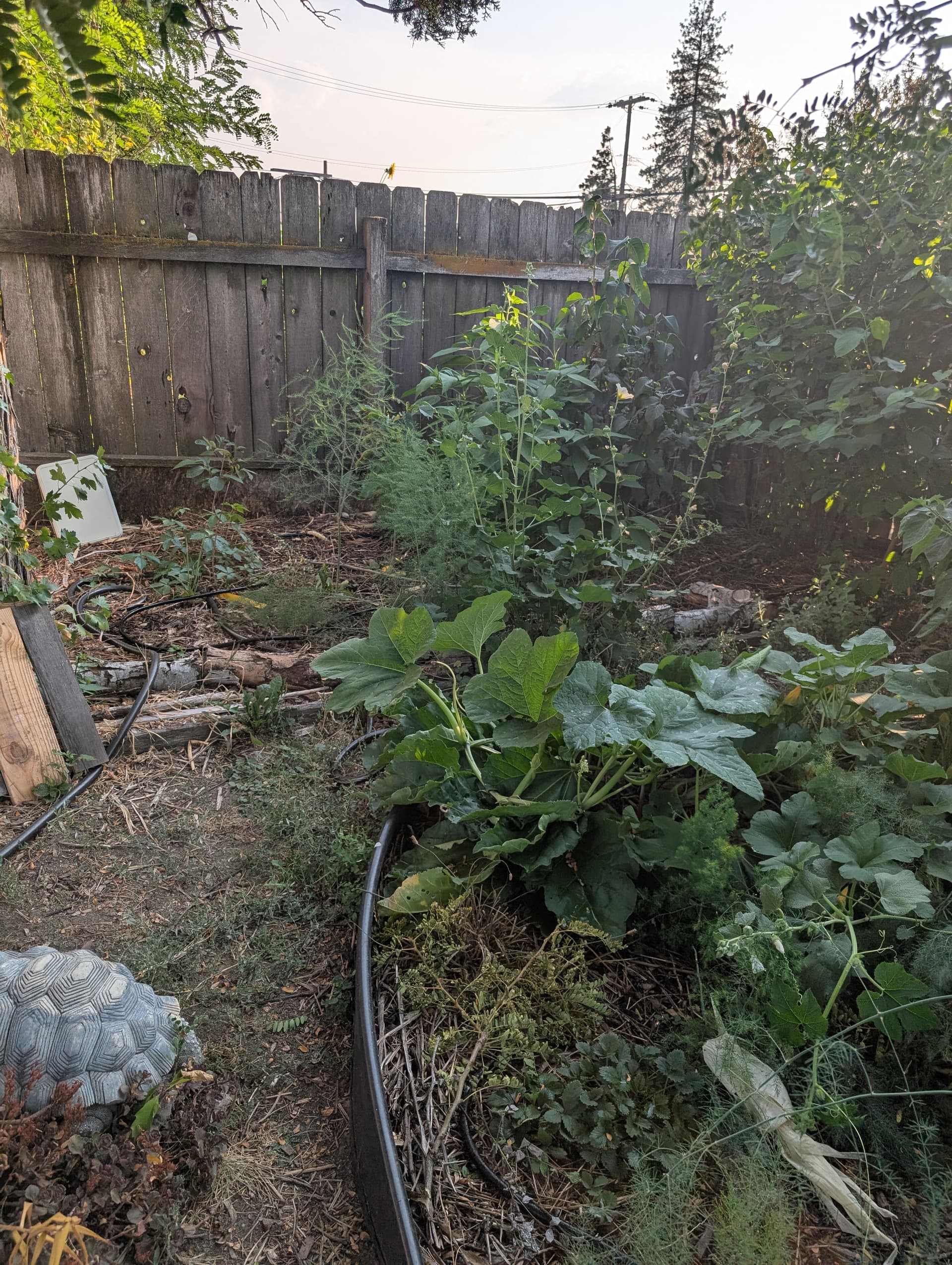 winter squash have made it over the top to the ground on the other side in two places. tromboncino are most of the big leaves