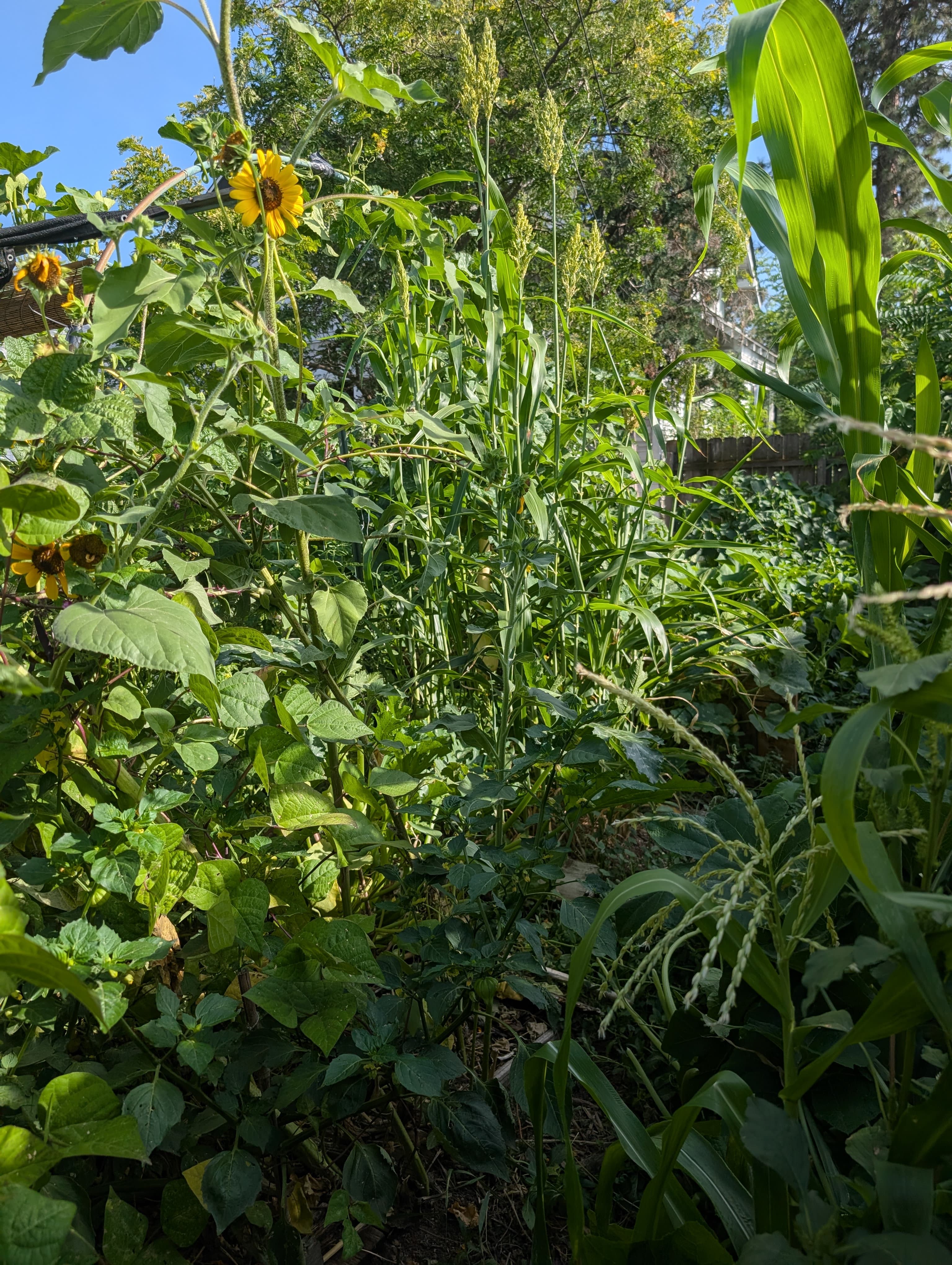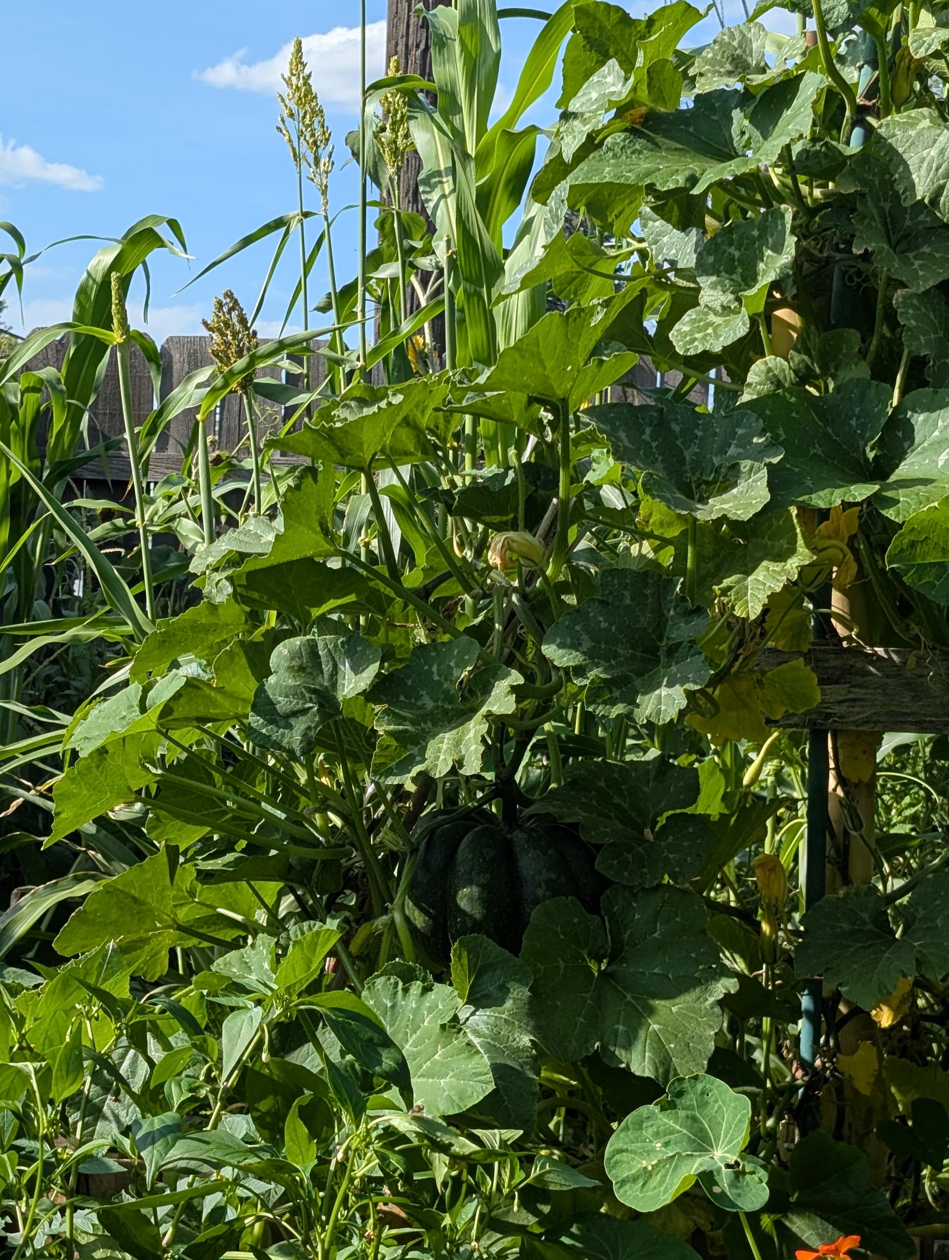 tromboncino have taken over, corn has had its silk and is starting to fatten. the short corn has only a few very small cobs though. sorghum heads are opening. summer squash just starting. a few cukes only.