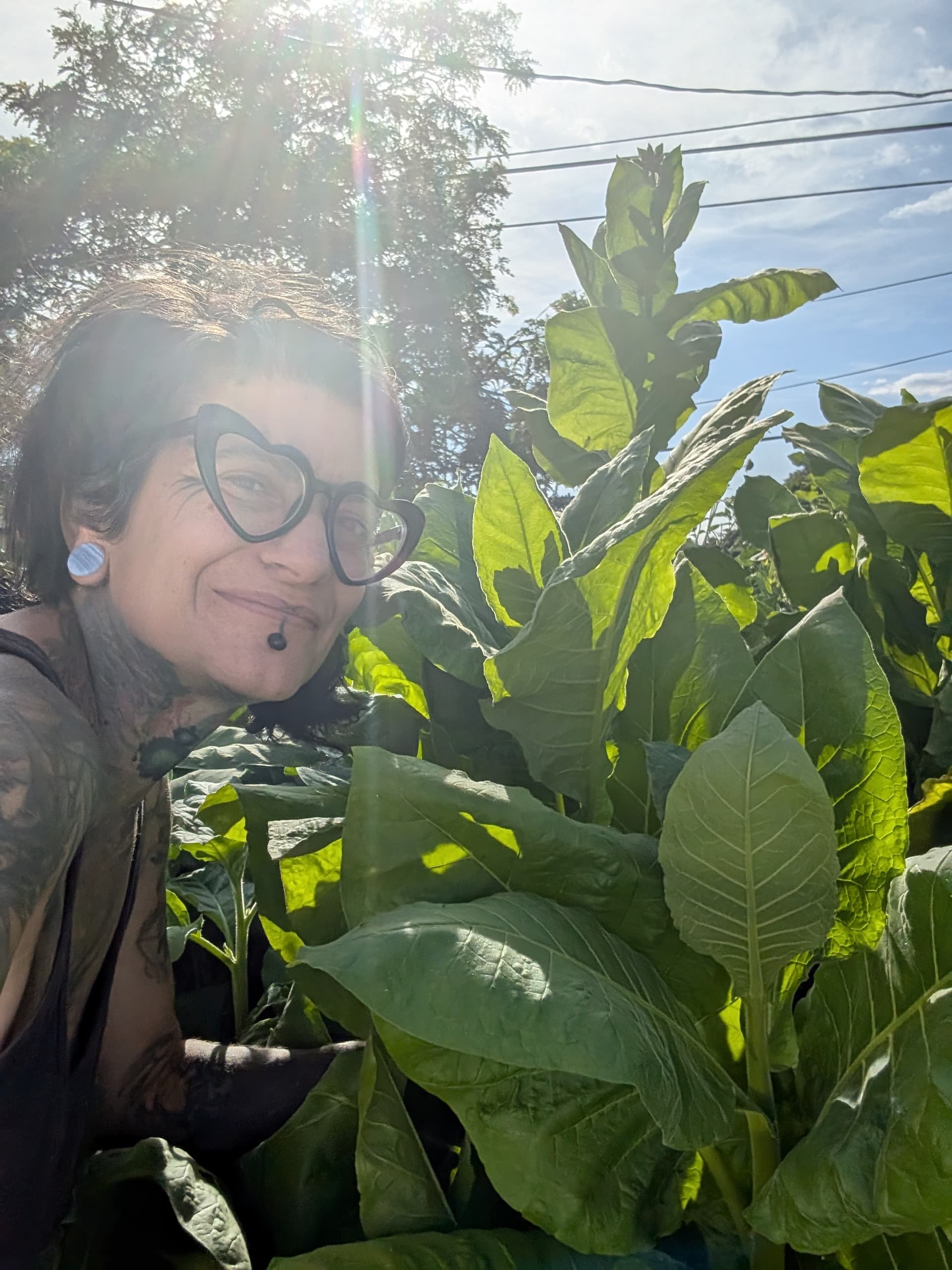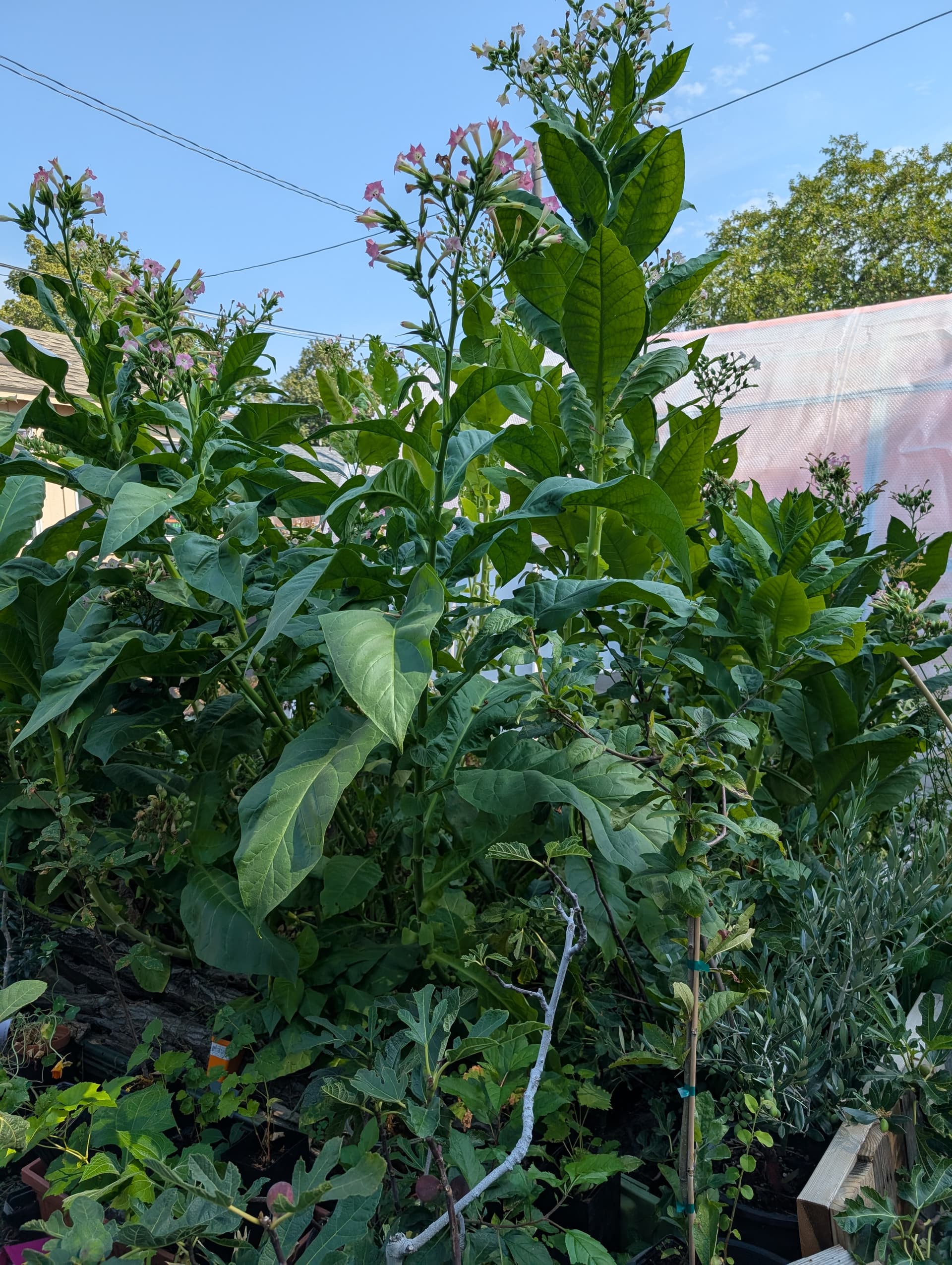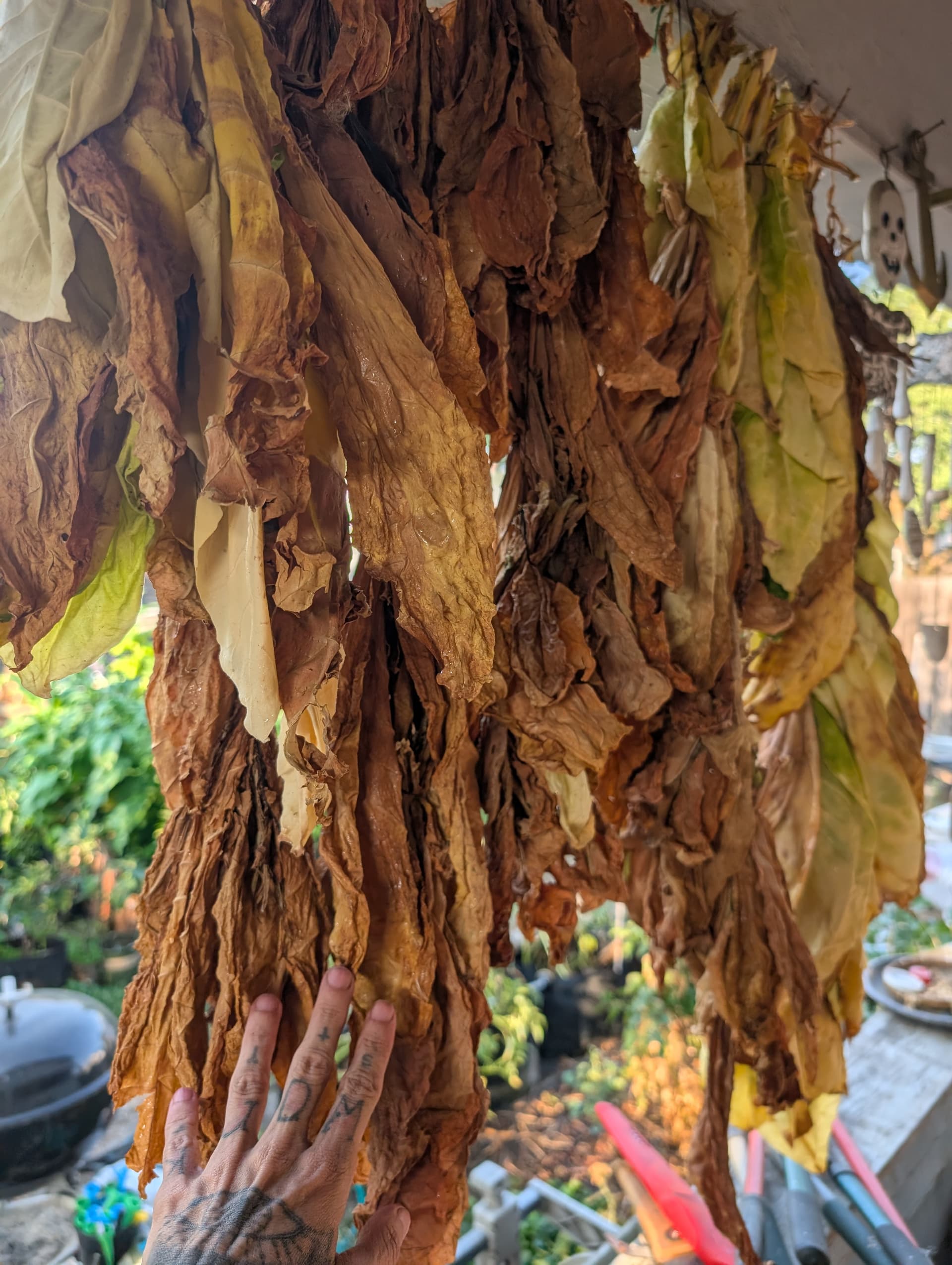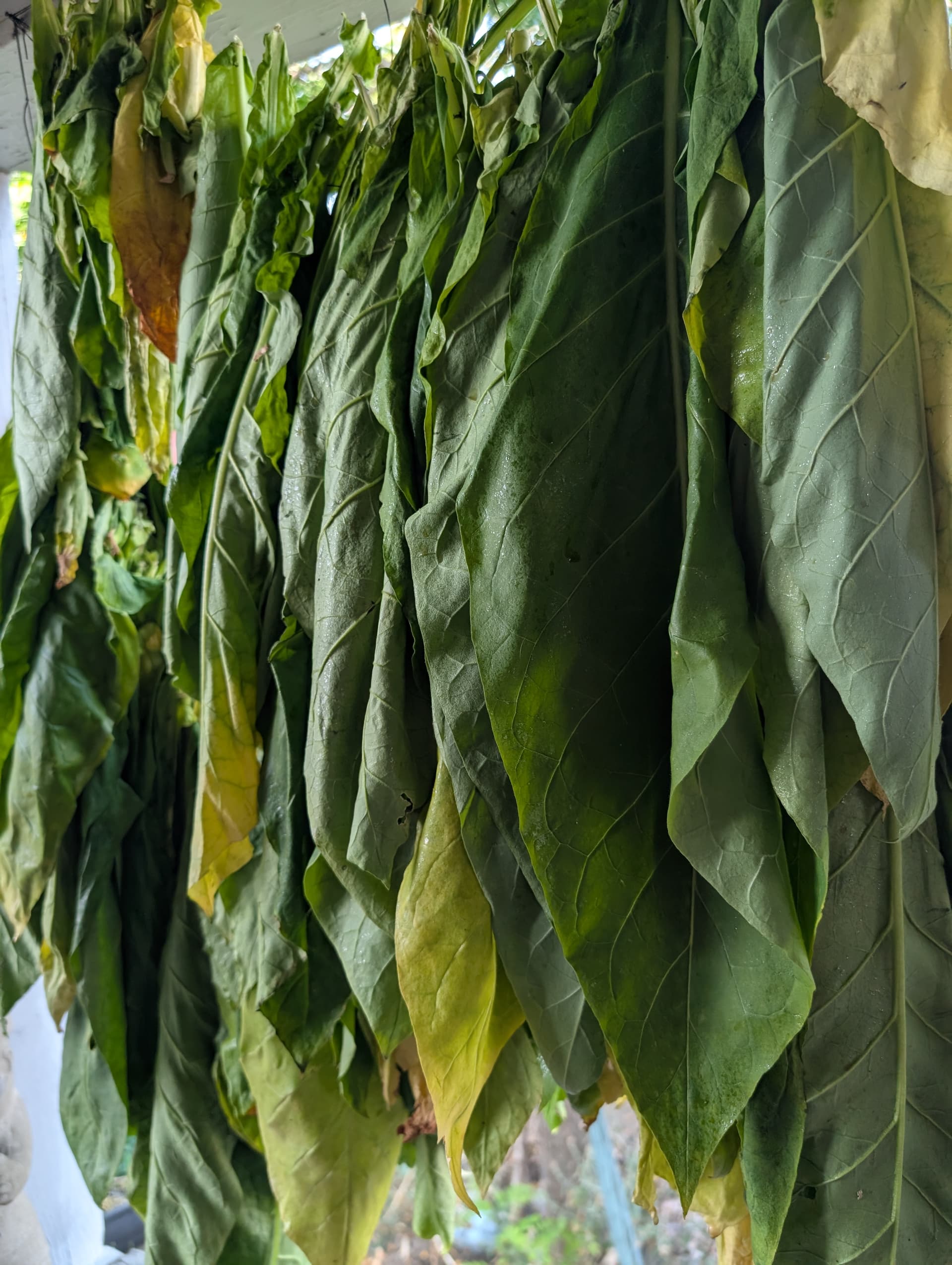 tobacco is big; collected seed from the biggest leaved plants that i let go to flower, have been pulling an armload to cure every few days