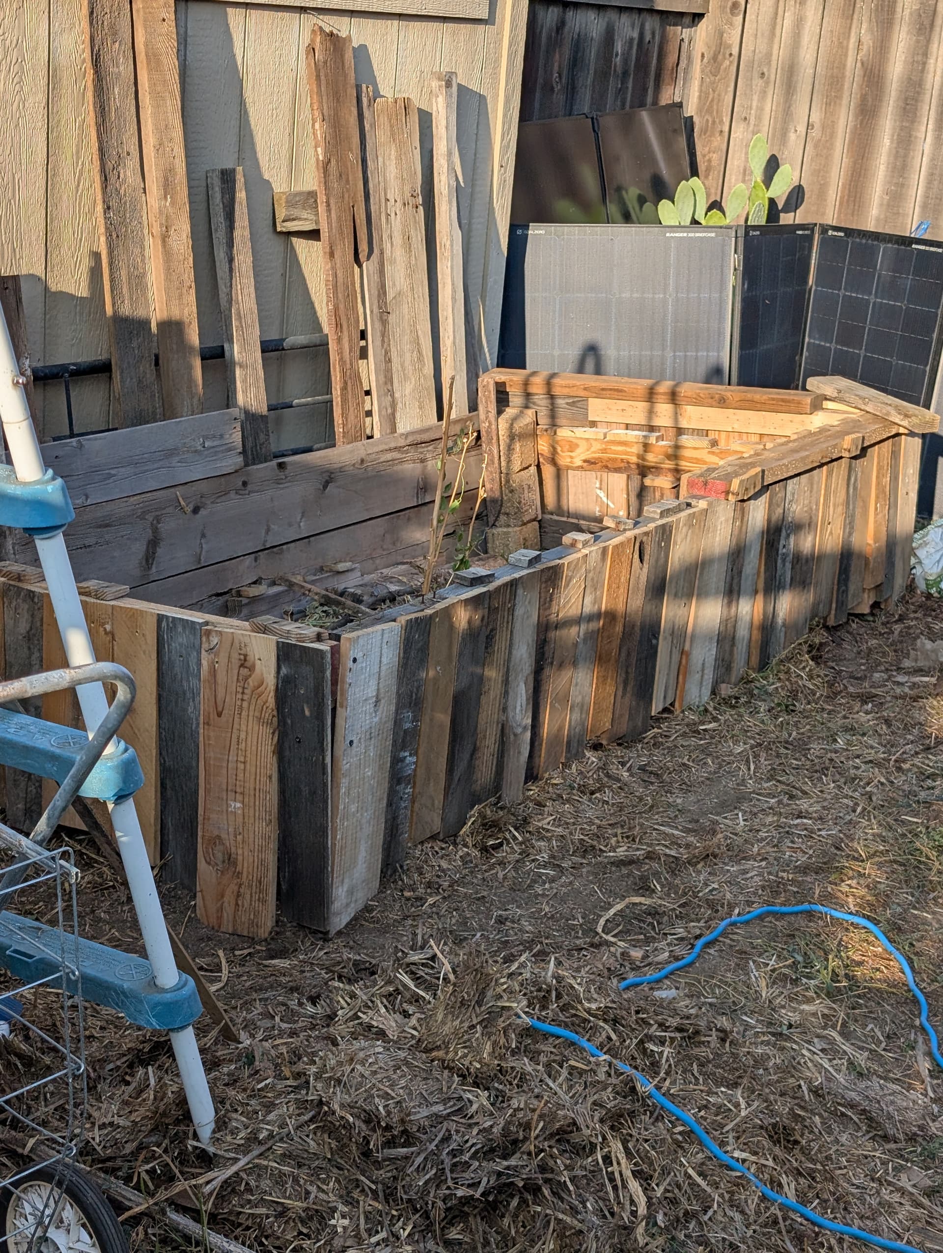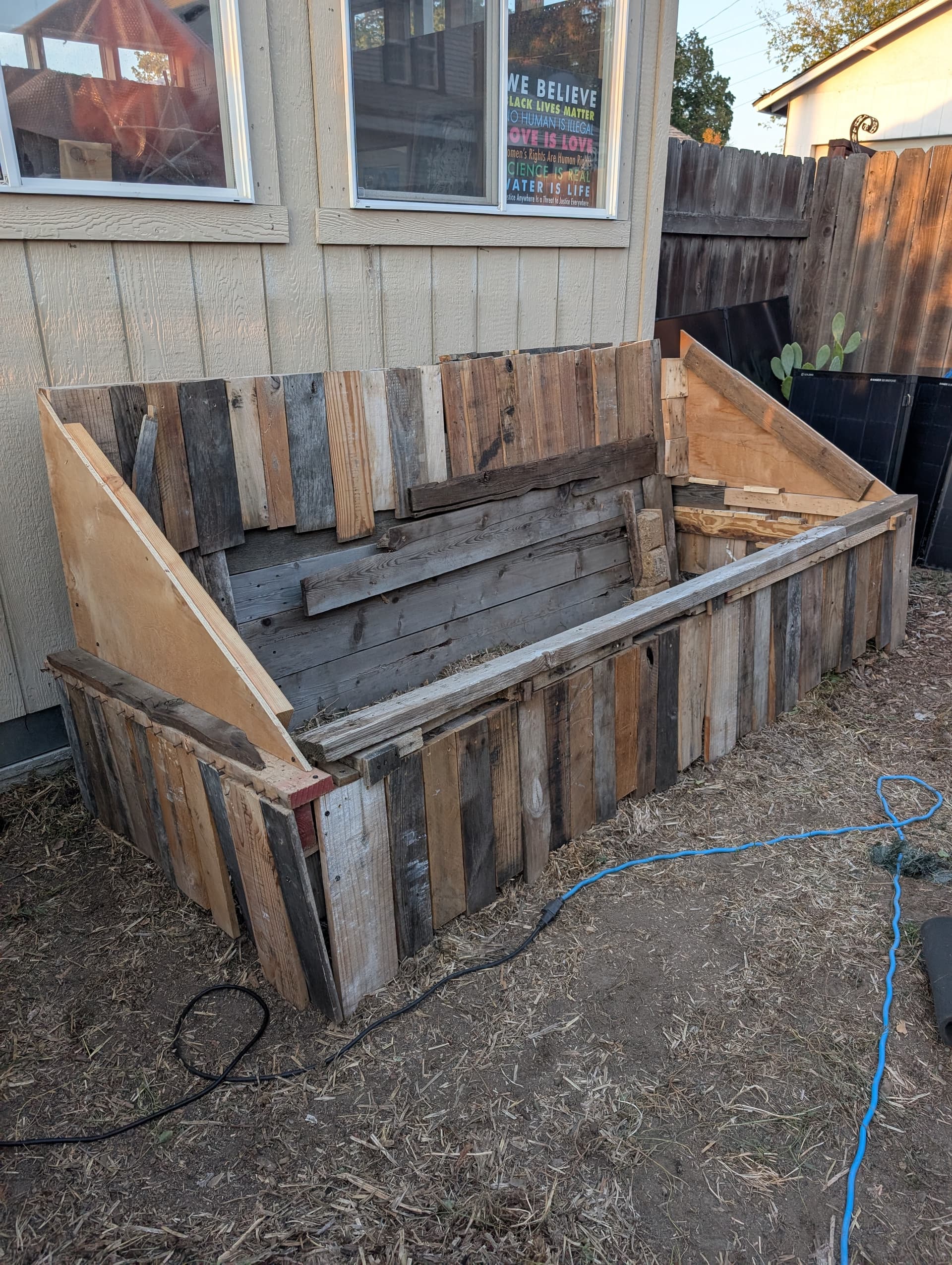 why is it that size? i don’t know. i have big hinges for the back. and a cool big handle for the front. and hinges for putting on boards to prop it open in summer with a catch hook and all up above. i have built the walls for the bed front and sides, I’m j just trying to keep the dirt from being up against the shed itself, about half a foot out to possibly still catch warm from it