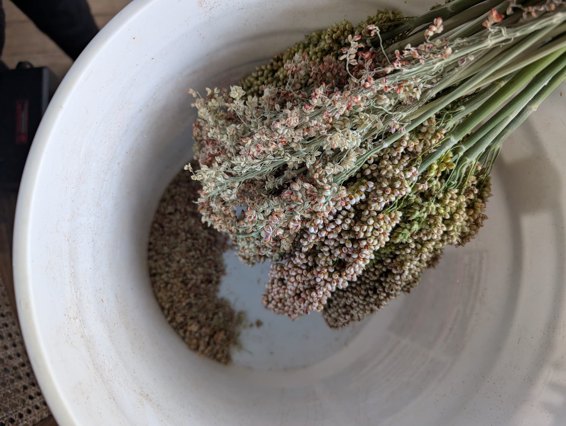 cutting, since i won’t have time before this weekend when frost arrives. i cut the tops and let them dry head down on the porch in a clean bucket to beat the grains off then winnow
