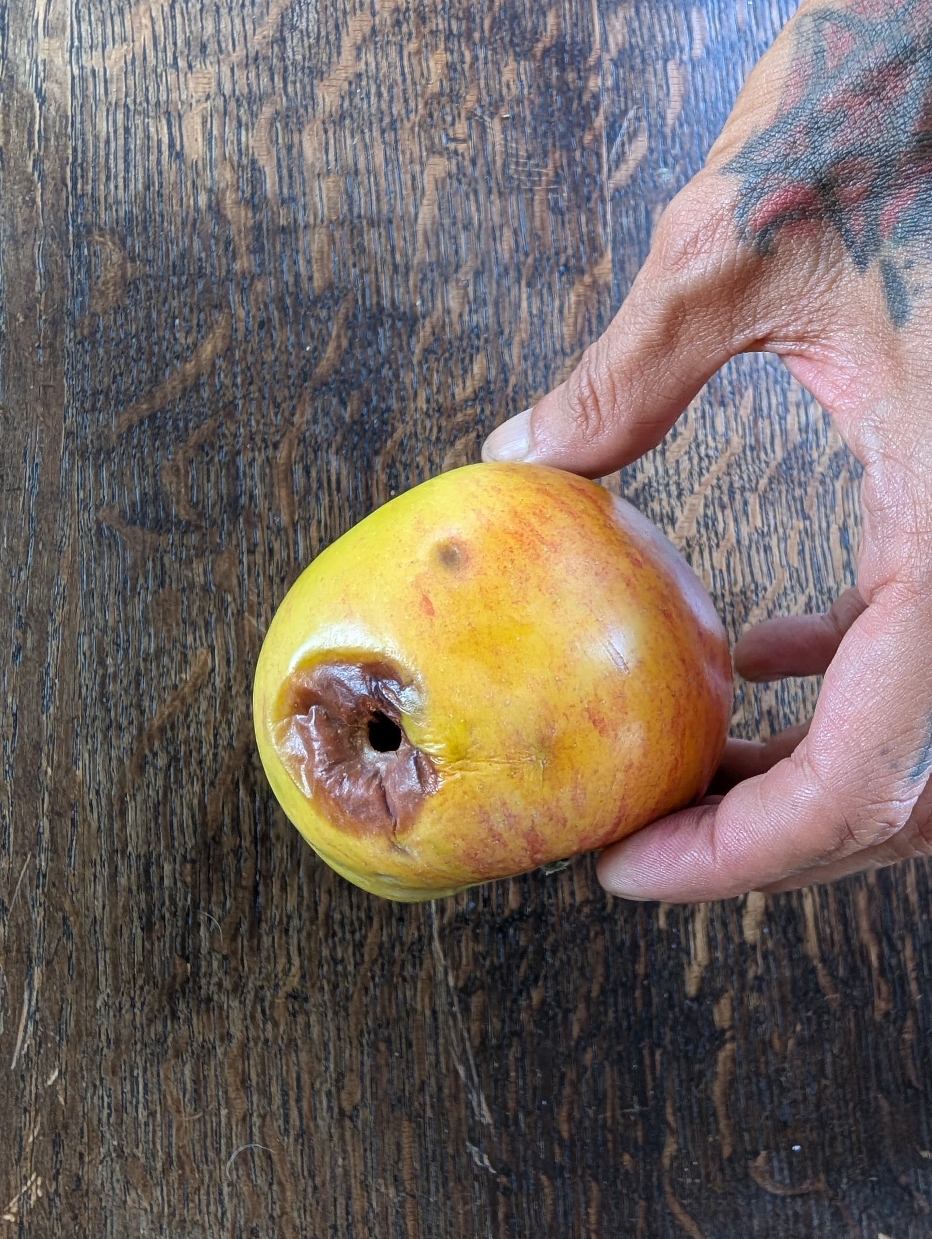 edit to add: earwigs chewing on my gravenstein and it was on the ground, fallen. it had a small bruise from bumping into a branch and they chewed it open. gonna cool it off and try it though it’s not ripe. first apple on this young tree.