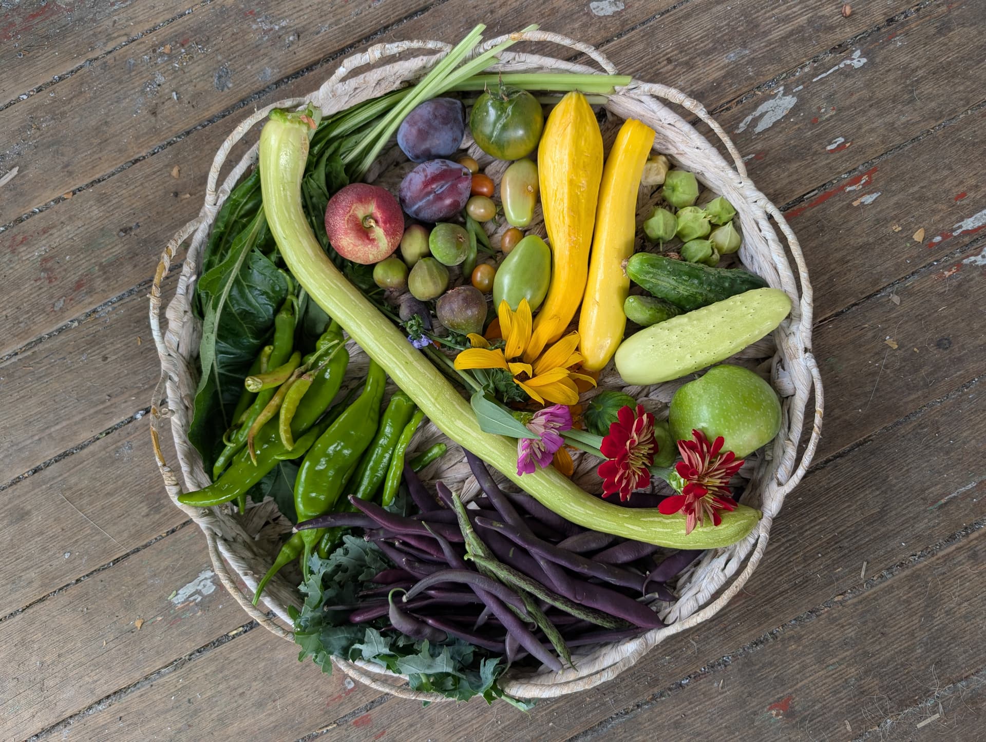 reliance peach all ripe, picked. trailman apple all ripe and picked. Italian plums no, winter apple and chestnut no, Whitney picked and sitting to sweeten up, Van Buren grapes also small and a bit stringent still. first mashed potato/sweet potato squash pulled