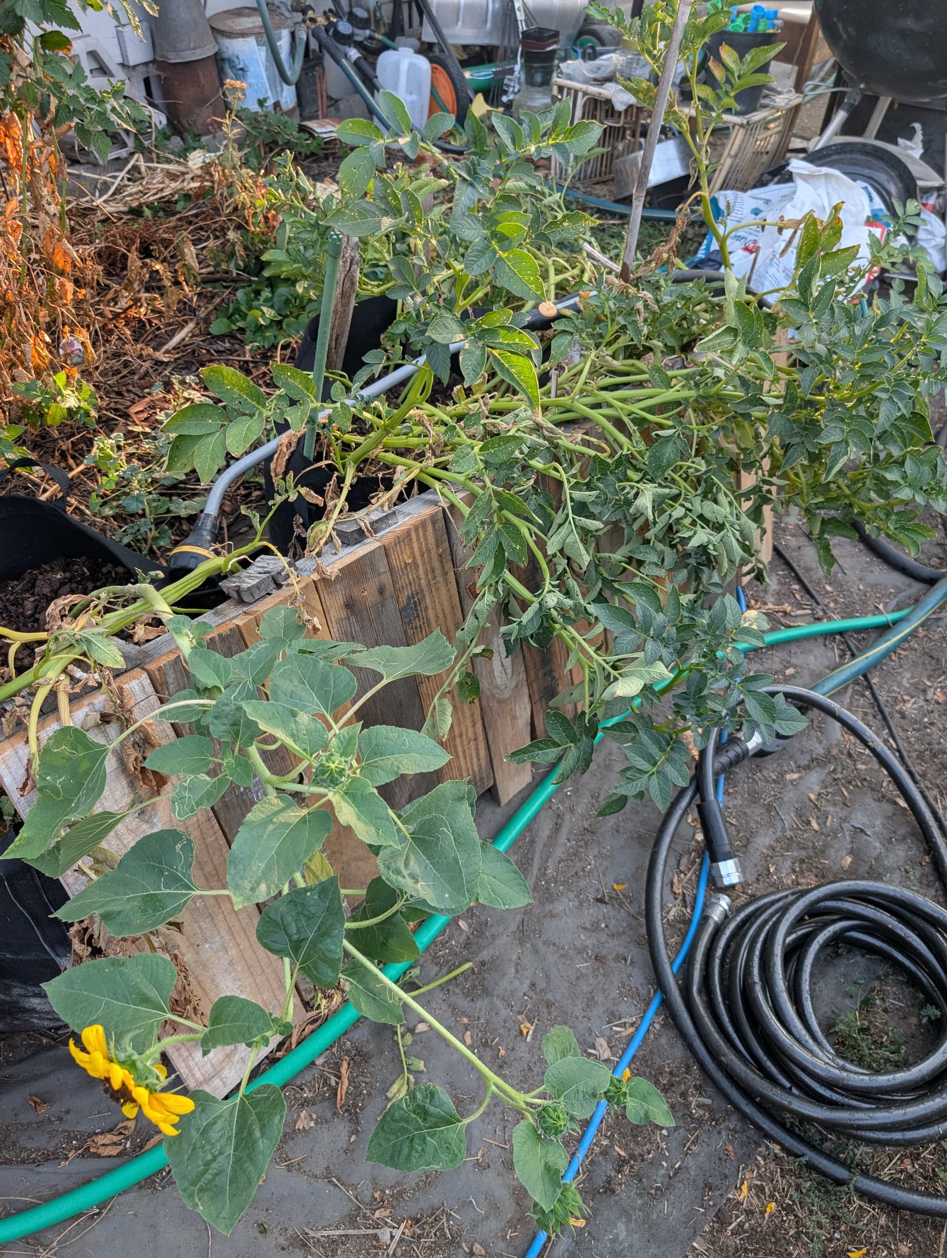 first batch of main potatoes should be ready soon. sweet potatoes flowering and vining nicely. Meyer lemons fattening up. there’s a bitttermelon forming! winter melon and some candy roasters falling off unpollinated sadly.