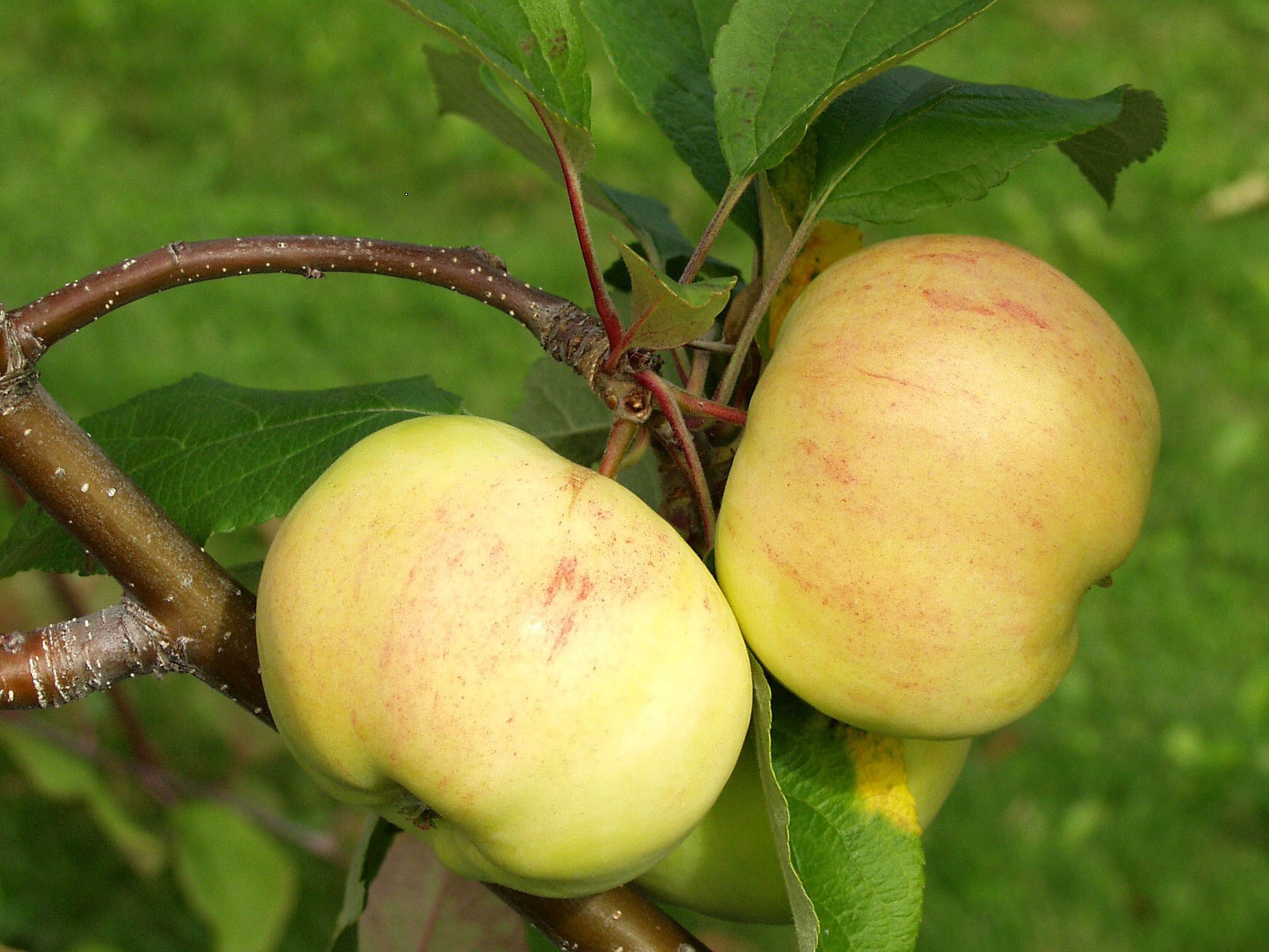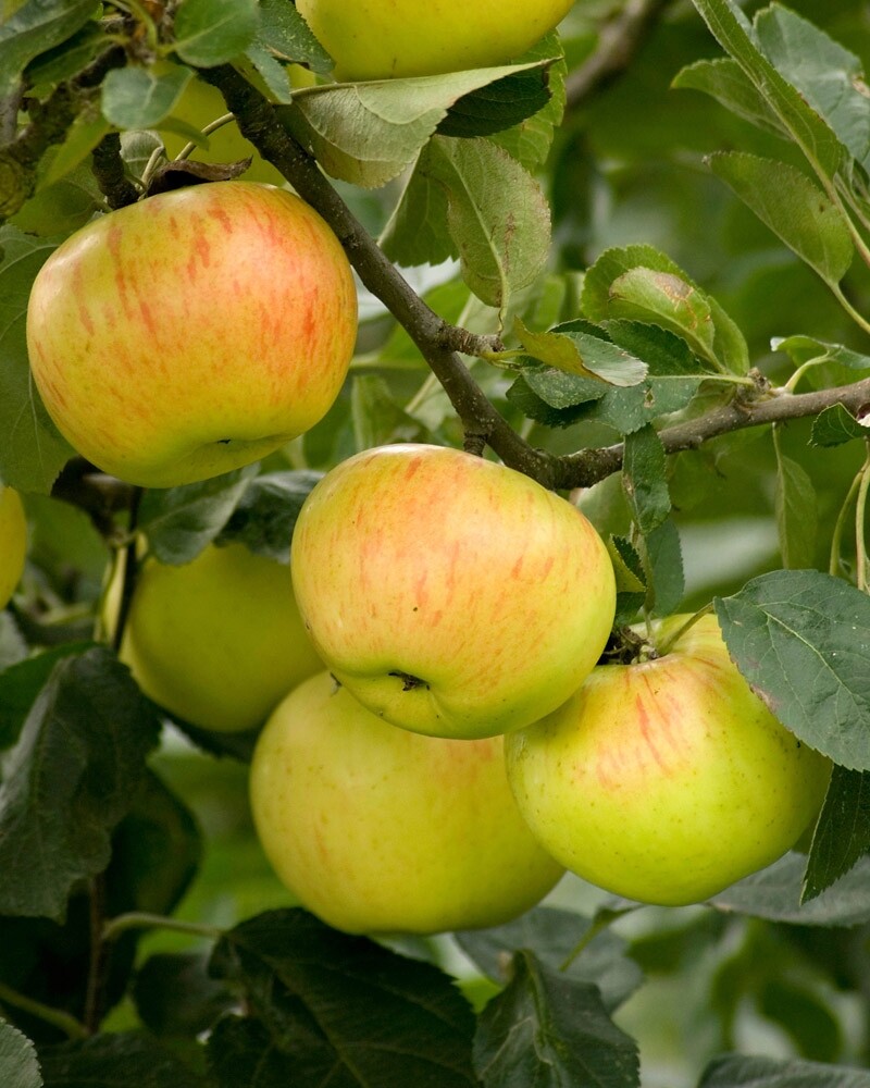 Originally an old Russian variety from the 1850s ( Koritshnoje Polosatoje). Yellow color variant of cinnamon varieties. The fruit is yellow, with red stripes, with a strong cinnamon flavor. Durable and healthy, late and abundant harvester, good pollinator. An excellent organic variety.