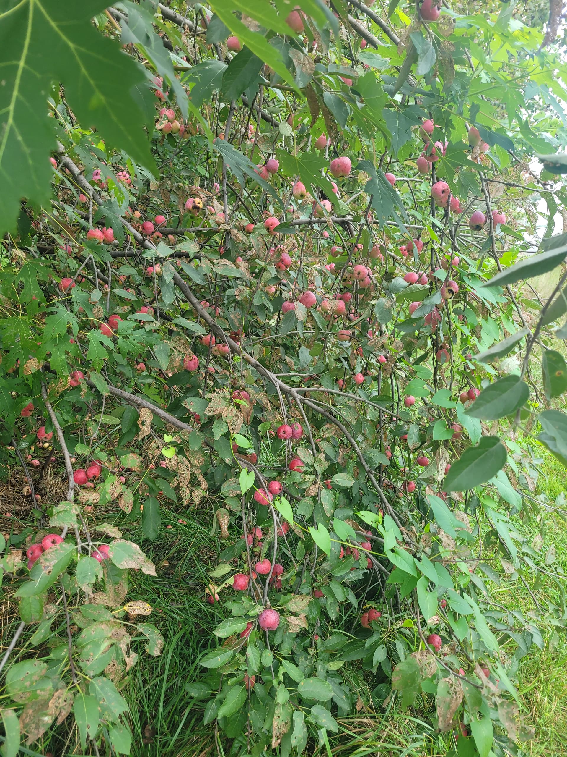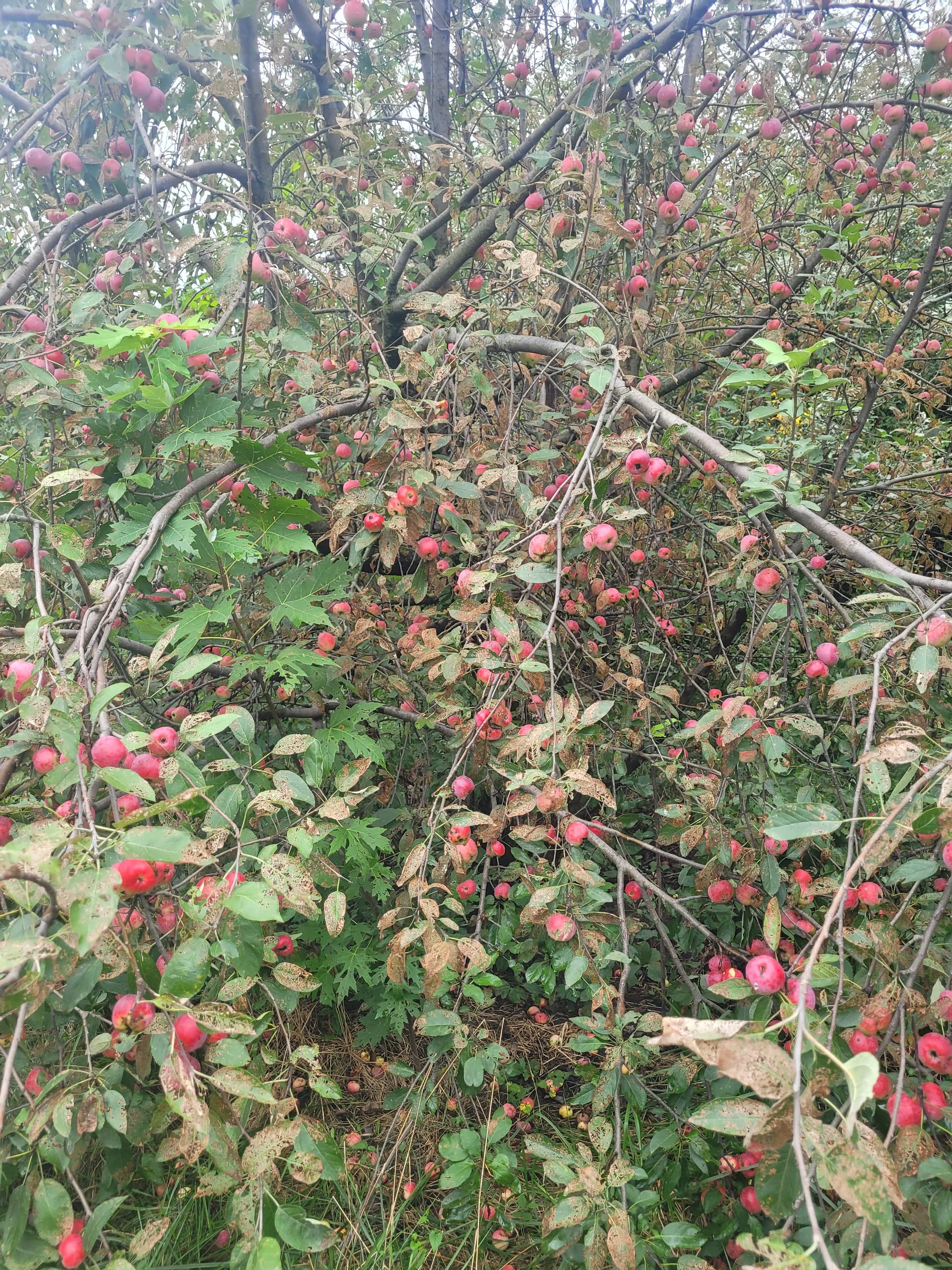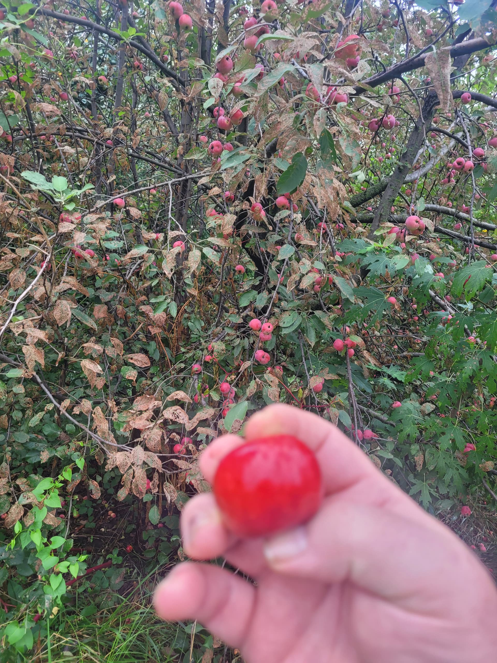 ‘Clark’s Crab’ is still looking a ways off from ripe here in Western Washington. I’ve actually got a large in ground (top worked a wild crab) that is carrying a crop, and also an own-root tree still growing in a pot that is also carrying a crop. There are actually way too many apples on the potted specimen so they are considerably smaller compared to those on the in ground tree, but I can’t thin them because I want as many seeds as possible from the potted specimen which was mostly pollinated by ‘Pendragon’ (a precocious, red fleshed apple).