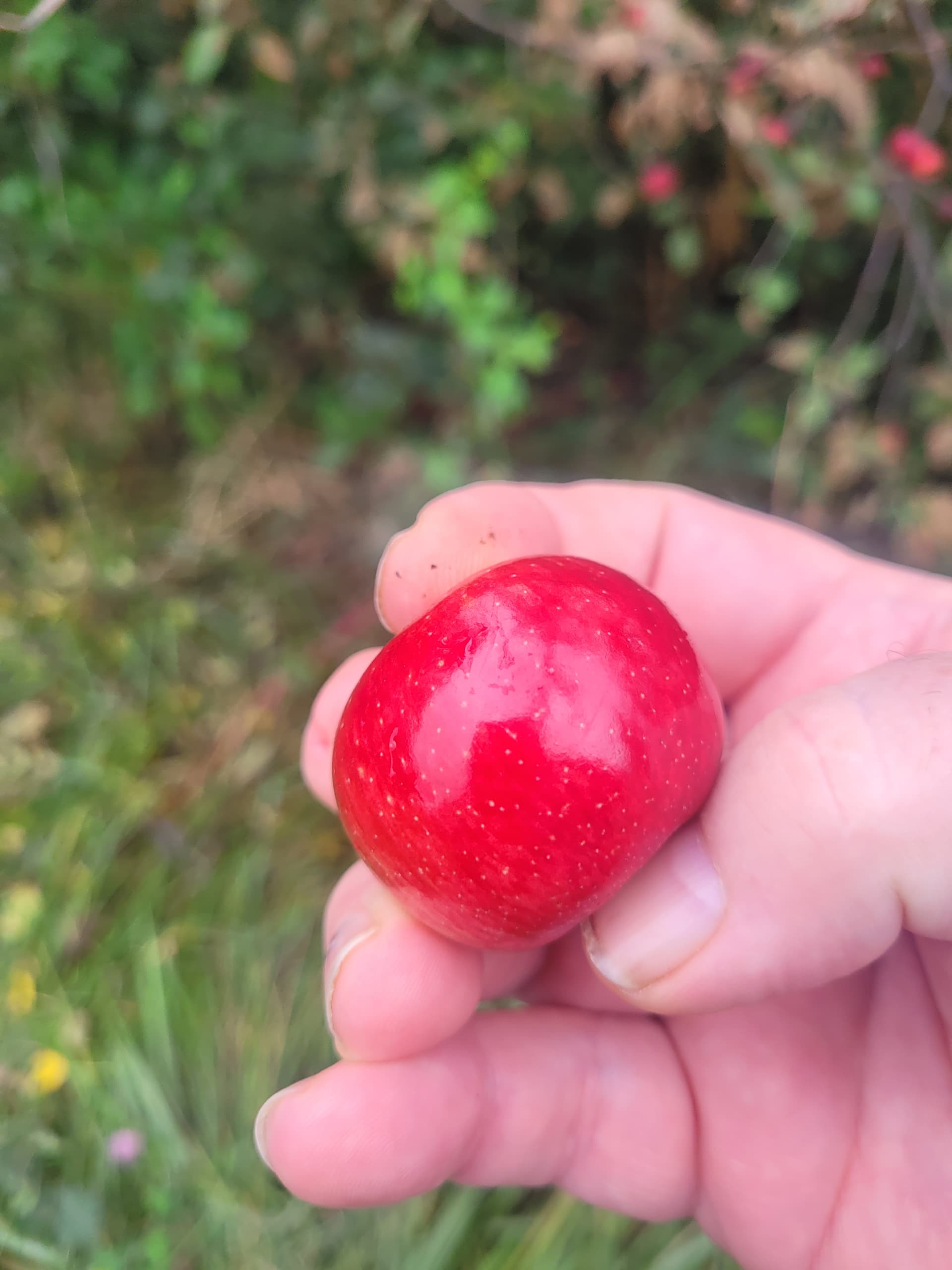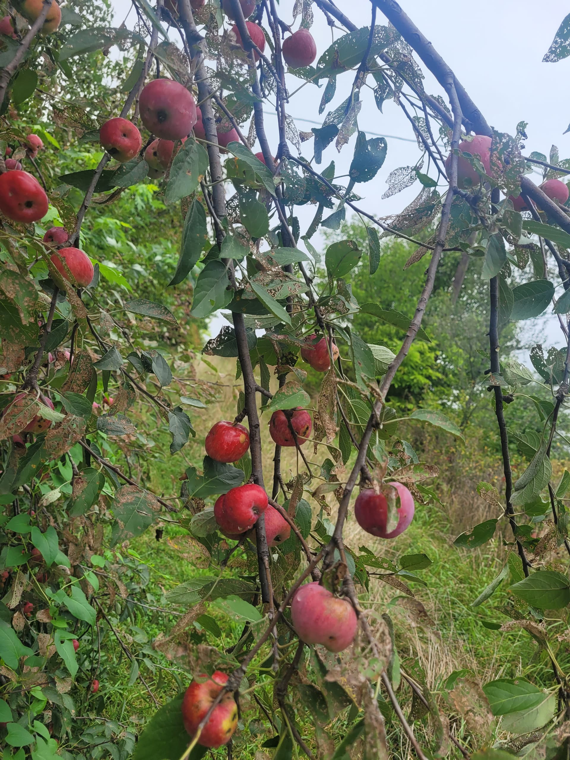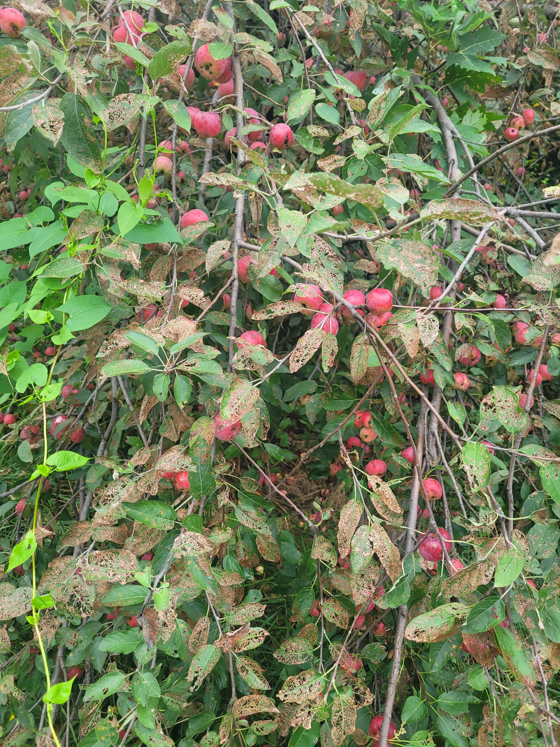 ‘Clark’s Crab’ is still looking a ways off from ripe here in Western Washington. I’ve actually got a large in ground (top worked a wild crab) that is carrying a crop, and also an own-root tree still growing in a pot that is also carrying a crop. There are actually way too many apples on the potted specimen so they are considerably smaller compared to those on the in ground tree, but I can’t thin them because I want as many seeds as possible from the potted specimen which was mostly pollinated by ‘Pendragon’ (a precocious, red fleshed apple).