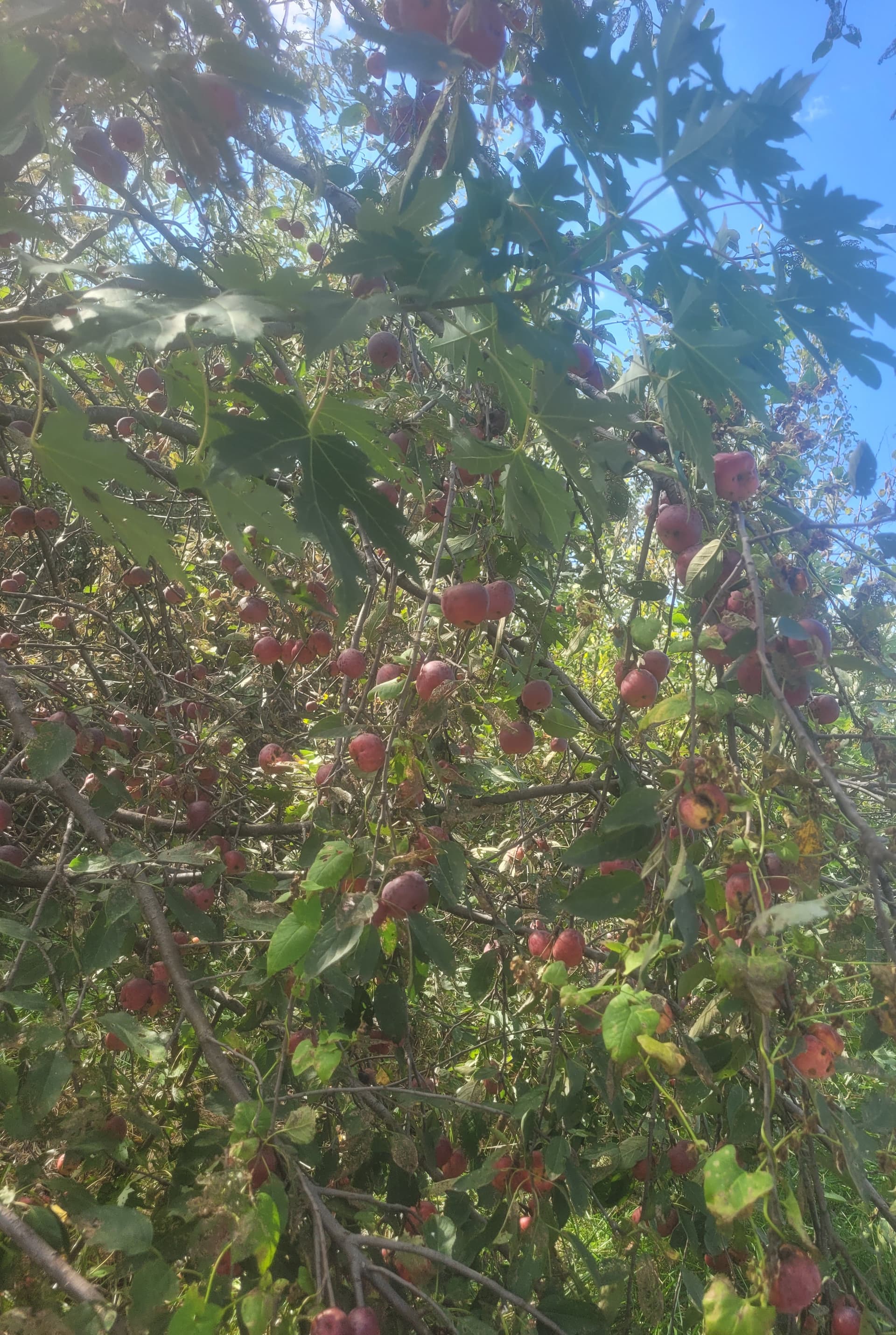 Just about the same size as its sibling clarks crabapple my red crabapple is loaded and the fruit is mostly blemish free. It is not growing in clusters like clarks crabapple. It has very deep red fruits. It is October 15th and still could use some hang time.