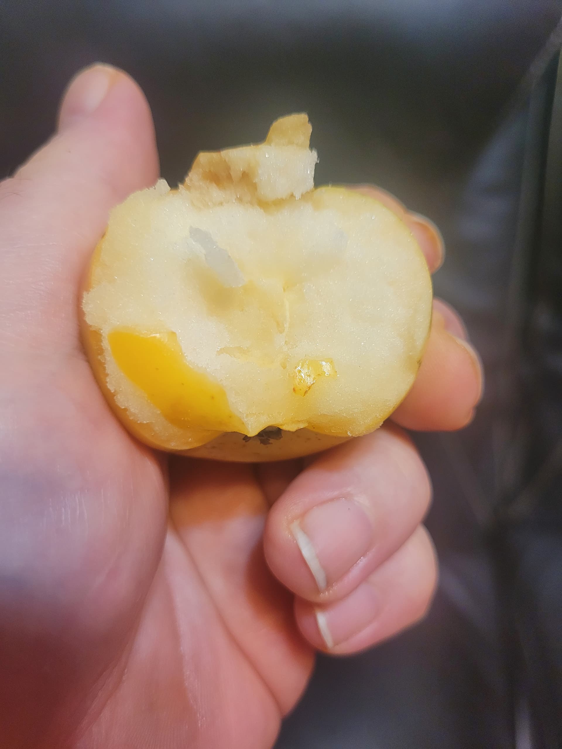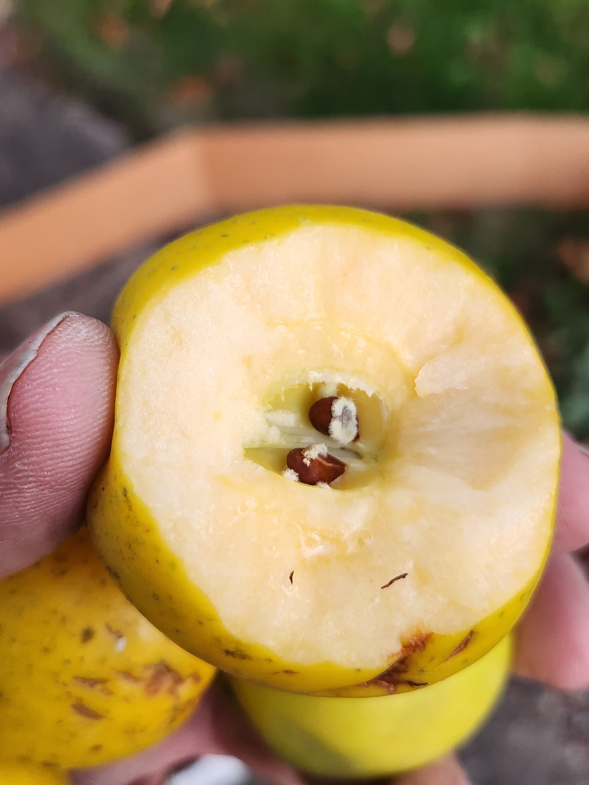 The single sample this year was so large, I wonder if this is the real deal. My Better half & I tried it today (5 Dec.) I am hugely impressed: hard and crisp, juicy, 14 blunt, caramel colored seeds; 13 Brix; 2 3/4" tall by 3" wide, flavor suggesting Jonathan but skin easy to handle. This one ripened inside a “yoga pant” pocket/bag tied over the stem with a wire twist. No codling moth damage; 3 San José scale spots. No blush to skin due to the covering until harvest.