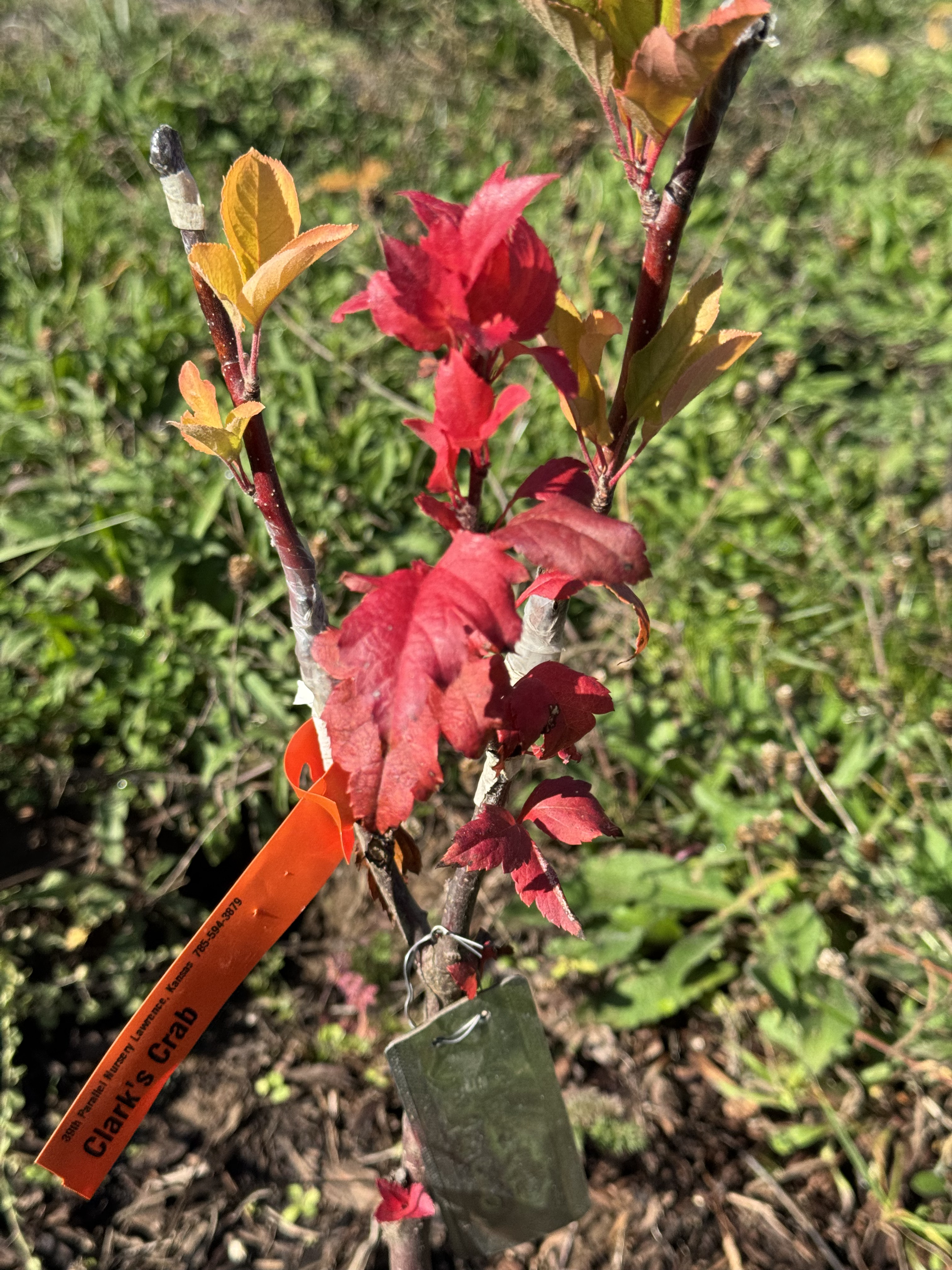 A tiny Clark’s crab grafted onto pacific crab. Deer ate off a lot of the scion leaves when someone left the gate open, but it grew some new leaves. I thought the contrast of Clark’s fall color against the pacific crab was nice.