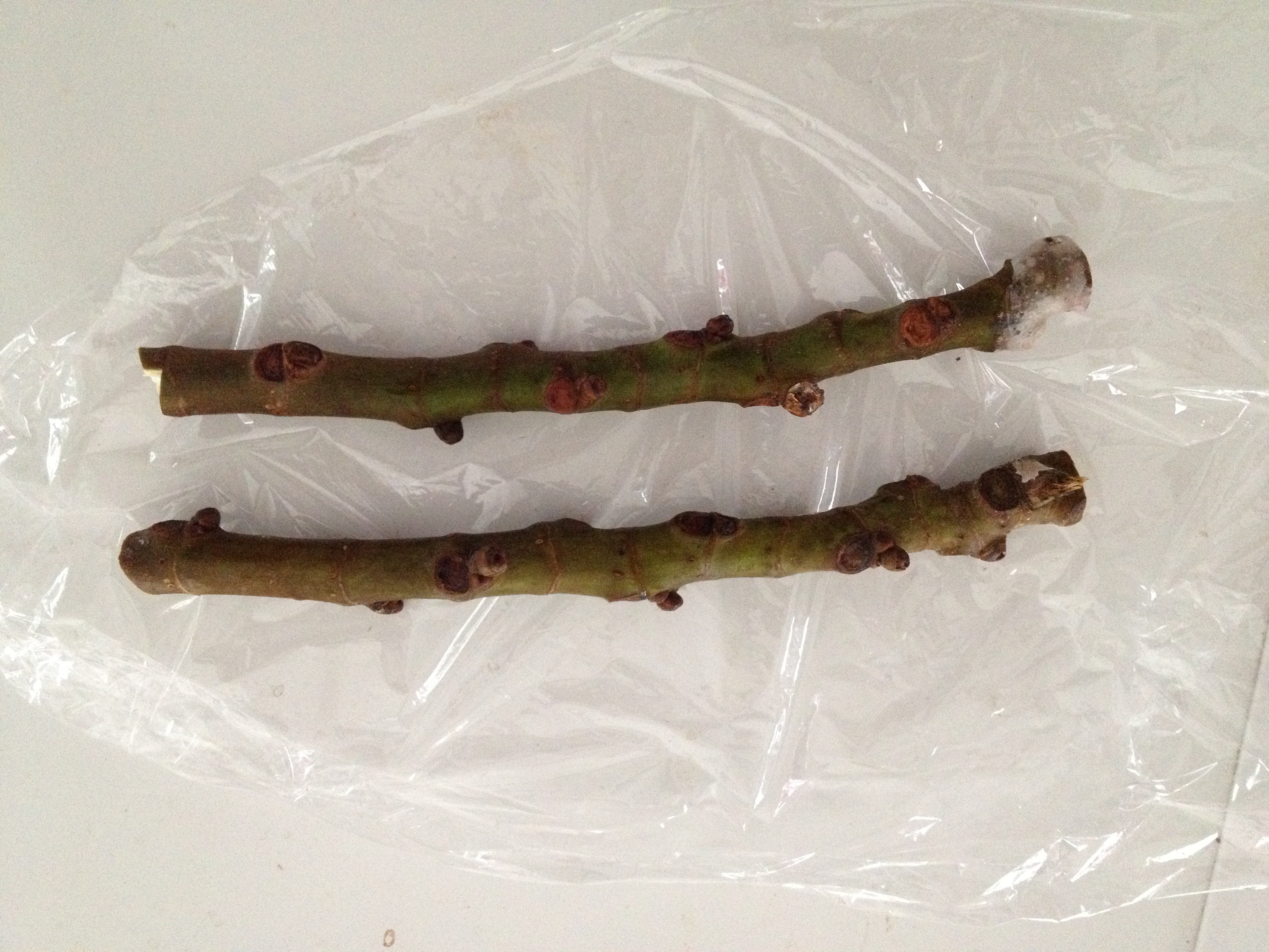 My Black Madeira cuttings came today. They were shipped really nice. They had their ends dipped in wax then raped in tin foil. They cut cardboard to the exact size of the two cuttings and taped it together like a box. It looked like a cigar pack almost. At first I thought they had mold on the ends. I smelt them and it smelt like pineapple banana orange juice. I went to wash them off right away and then realized it was wax. I’m putting them in the basement by the furnace were it’s warm. I’m using tupperware and leaving the lid cracked open. I used fresh snow to moisten the sphagnum moss.
