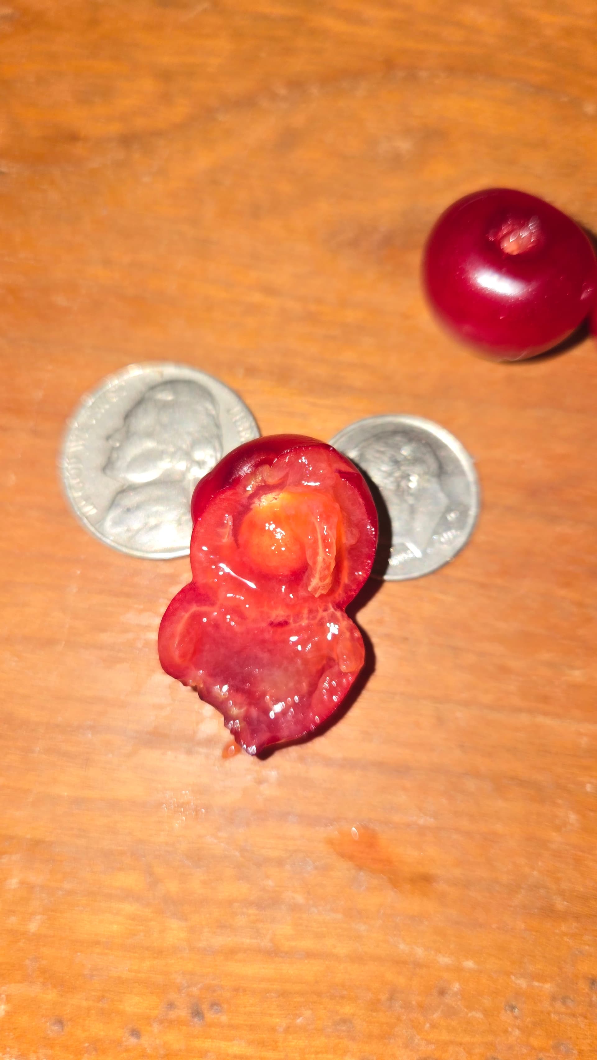 They are a bit firmer than my Montmorency cherries, and about half the size of the Montmorency. Flesh is sort of darker pink, not yellow like a Montmorency.