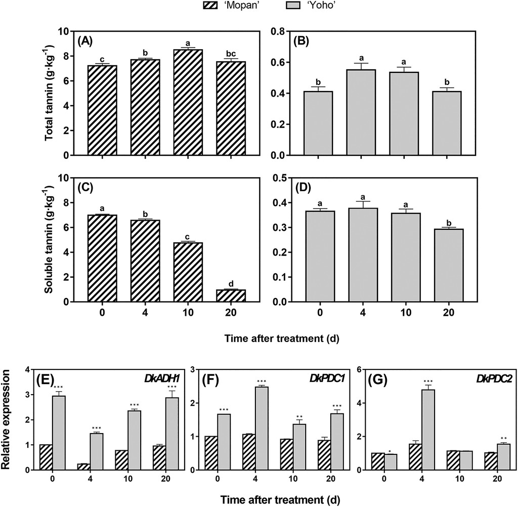 Revised Claim B — In PCNA fruit, ADH/PDC transcripts can be induced during ripening , but they do not drive de-astringency because the soluble-tannin pool is already minimal from early developmental shutdown; consequently, tannin levels remain low and stable through ripening (e.g., ‘Yoho’).