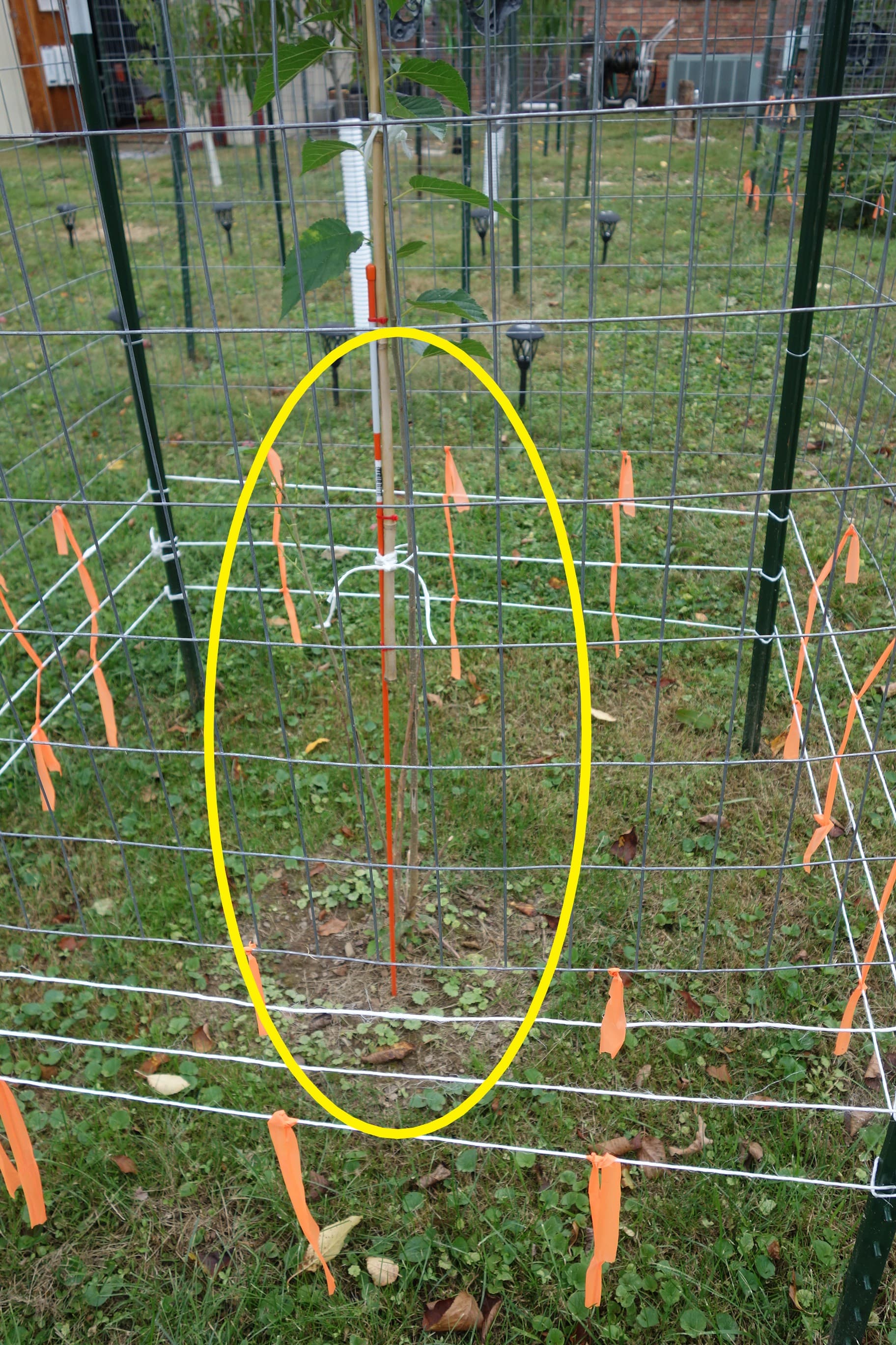 Here is a dwarf mulberry. It was growing great. Then deer started to eat it under the high fence height. Instead of redoing the fence to 48" and lowering it, I tried string and flagging tape. The deer just stick their head between the string and stripped it all down as far as they could reach under the fence.