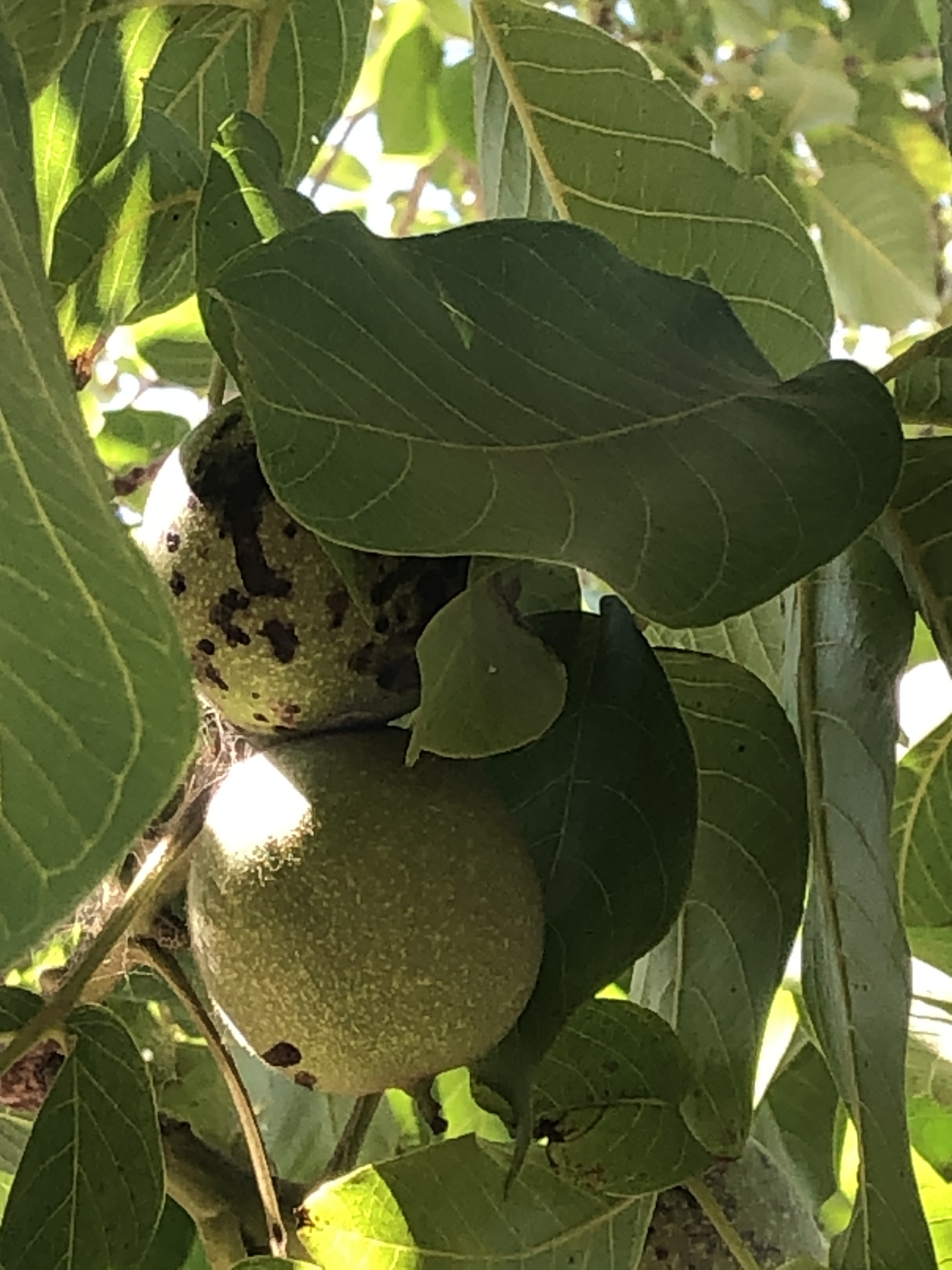 A plastic tarp spread under the tree at this time of year will help prevent the larvae from burrowing into the soil to pupate. Any fallen fruit and husks should be picked up and sent to the landfill or municipal green waste, not composted onsite. These two methods will help reduce population levels, provided the neighbors don’t have walnuts and there aren’t wild native walnuts around.